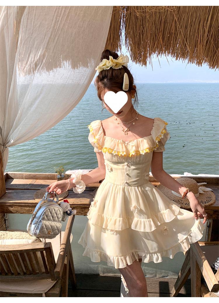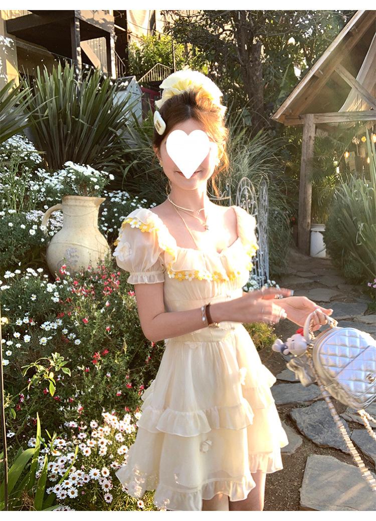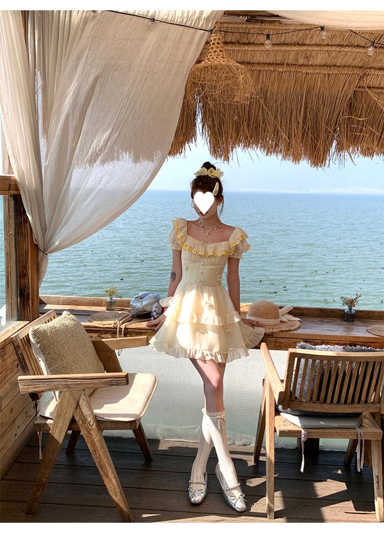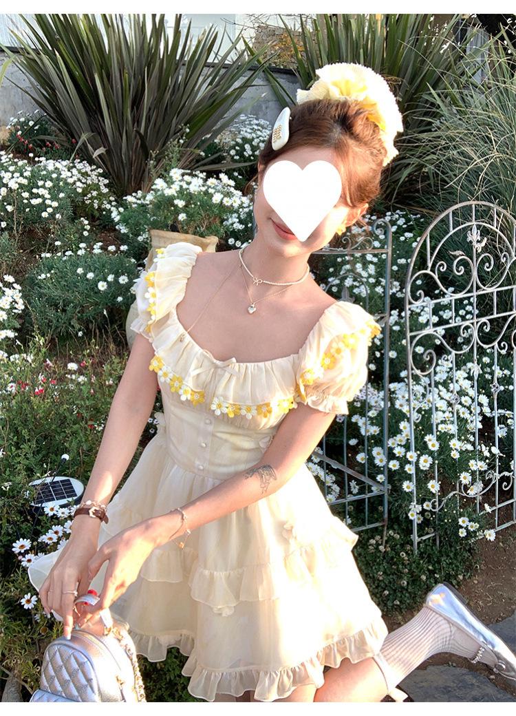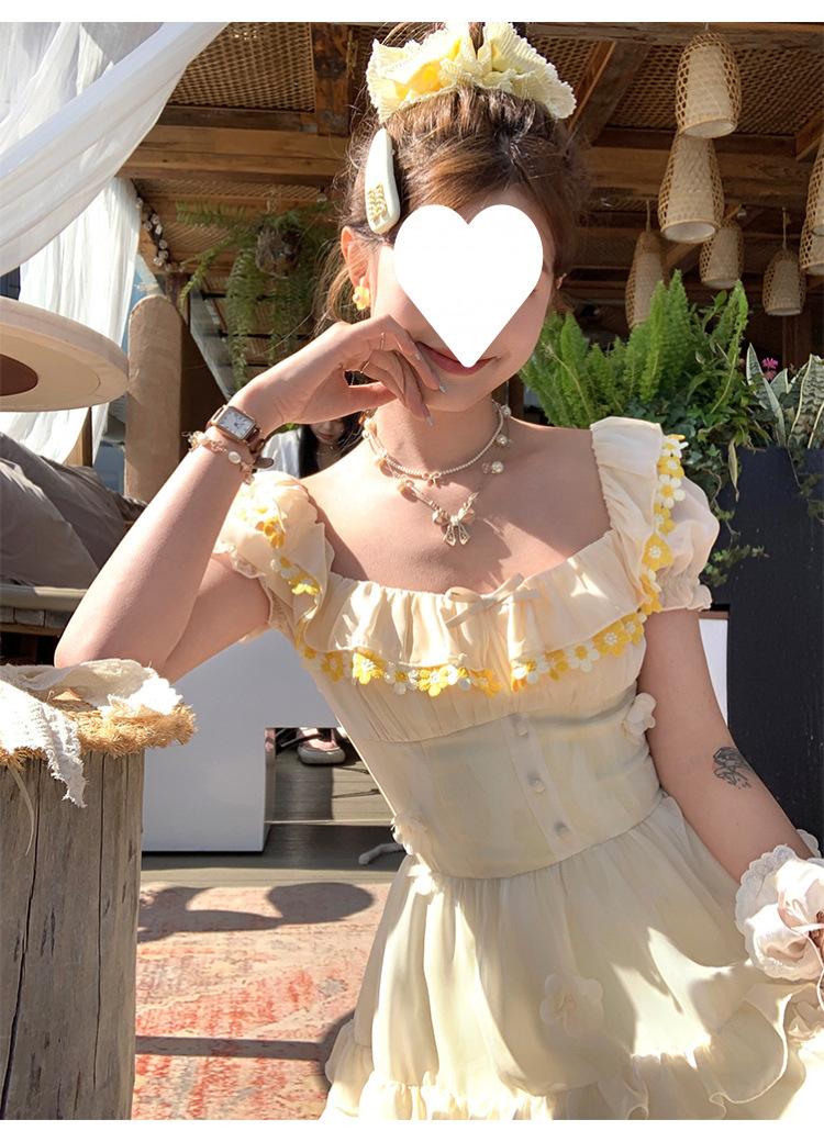 Compra Vestido Midi de Cuello Cuadrado, Manga Corta con Volantes Pequeños, Cintura Chifón, Verano para Mujer, Falda Retro Francesa al por mayor en Joom.pro