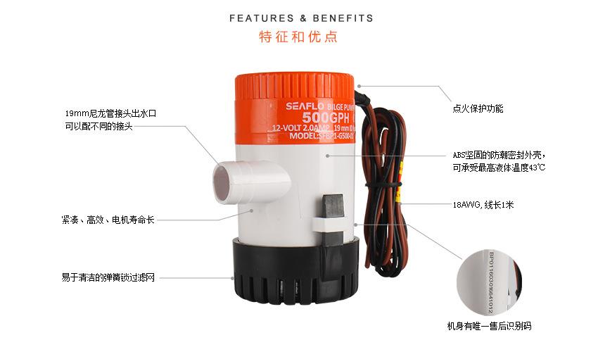 | SFBP1-G350-01(13.6 V) | 350 GPH | 13.6 V | 2.0 A | 2.0 A | 1,2 metros | 1 metro | 19 mm/3/4" | 0.33/0.40 kg |