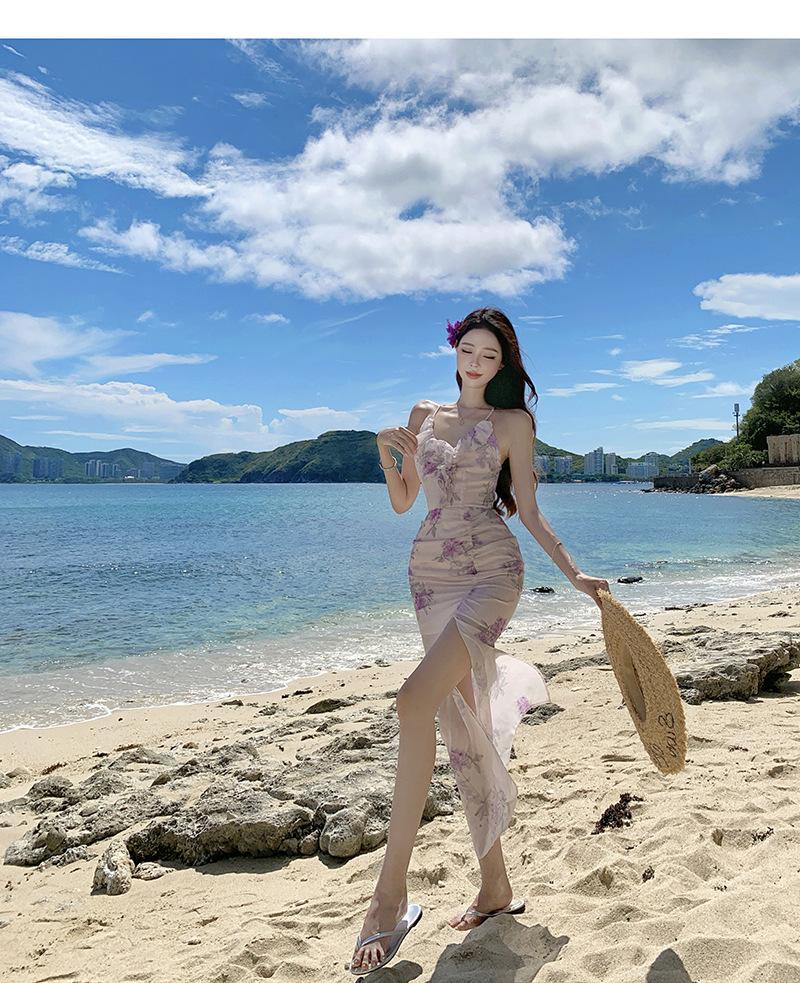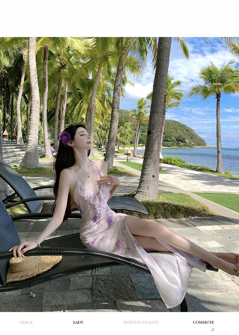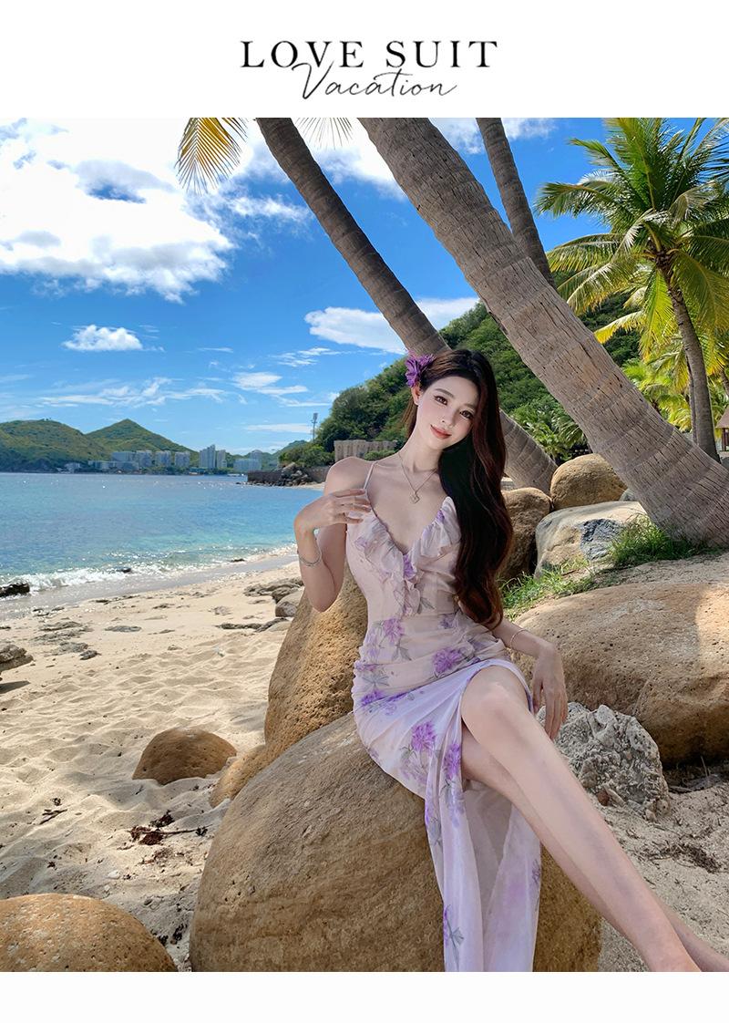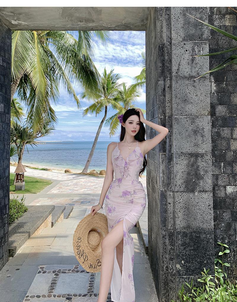 Ambiente Francés Estilo Vacacional Dulce y Picante Abertura Alta Falda Midi Cubrecaderas Adelgazante de Cintura Vestido Floral de Chifón para Mujer