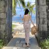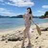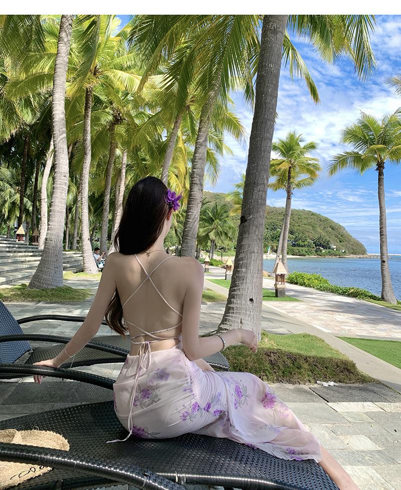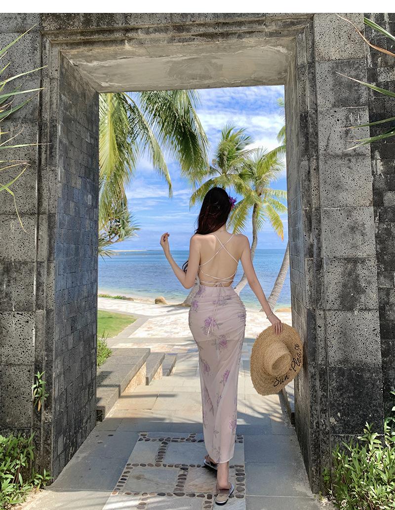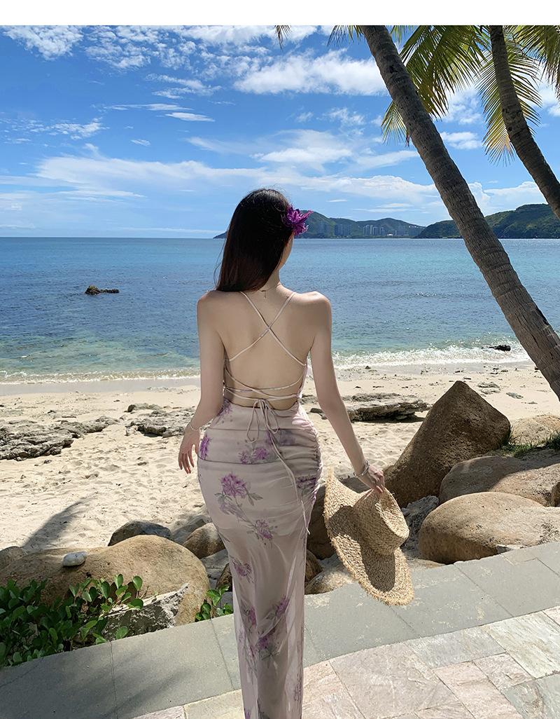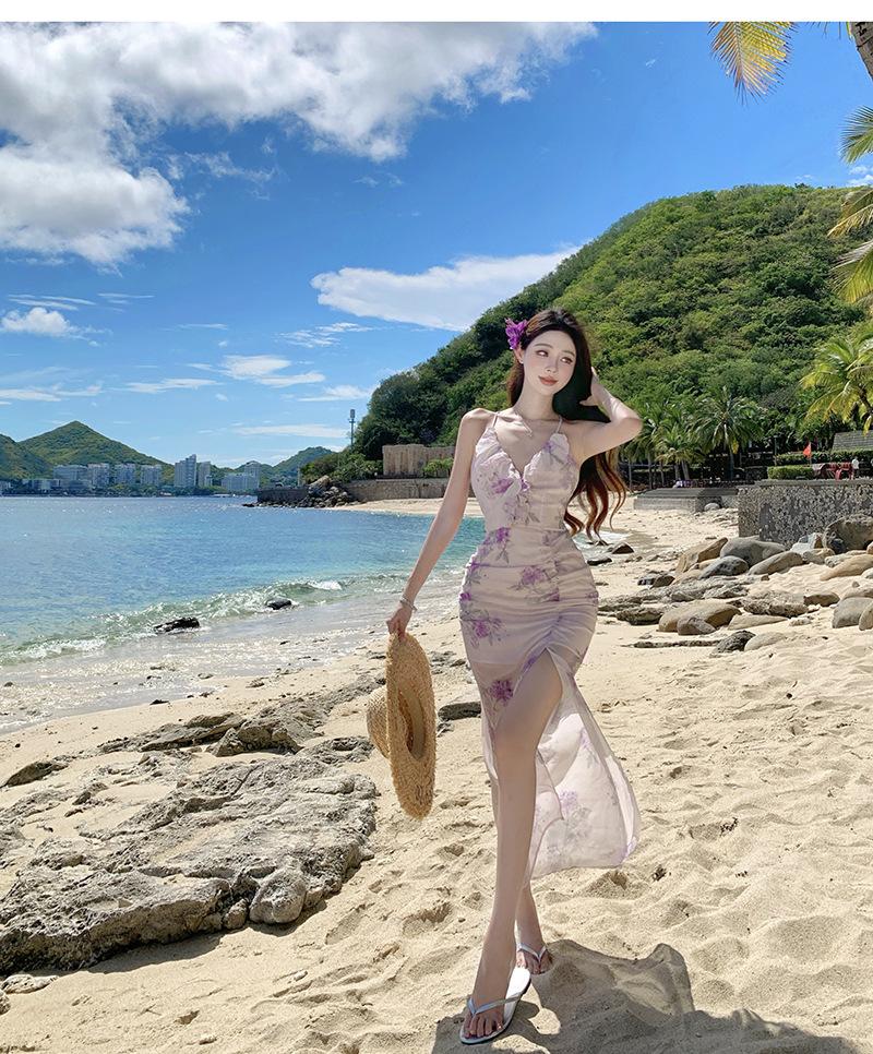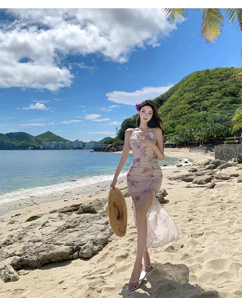Ambiente Francés Estilo Vacacional Dulce y Picante Abertura Alta Falda Midi Cubrecaderas Adelgazante de Cintura Vestido Floral de Chifón para Mujer