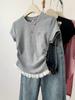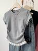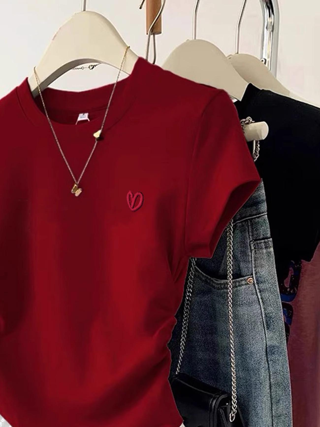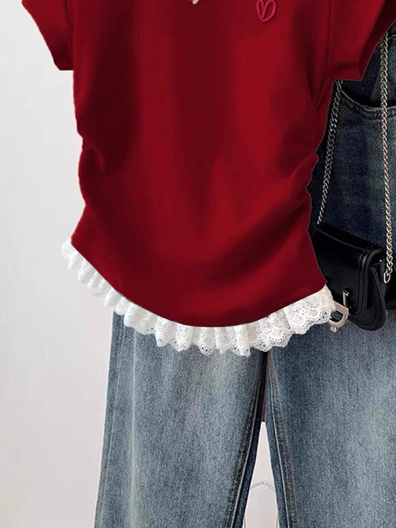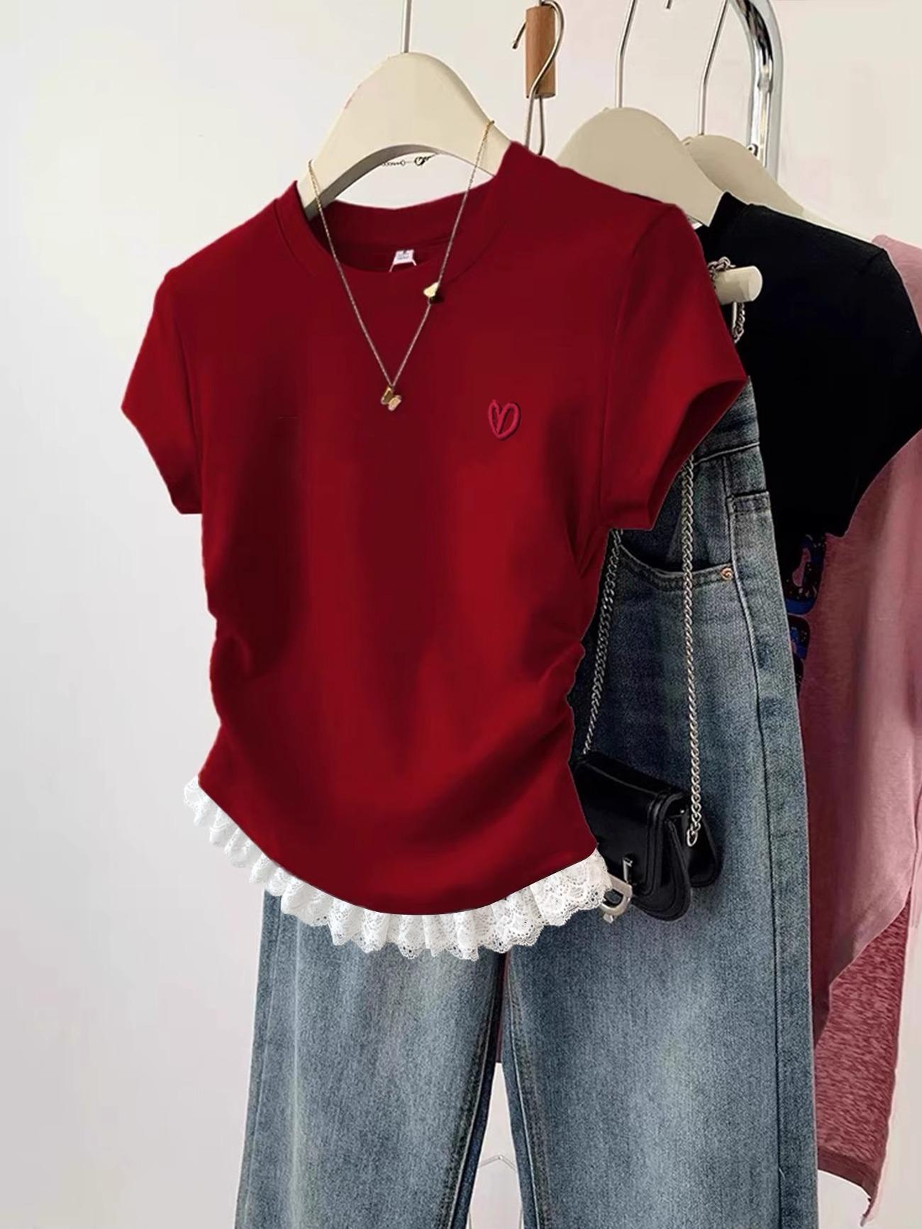 Compra Camiseta Roja de Encaje de Manga Corta para Mujer Verano 2025 Nuevo Diseño de Verano Sentido Ajustada Hombro Ajustado Cintura Top Pequeño al por mayor en Joom.pro