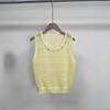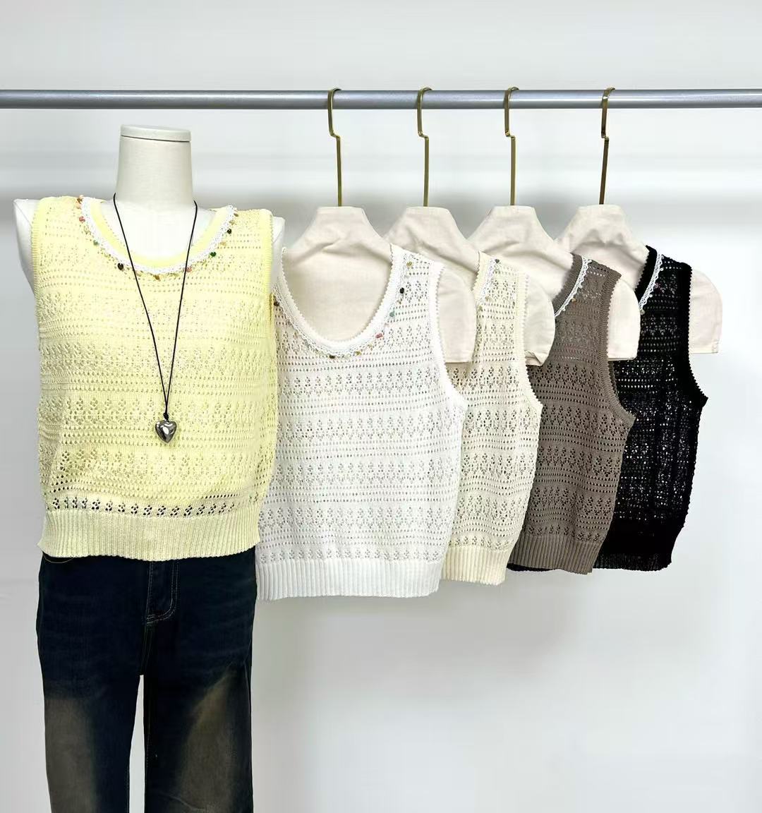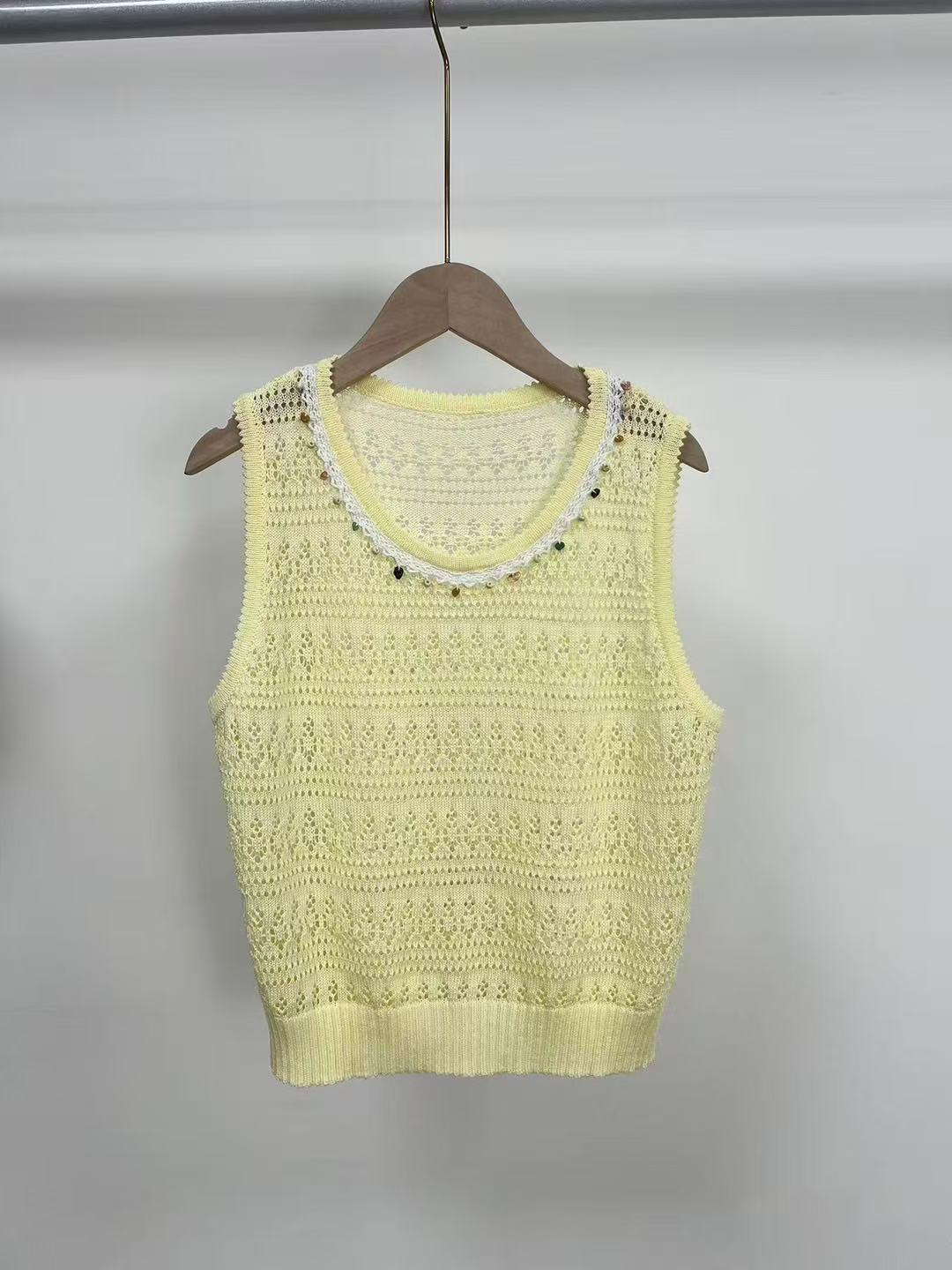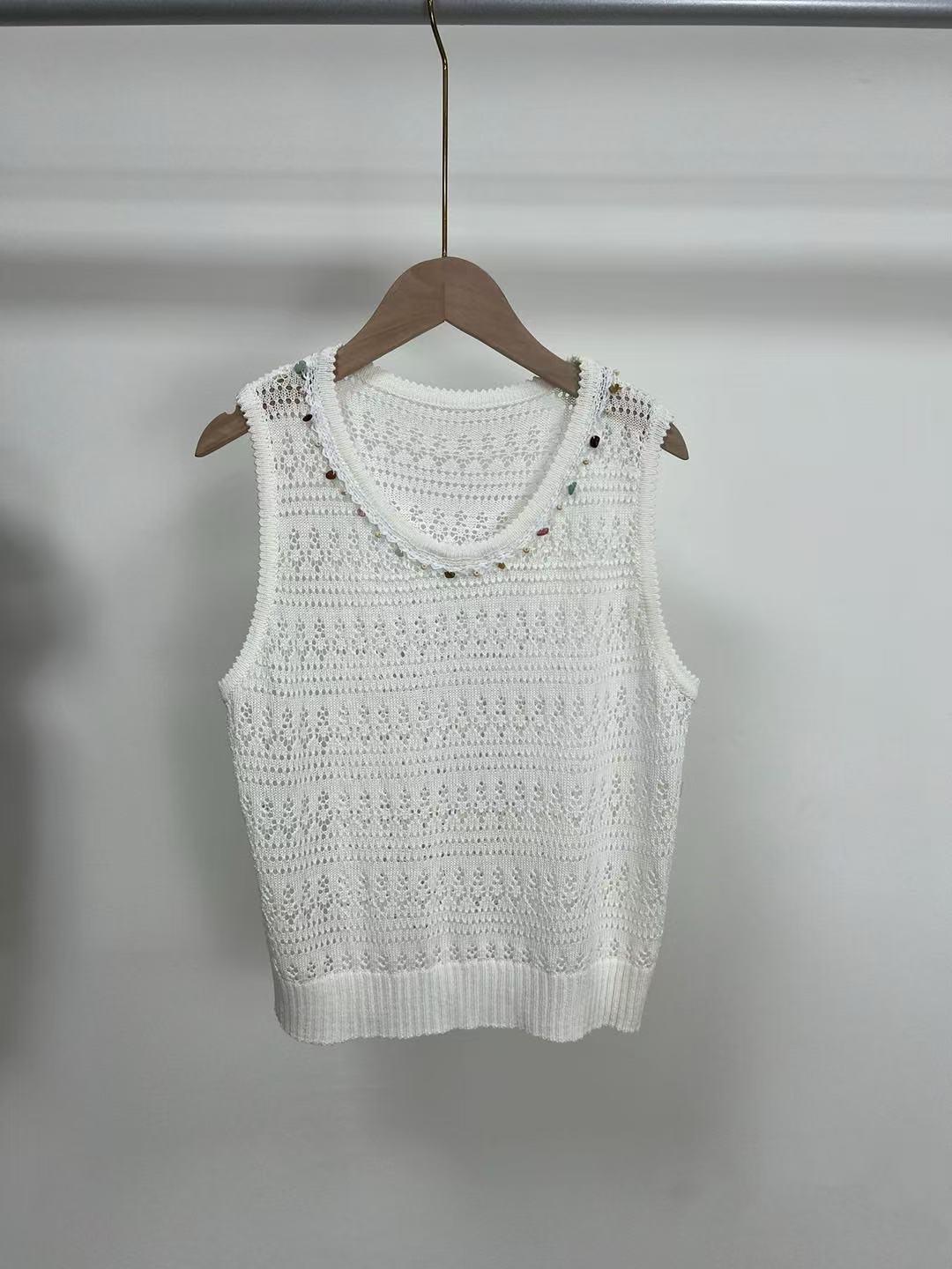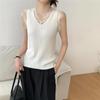 Suéter Chaleco de Crochet de Cuello Redondo Hueco para Mujer Verano 2025 Nuevo Diseño Encaje Empalmado Top sin Mangas