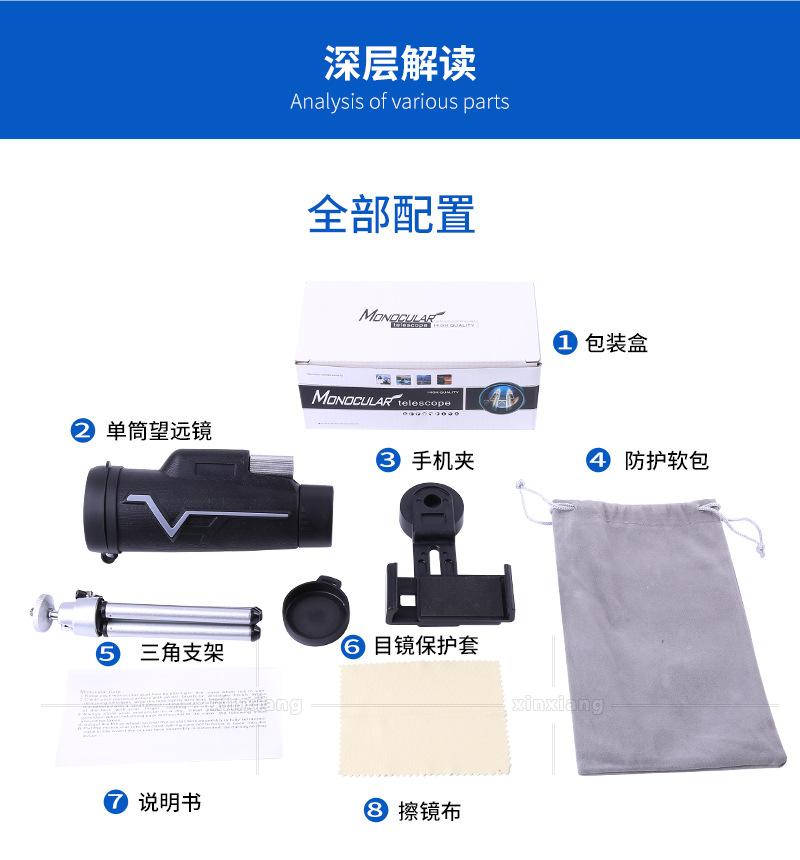 Single telescope (excluding clip and tripod), Telescope + universal mobile phone clip + aluminum alloy tripod