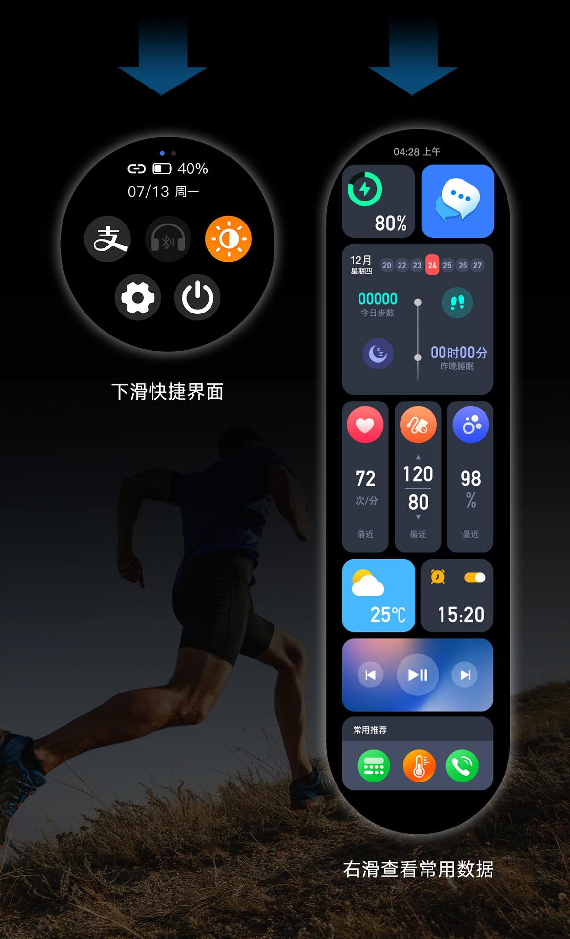 Heart rate monitoring, Blood pressure measurement, Social entertainment, Smart reminder, Remote control selfie...
