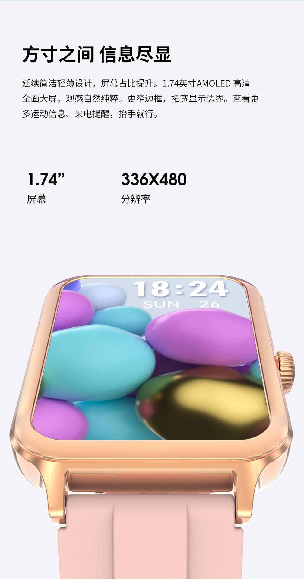 | tamaño de la pantalla | Pantalla AMOLED rectangular de alta definición de 1.74 pulgadas |