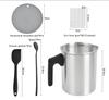 Este juego de herramientas puede satisfacer sus necesidades para hacer sus propias velas. Tarro para velas de 1.2 L: El fundidor de cera para velas de 5 pulgadas de alto y 4.6 pulgadas de diámetro puede contener 42 oz/1200 ml de cera derretida. Este fundidor de cera de doble capa está hecho de aluminio, que puede calentar y enfriar la cera rápidamente. El mango de plástico resistente al calor lo mantiene fresco y seguro durante el calentamiento. La estructura sin costuras de la boquilla antigoteo le permite verter la cera fundida sin derramar fácilmente.