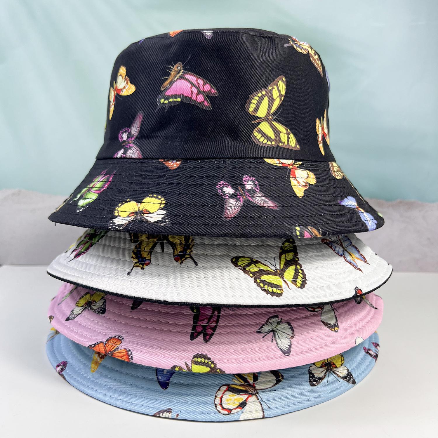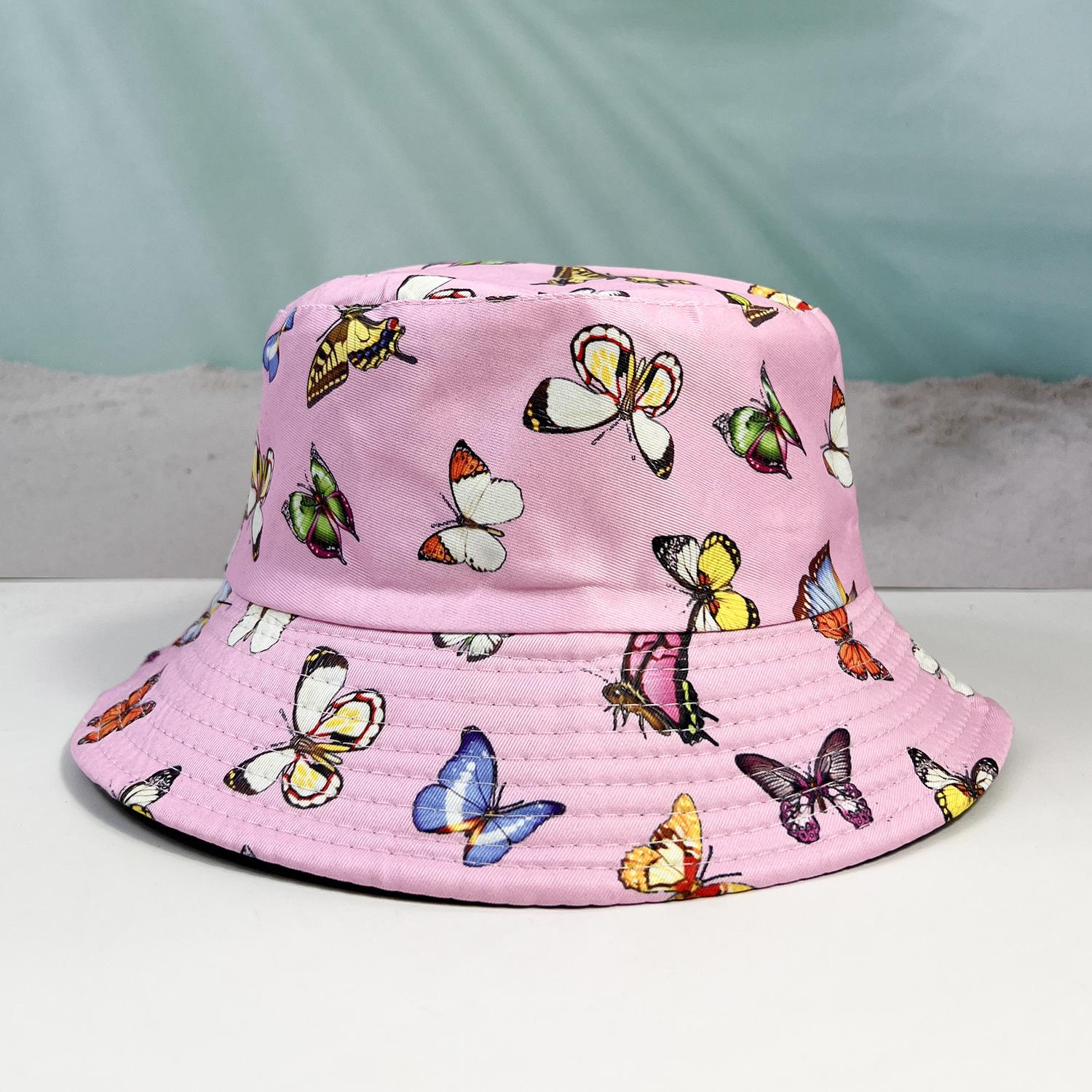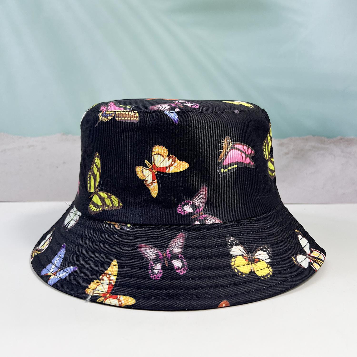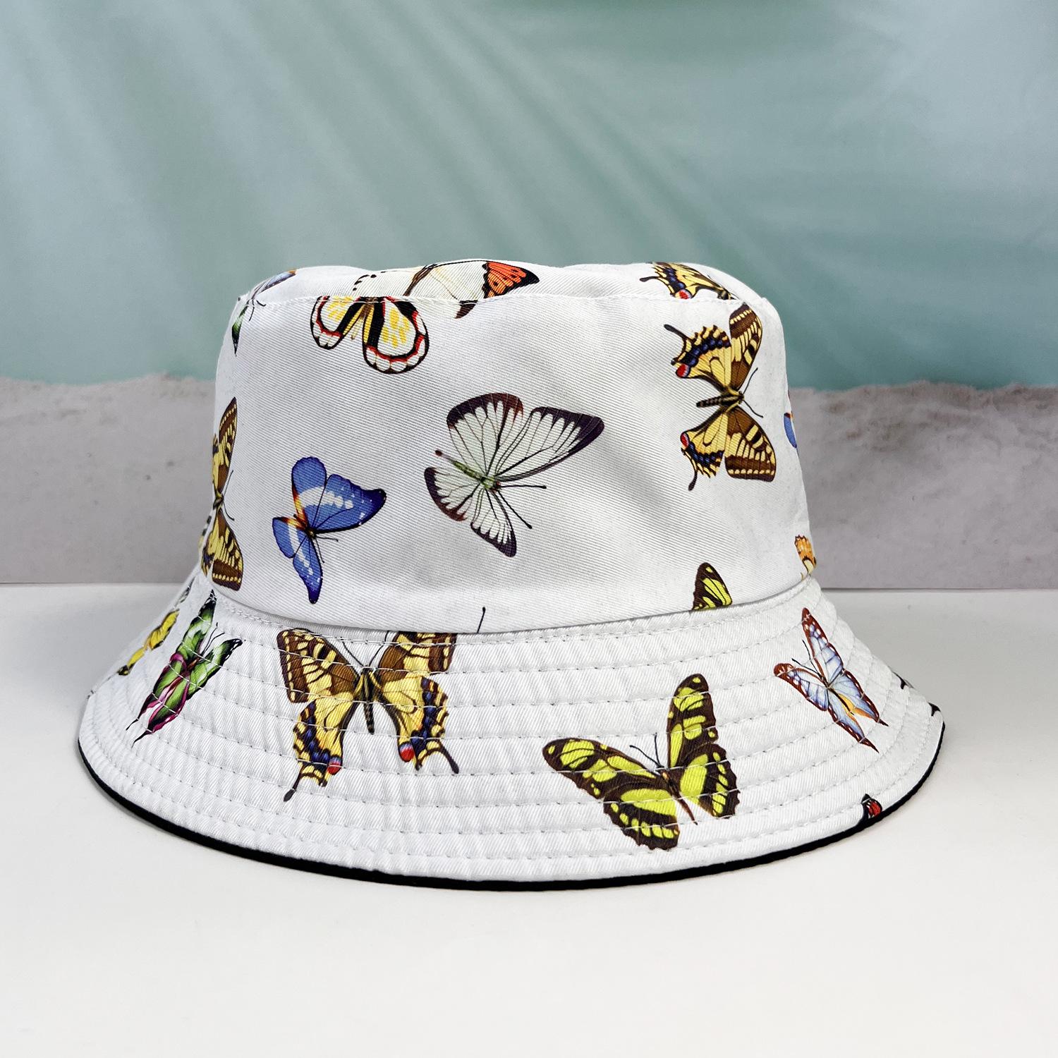 Sombrero de Pescador Casual con Estampado de Mariposas Coloridas Transfronterizo Sombrero de Cubo de Verano para Protección Solar Europeo y Americano Sombrero de Cubo Versátil Reversible
