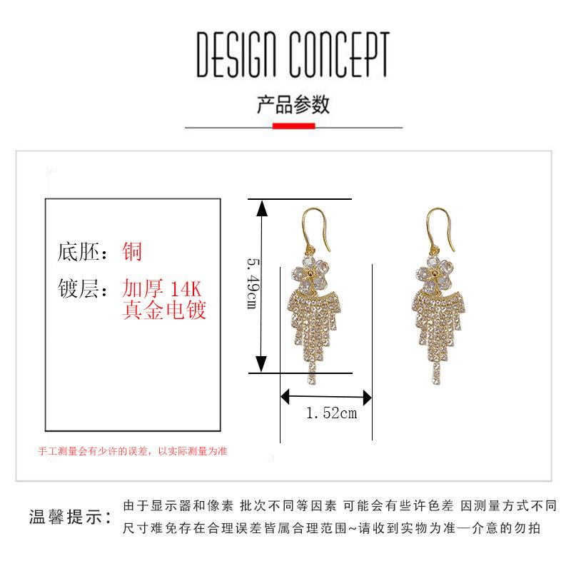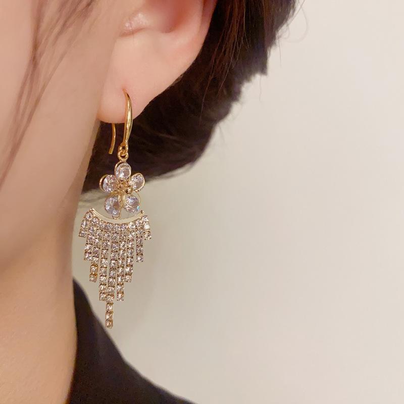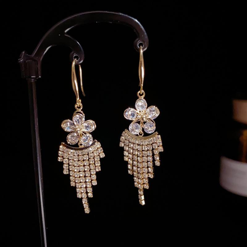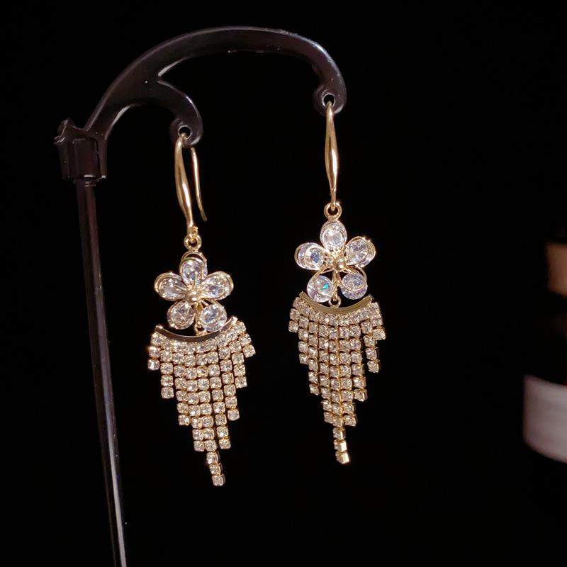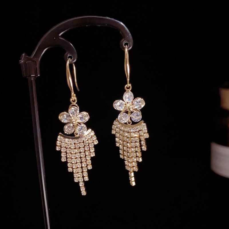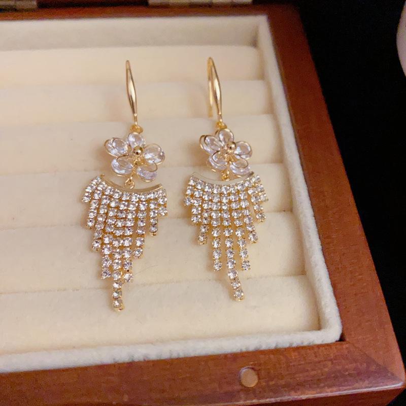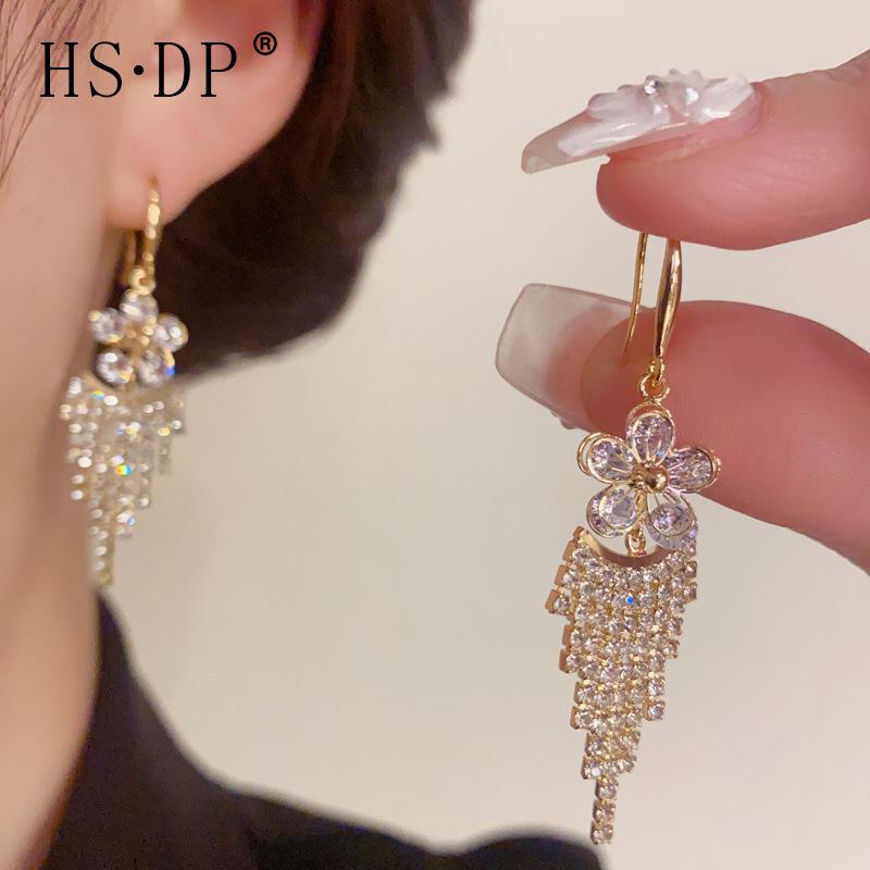 Moda de Lujo Ligero Sentido de Alta Gama Aretes de Borla de Flor de Diamante Completo para Mujer Exquisitos Personalizados Versátiles Diseño Súper Brillante Aretes de Gancho