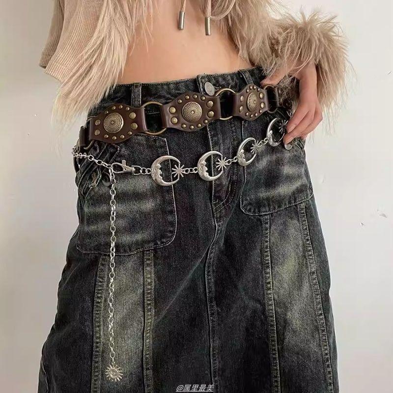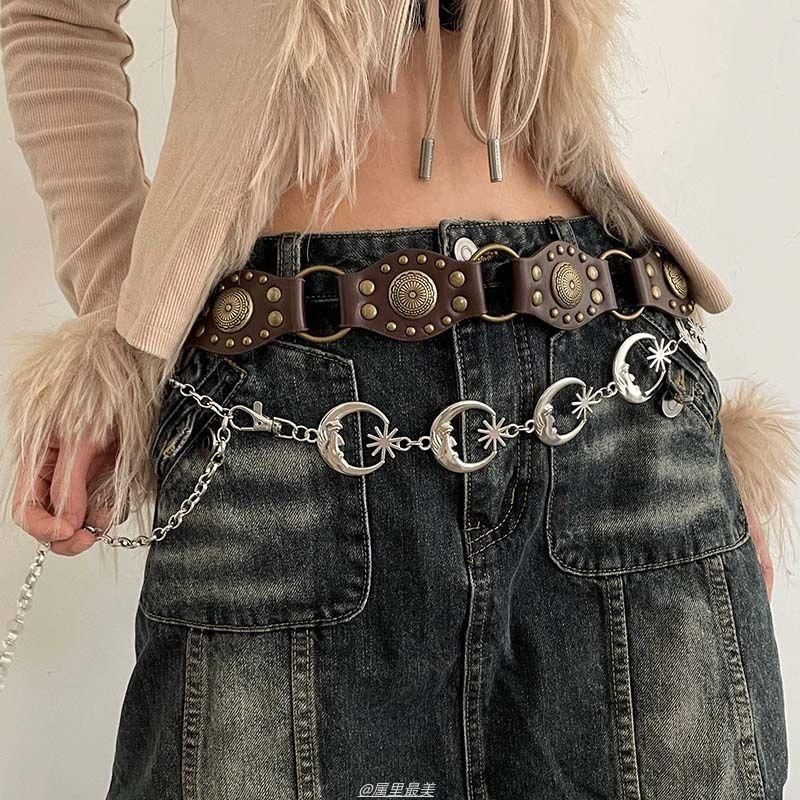 Cinturón Retro Americano para Mujer 2025 Nuevo Estilo Cinturón Marrón con Remaches con Jeans Versión Coreana Versátil Cadena de Cintura Trendy