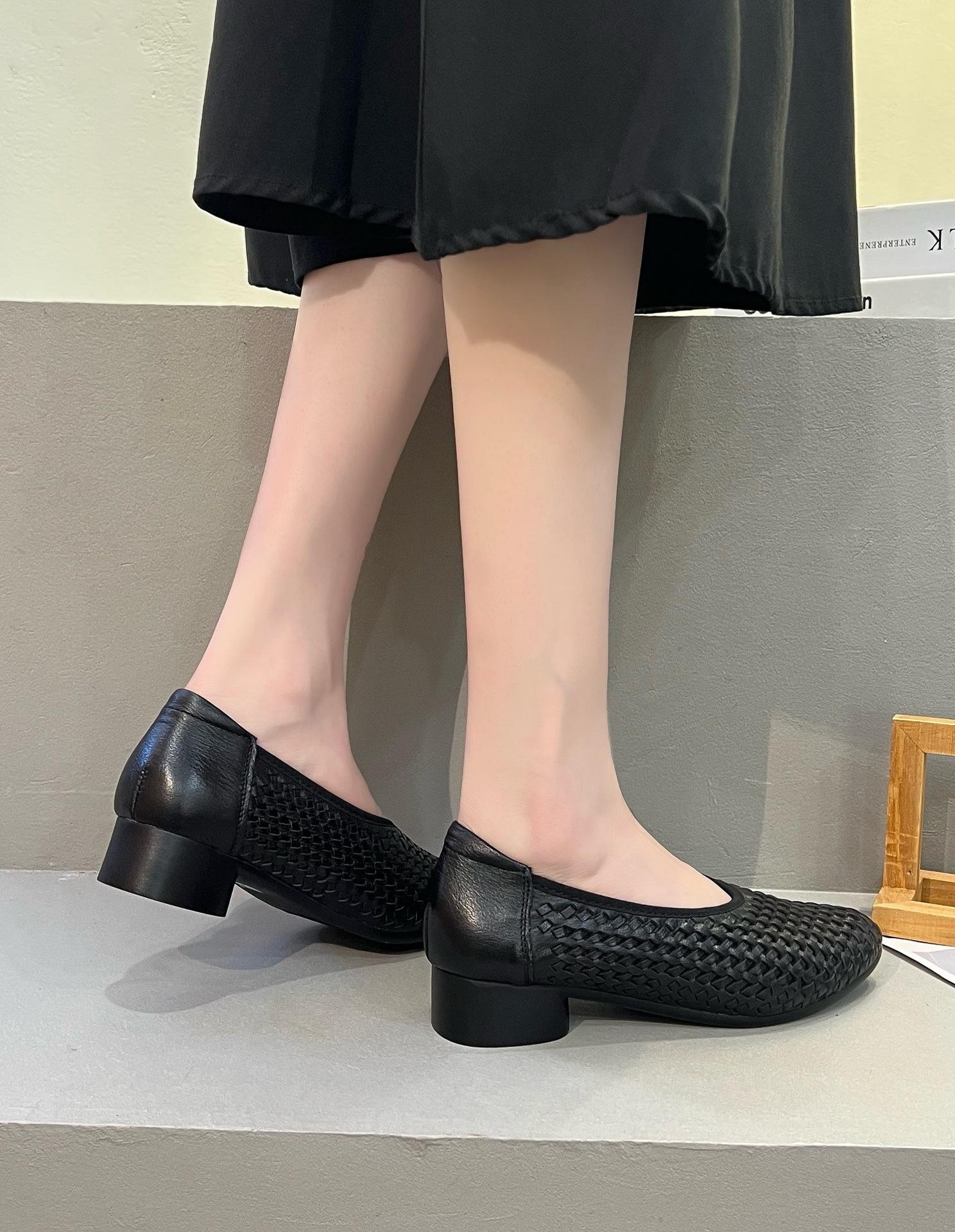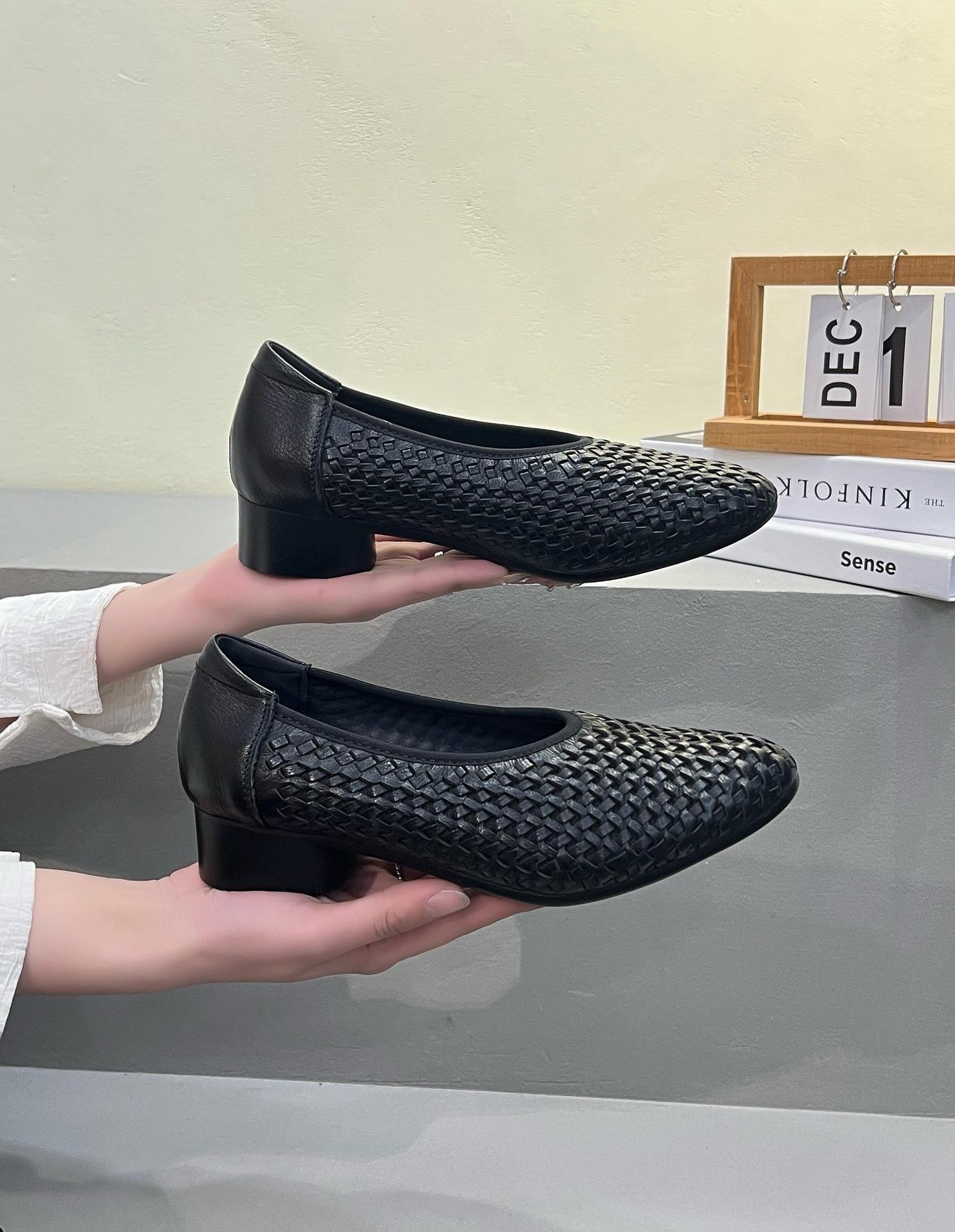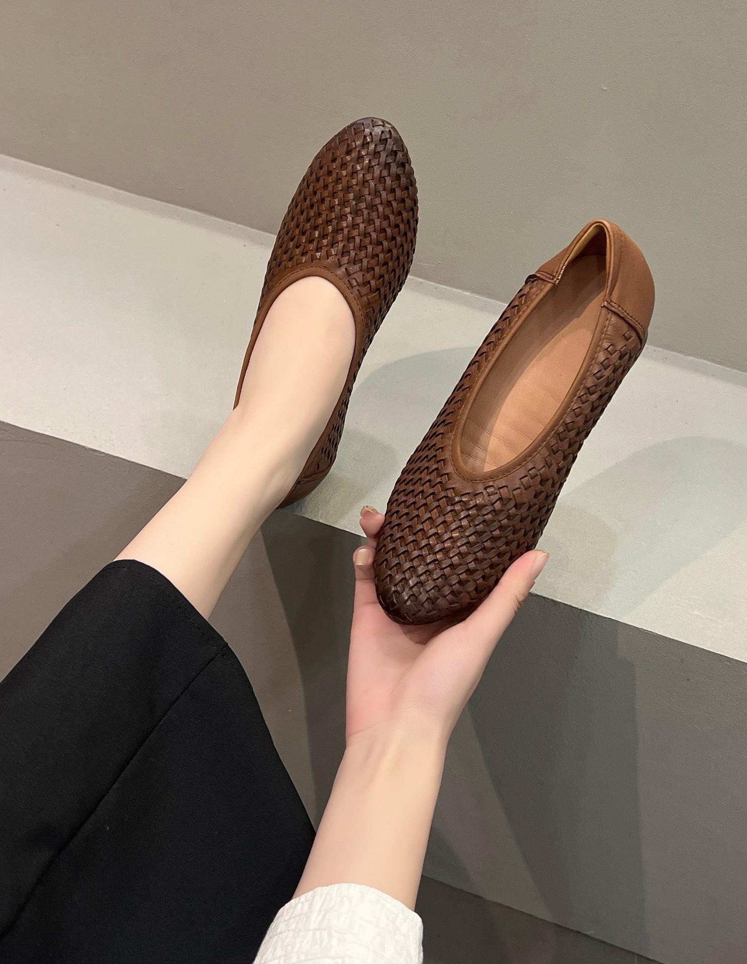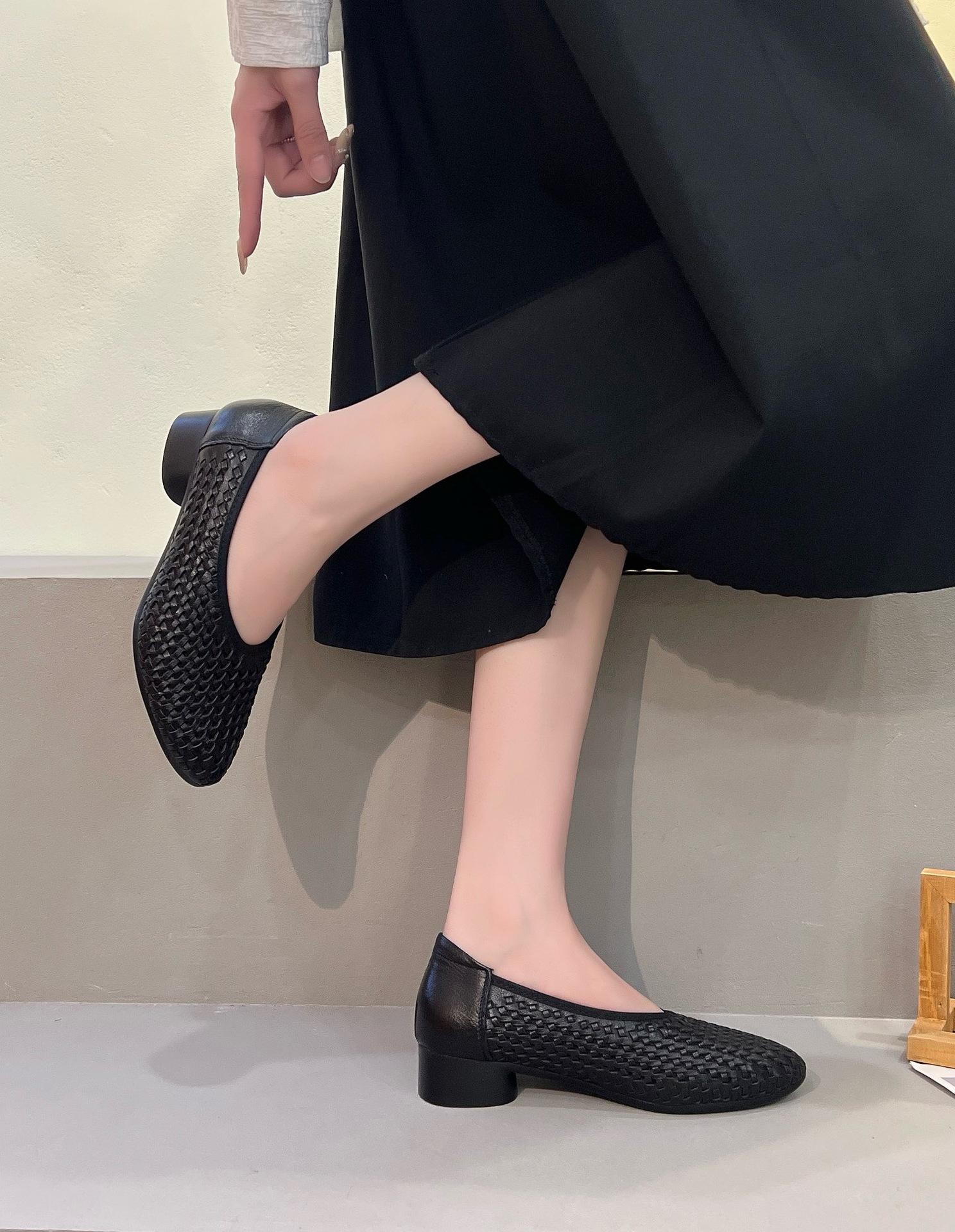 Longlin Retro Francés Tejido a Mano para Mujer 2025 Nuevo Primavera Cuero Genuino Punta Afilada Boca Baja Tacón Bajo Zapatos de Mujer Directo de Fábrica