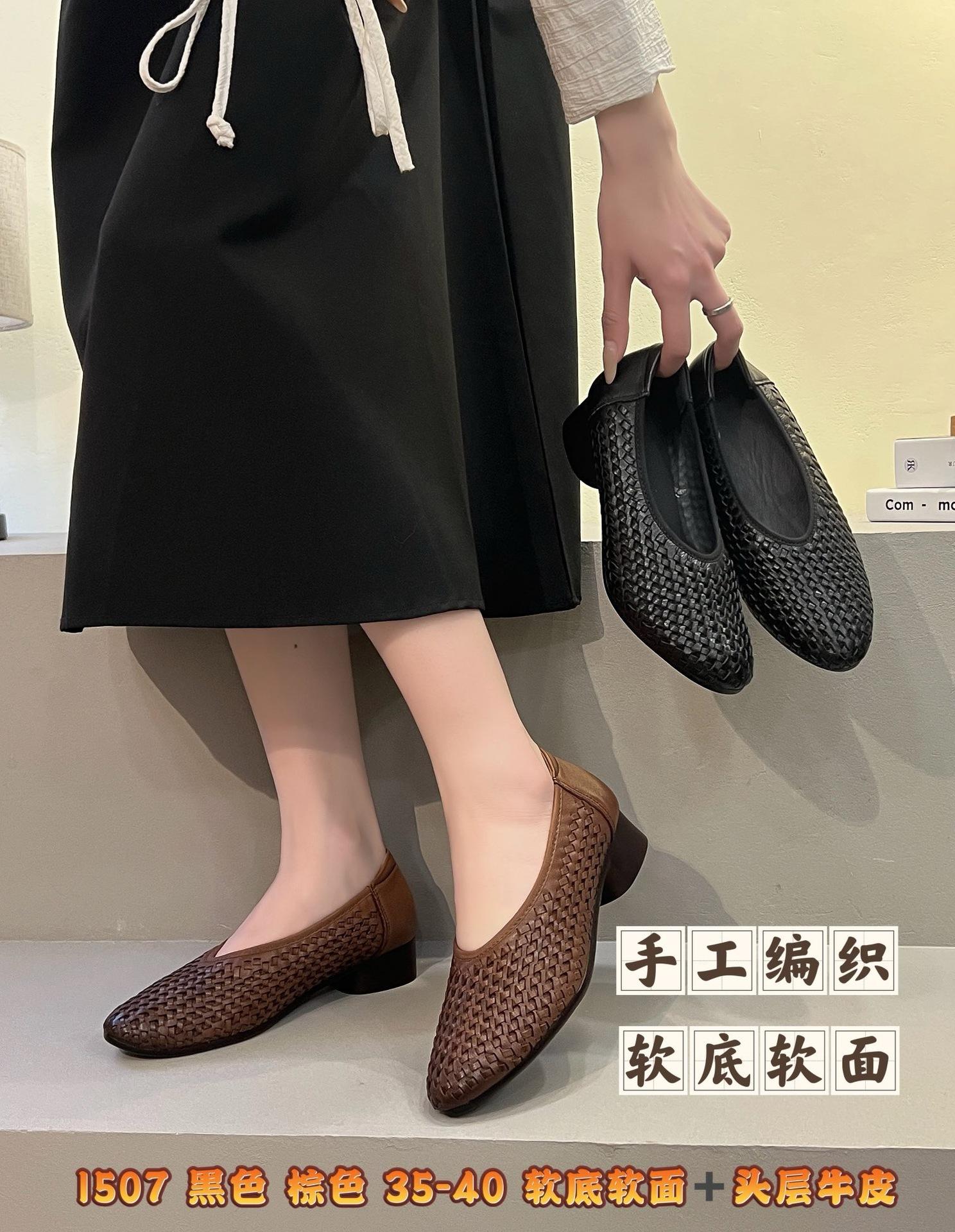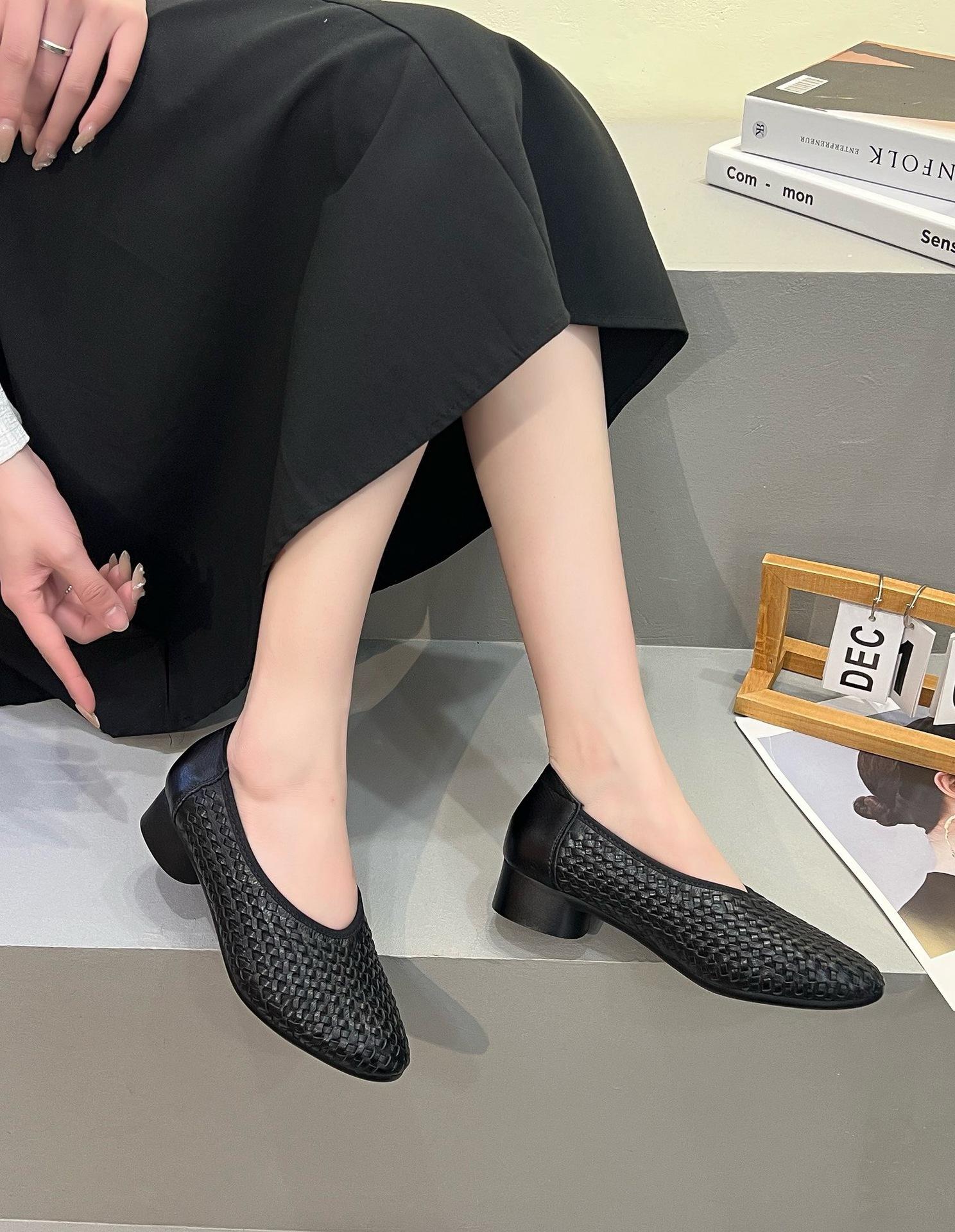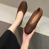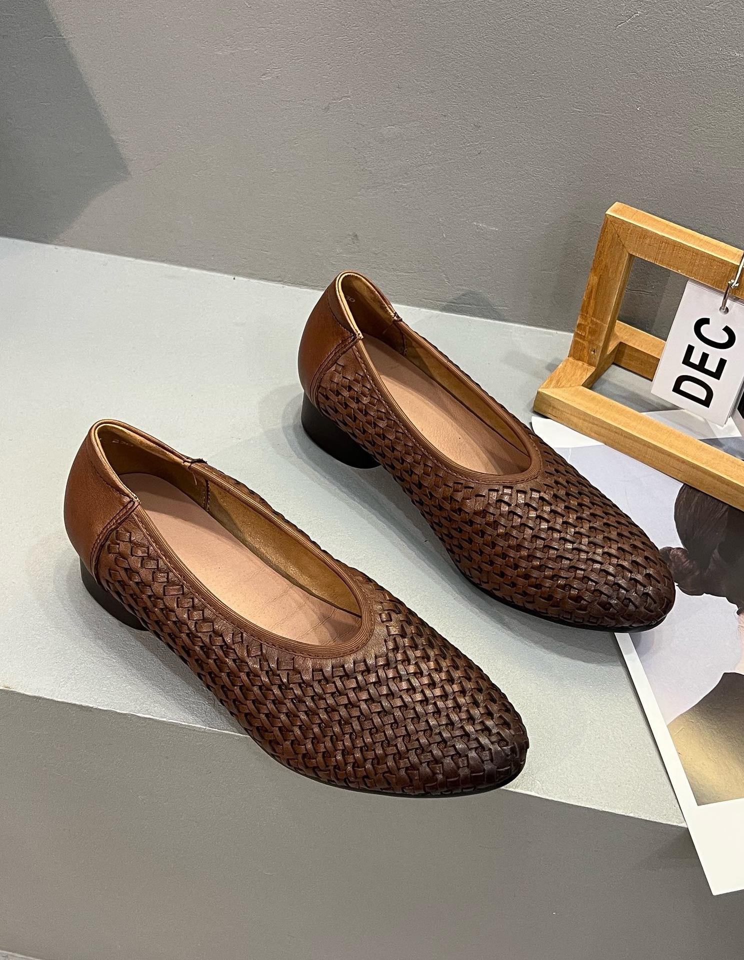 Longlin Retro Francés Tejido a Mano para Mujer 2025 Nuevo Primavera Cuero Genuino Punta Afilada Boca Baja Tacón Bajo Zapatos de Mujer Directo de Fábrica