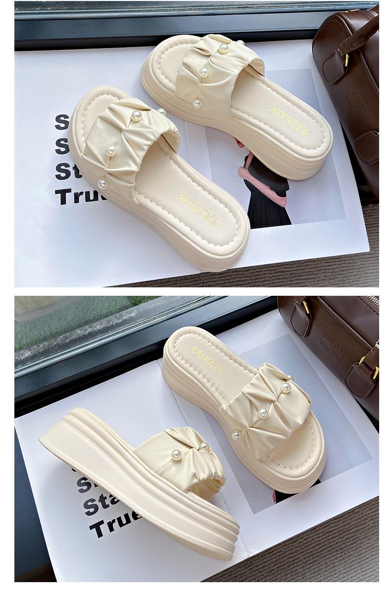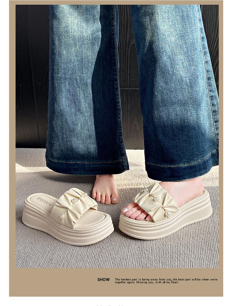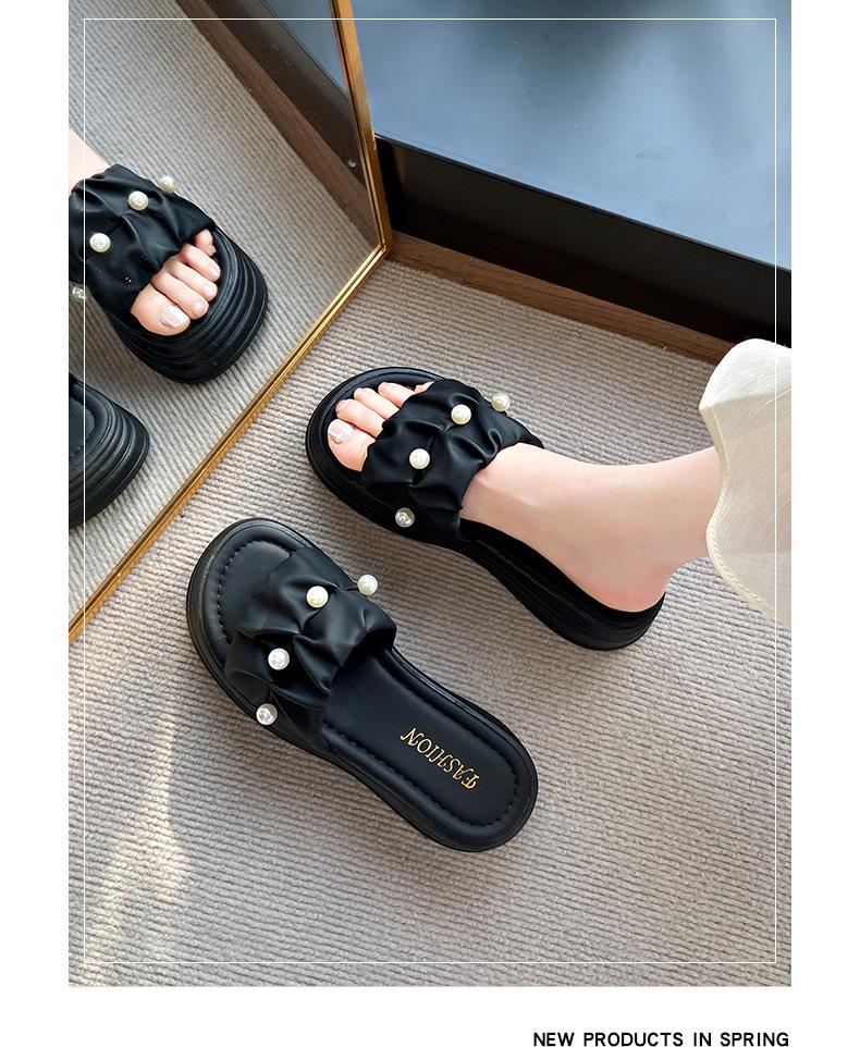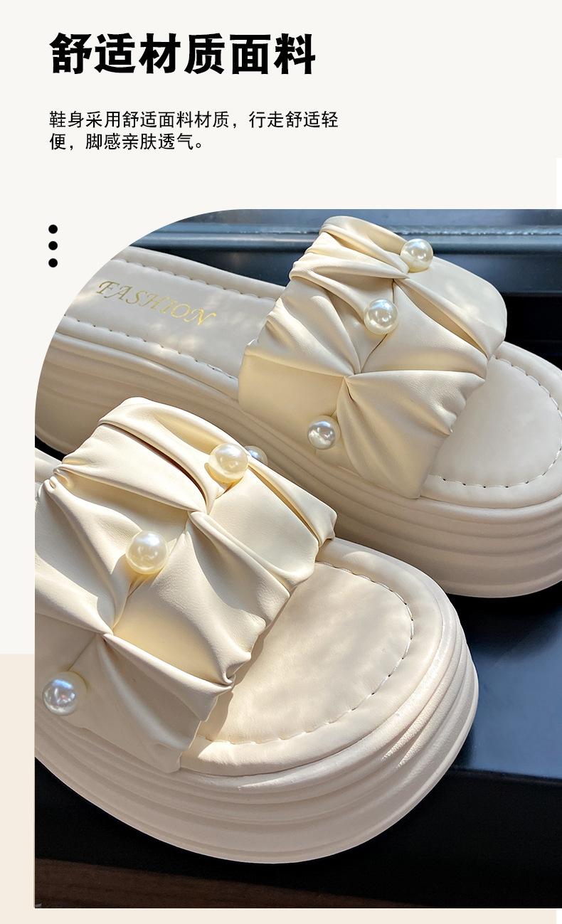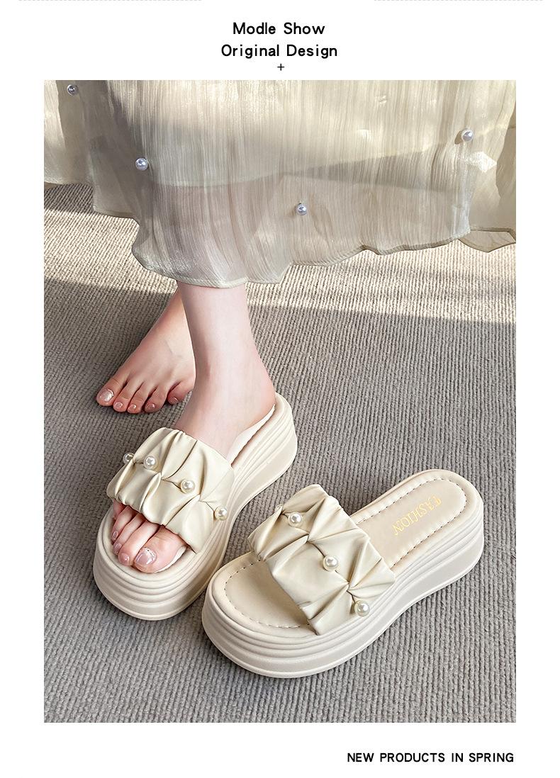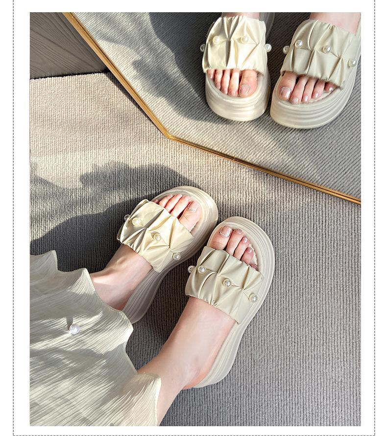 Sandalias de Talla Grande Transfronterizas para Mujer 2025 Verano Nuevo Punta Cuadrada Tacón Bajo Perla Plisada Una Línea Zapatillas Planas