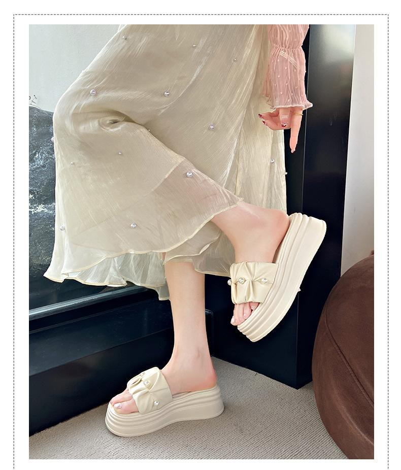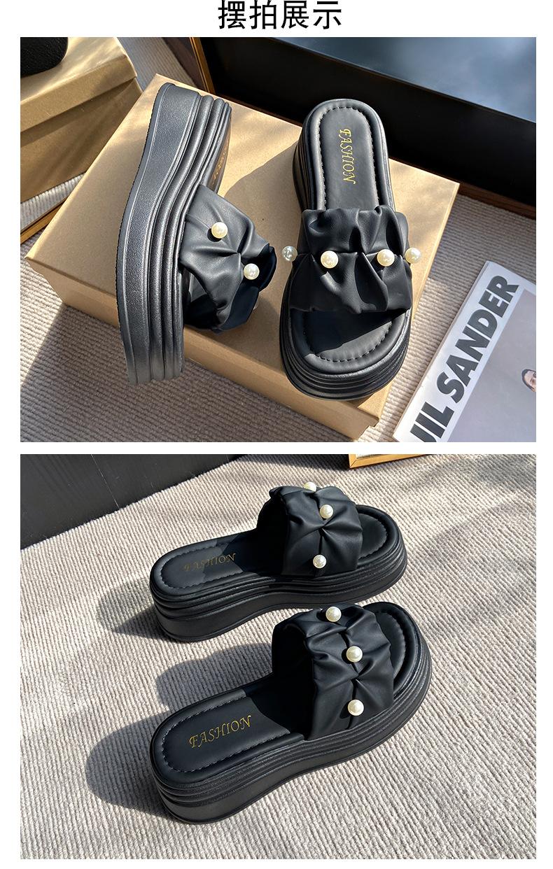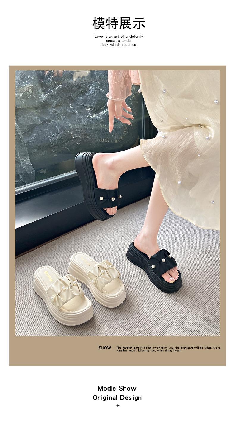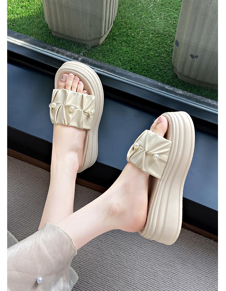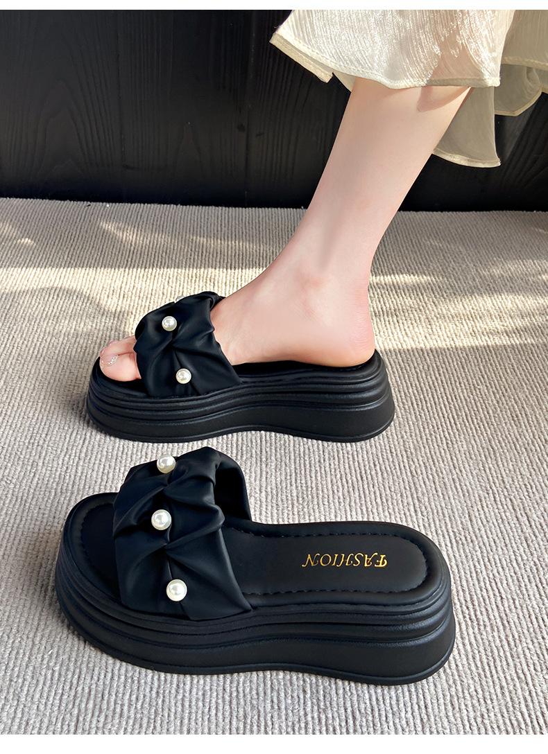 Sandalias de Talla Grande Transfronterizas para Mujer 2025 Verano Nuevo Punta Cuadrada Tacón Bajo Perla Plisada Una Línea Zapatillas Planas