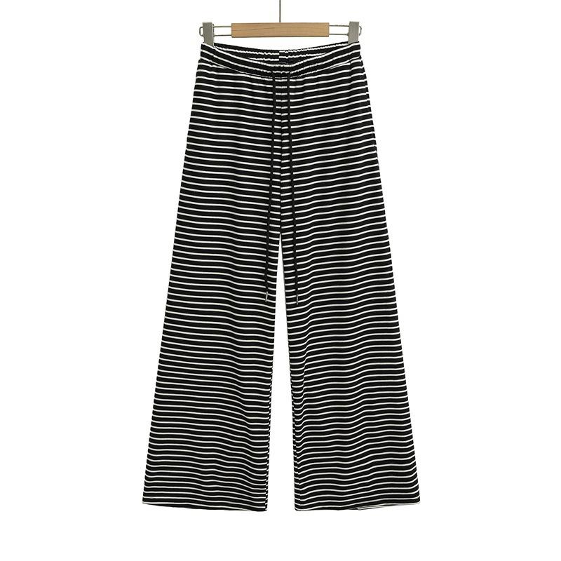 Pantalones Casuales a Rayas de Pierna Ancha con Cintura Elástica Alta y Cordón Ajustable para Mujer Primavera Verano Rayas Diplomáticas Deportivos Pierna Ancha