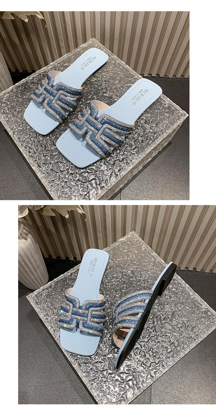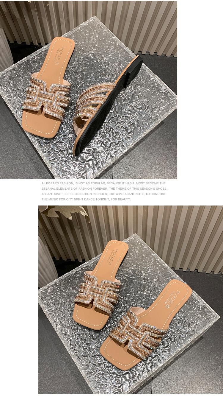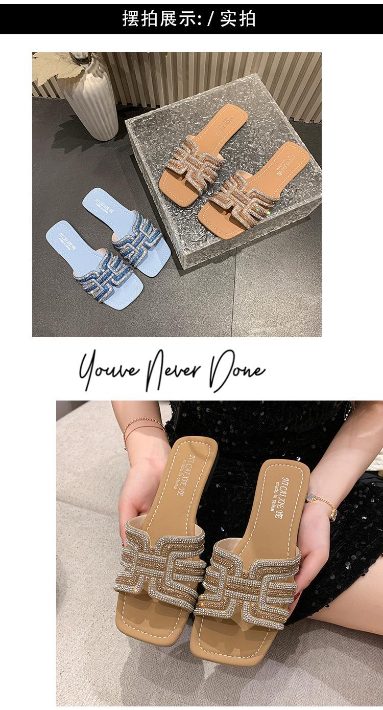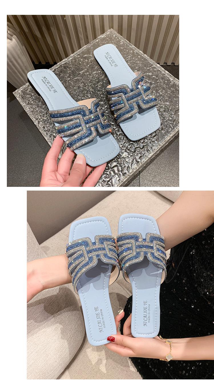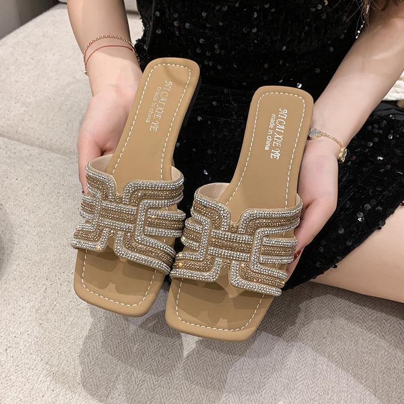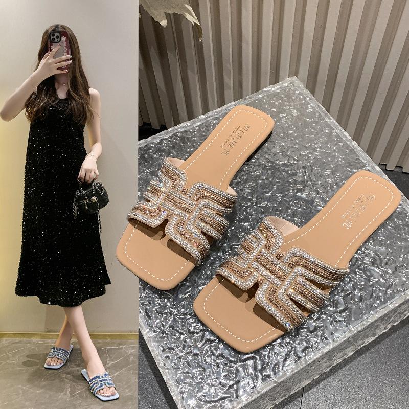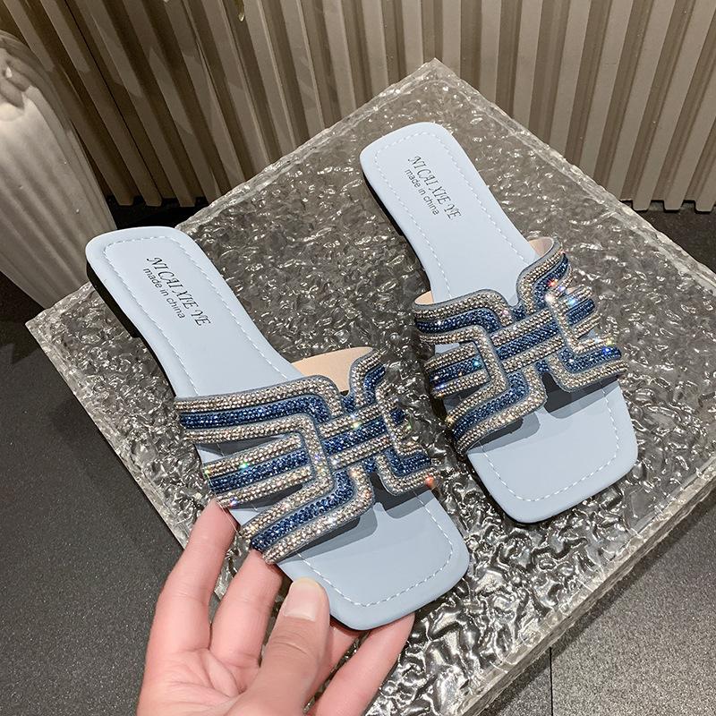 Pantuflas planas de talla grande transfronterizas para mujer para uso exterior 2025 verano nuevo color sólido ligeras pedrería sandalias de playa
