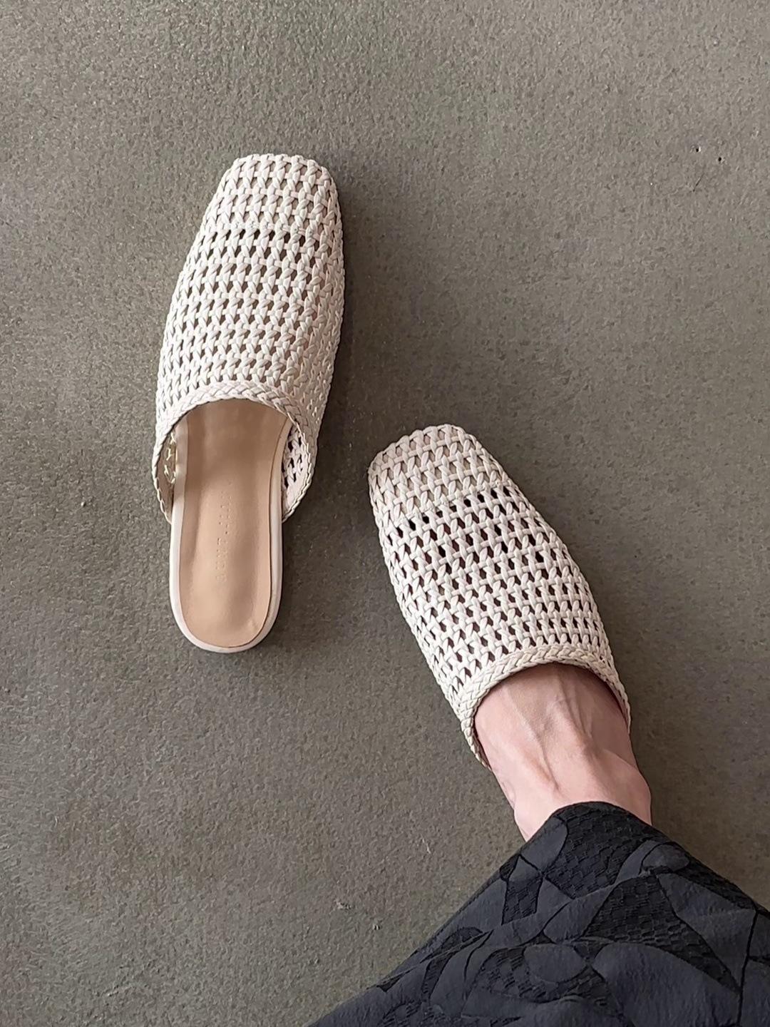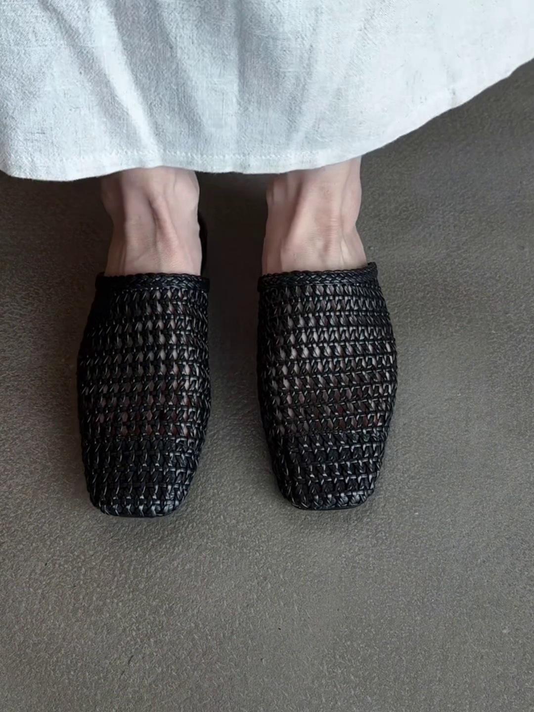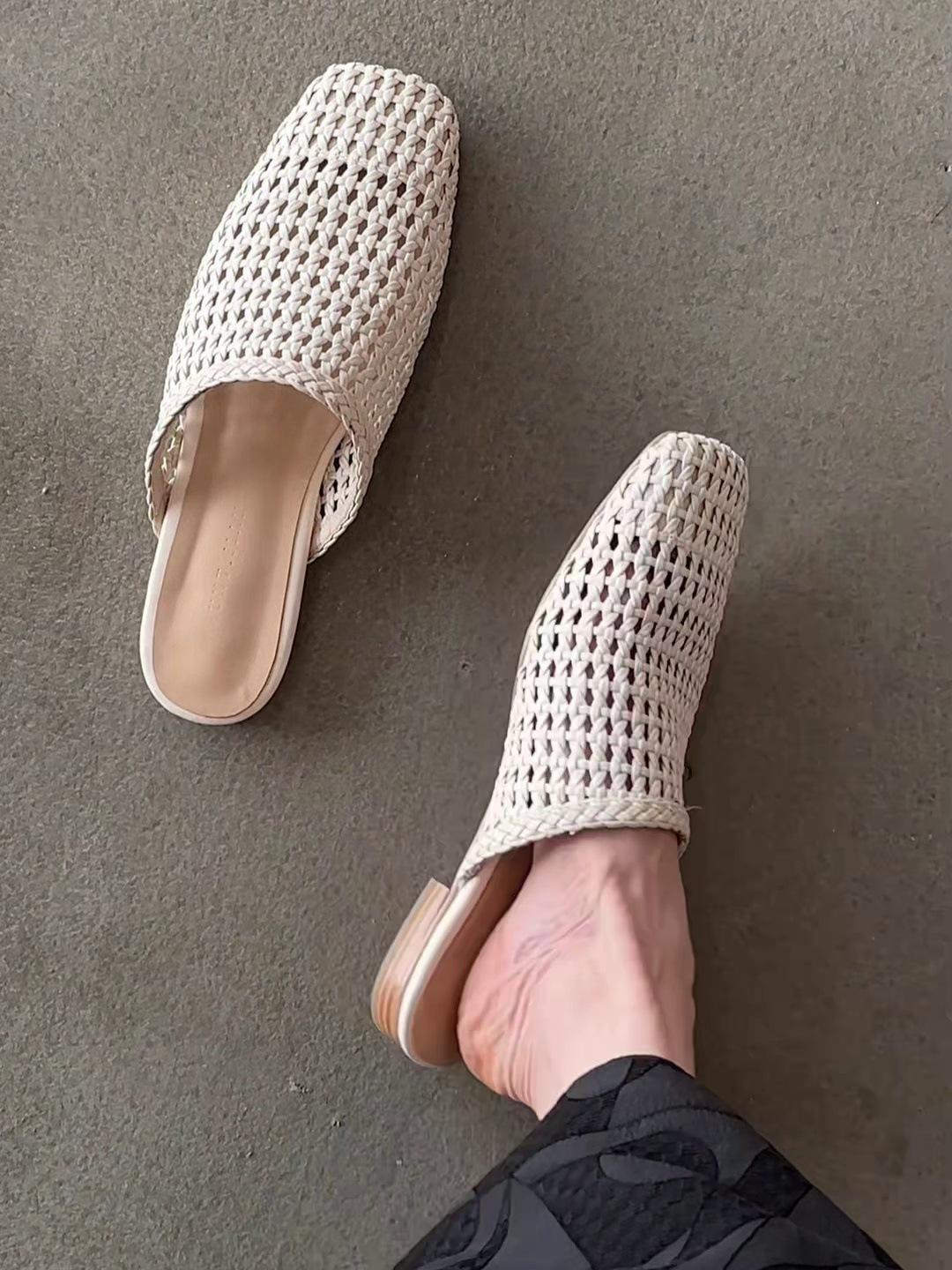 Zapatillas de verano planas de punta cuadrada hueca tejidas de estilo nuevo 2025 para mujer, sandalias de moda para personas perezosas