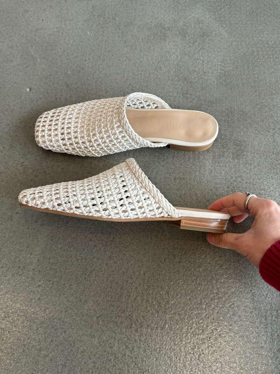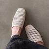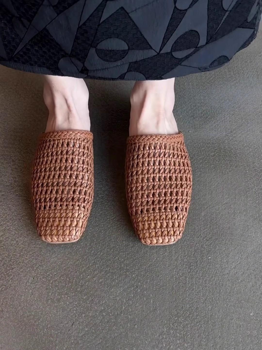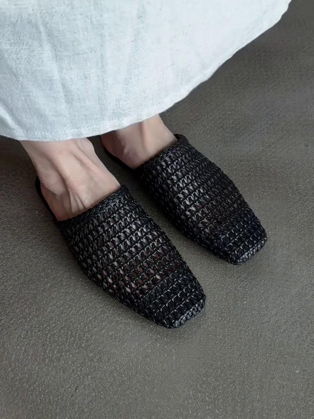 Zapatillas de verano planas de punta cuadrada hueca tejidas de estilo nuevo 2025 para mujer, sandalias de moda para personas perezosas