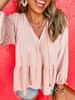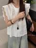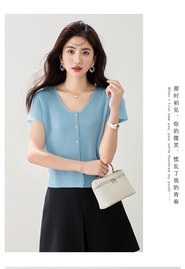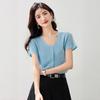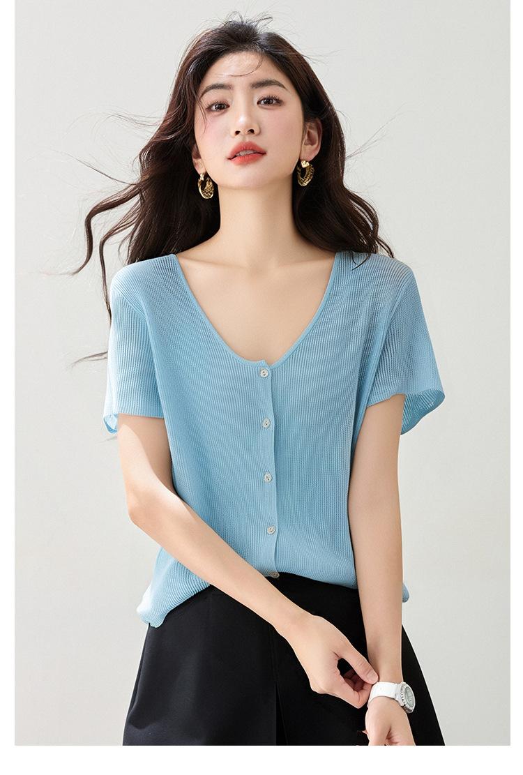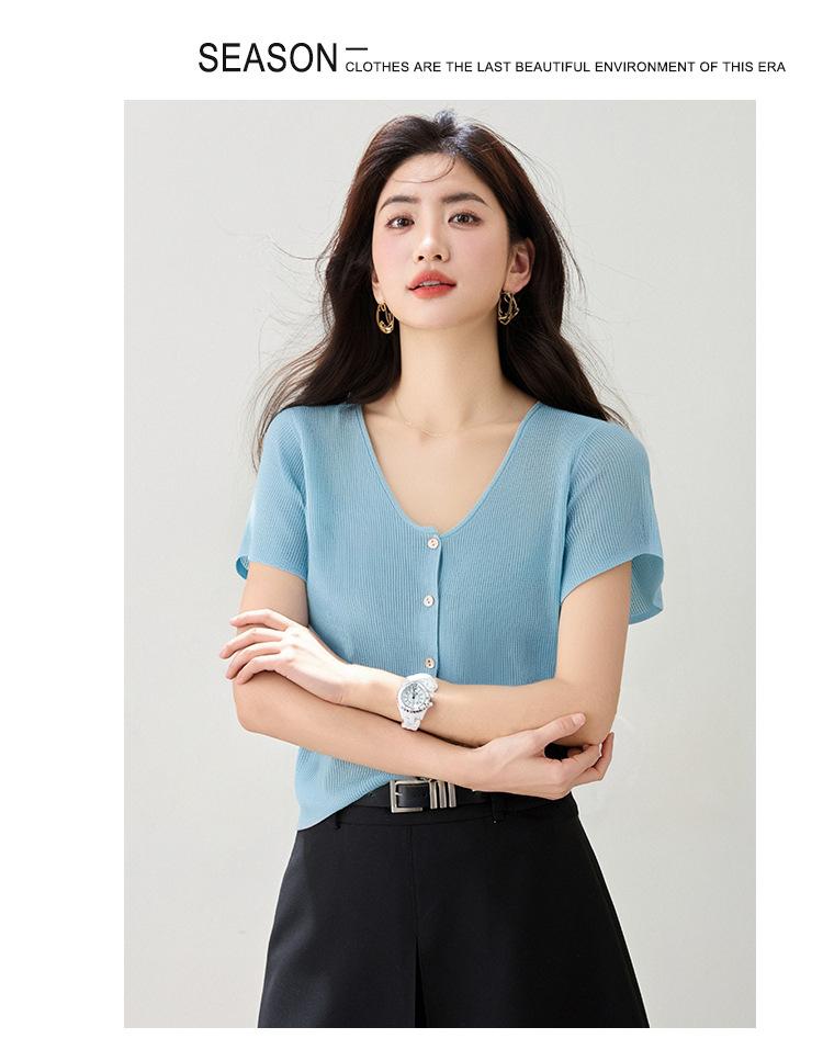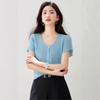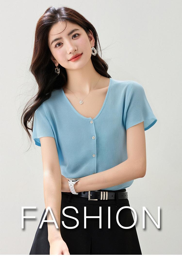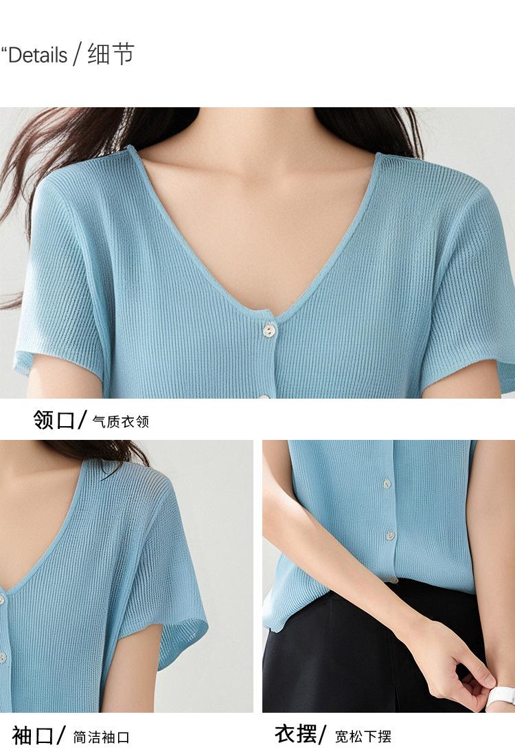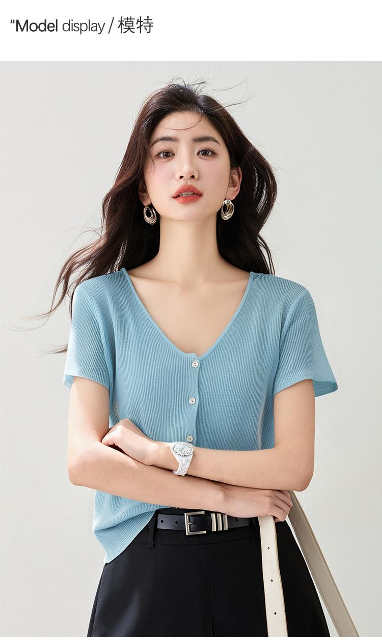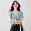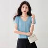 2025 Nuevo Estilo de Verano Estilo Suave Cómodo y Fresco Lino Algodón Color Puro Cuello en V Papel Hombre Tejido Top de Manga Corta para Mujer