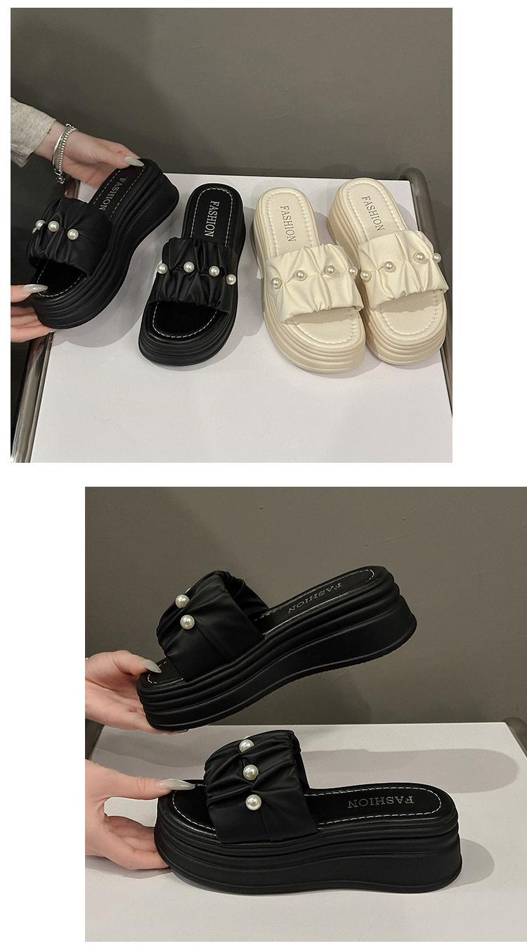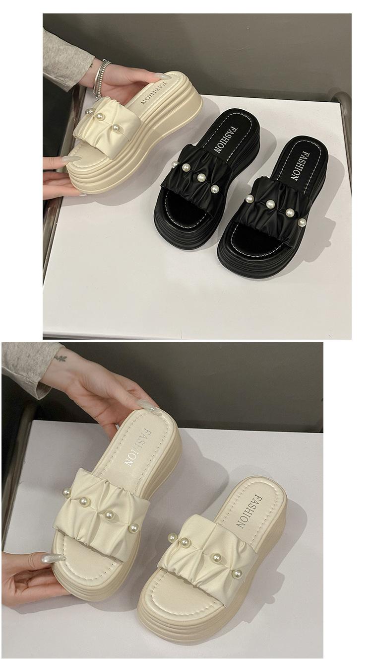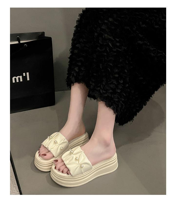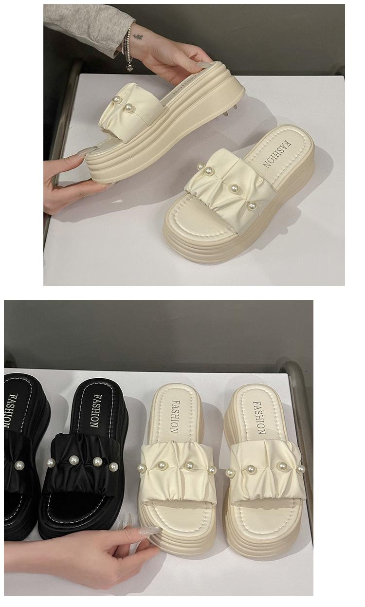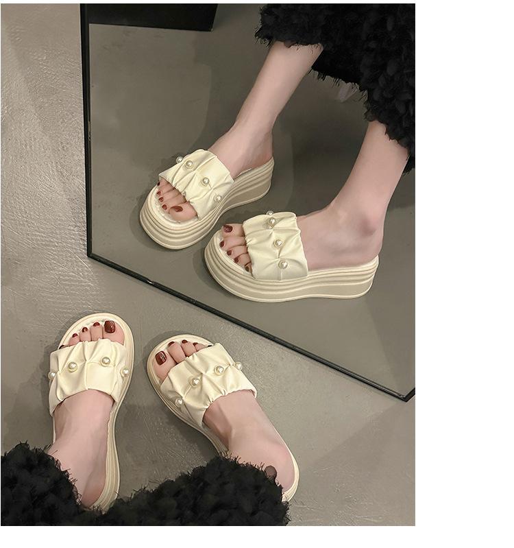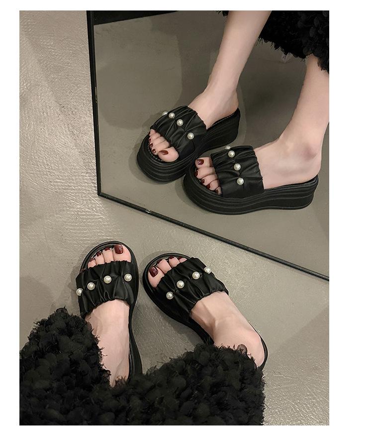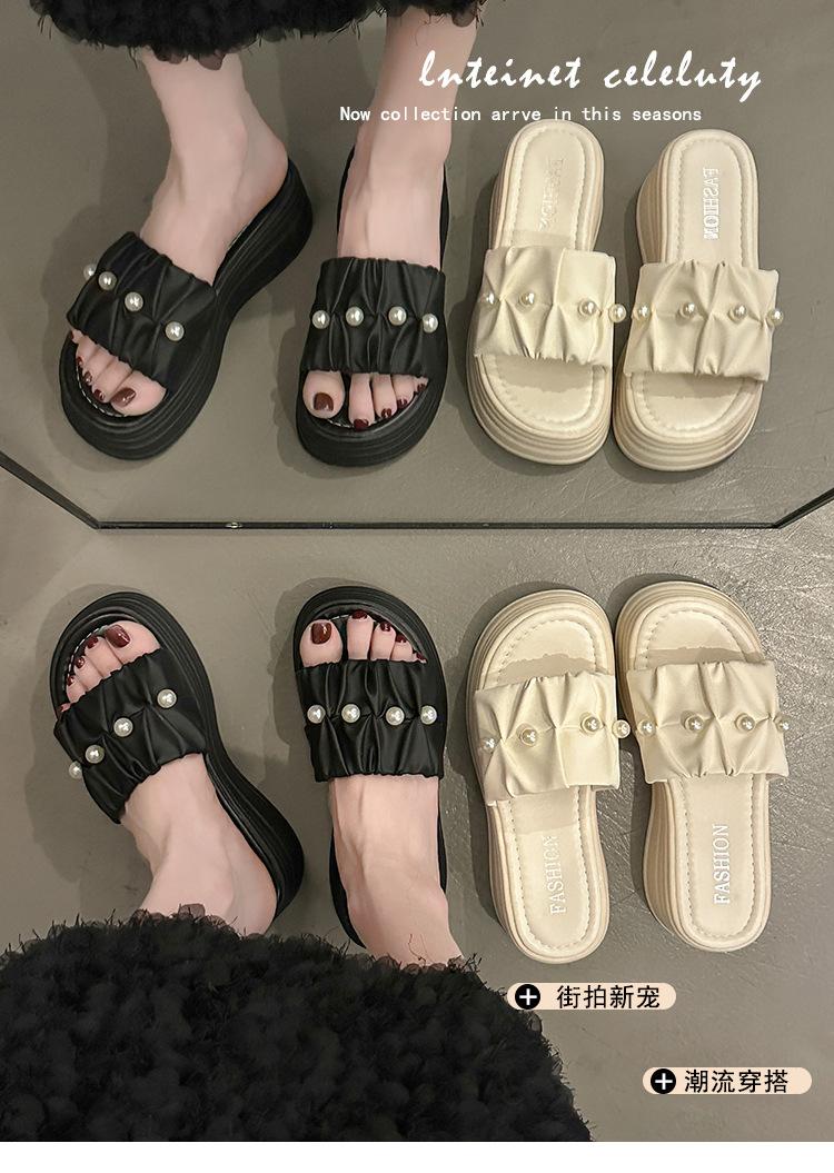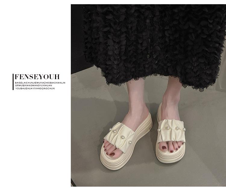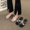 Sandalias de Talla Grande Transfronterizas para Mujer 2025 Verano Nuevo Punta Cuadrada Tacón Bajo Perla Plisada Una Línea Pantuflas de Suela Gruesa