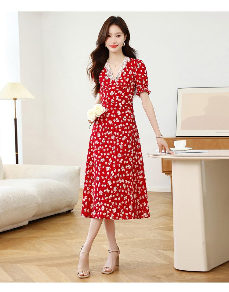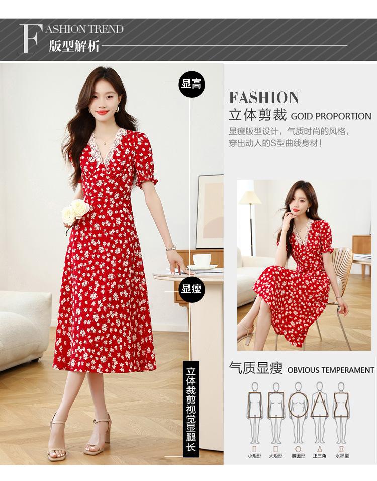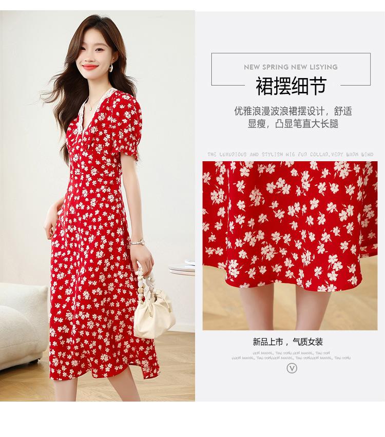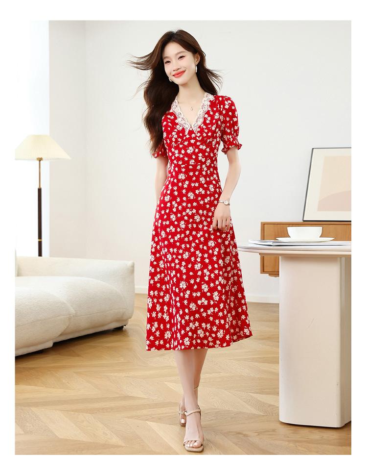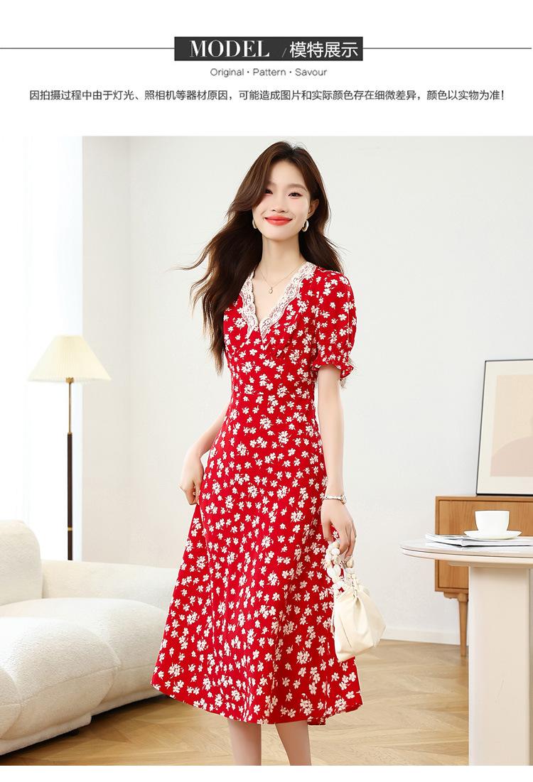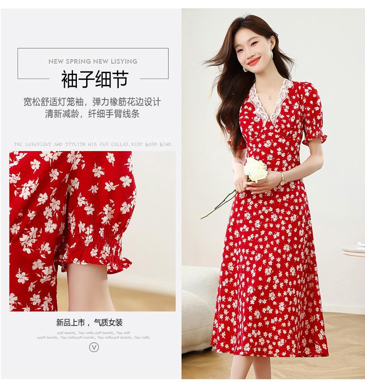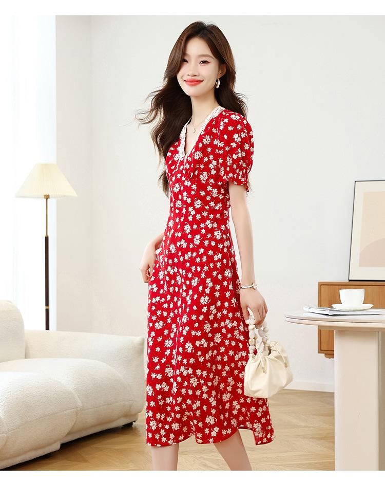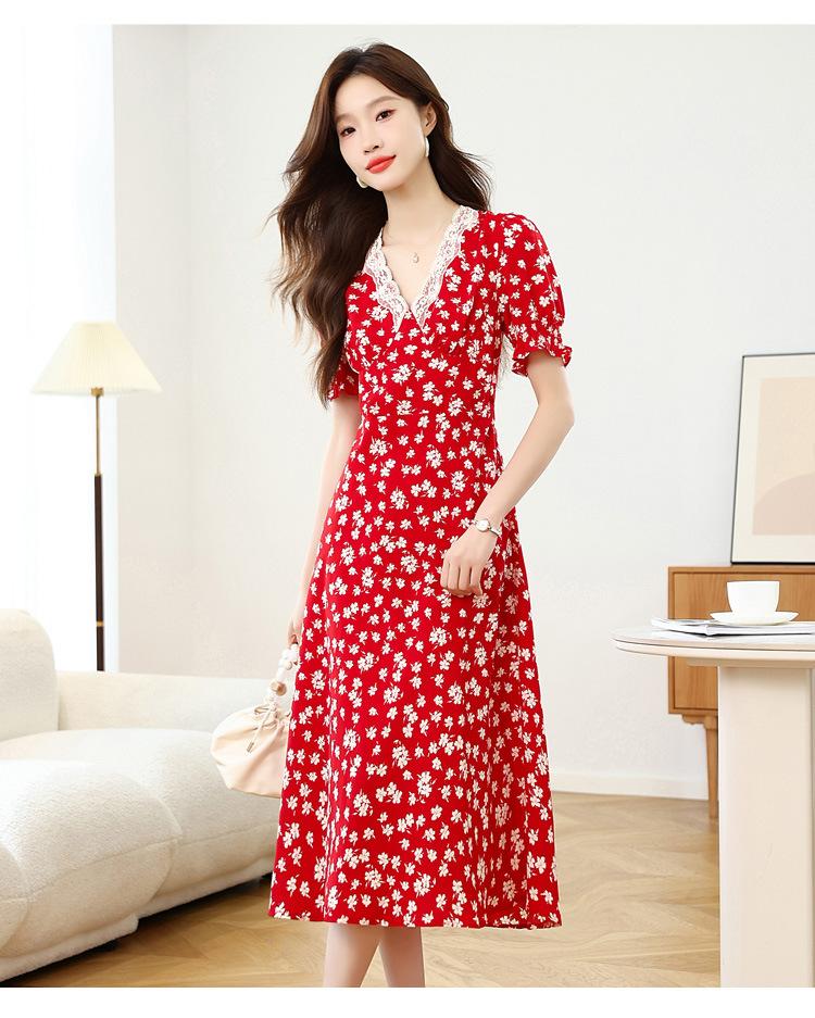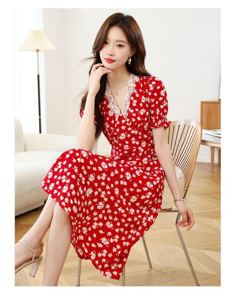 Vestido Rojo Floral de Manga Corta Abullonada para Mujer Primavera y Verano 2025 Look Adelgazante Francés Cuello V Vestido Largo de Vacaciones
