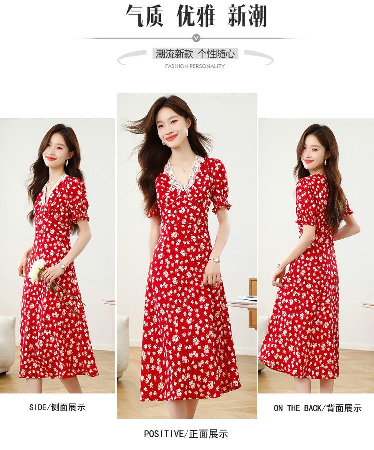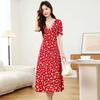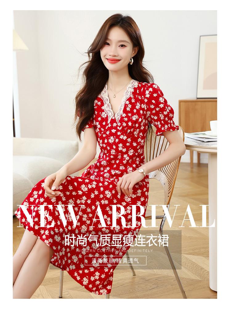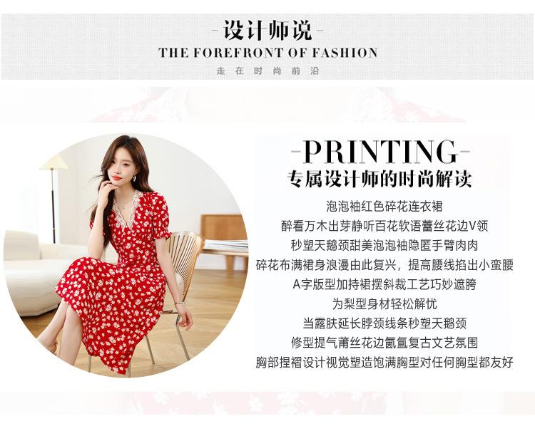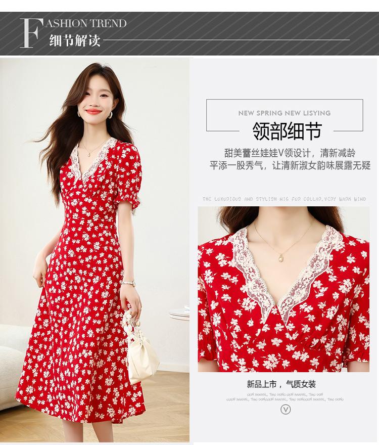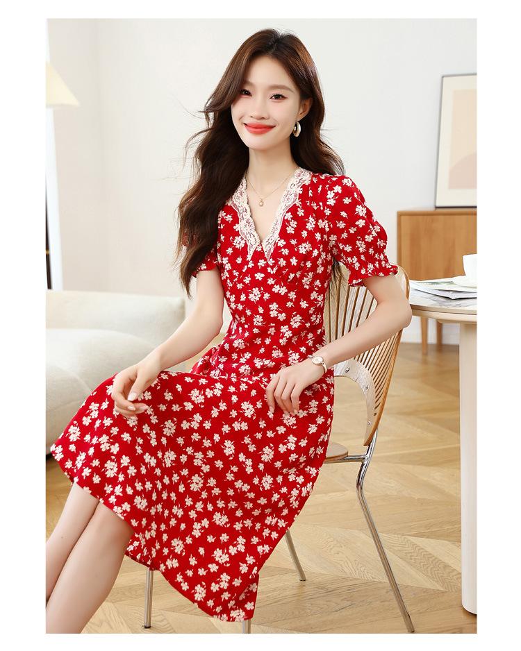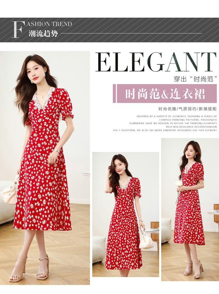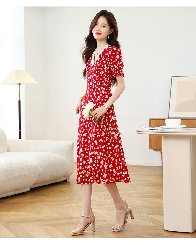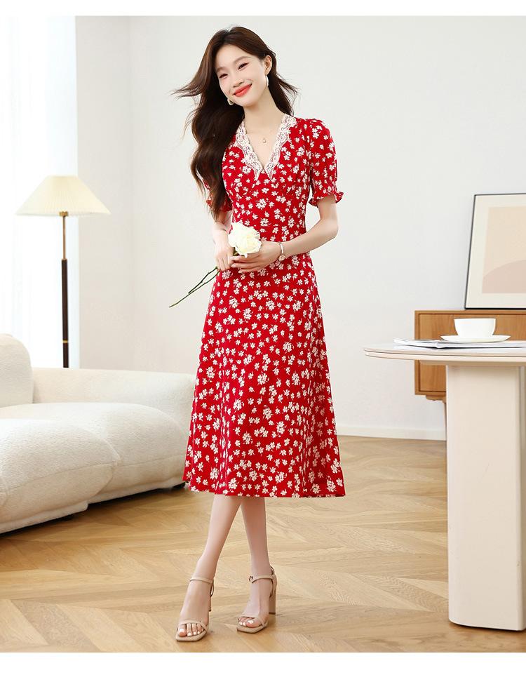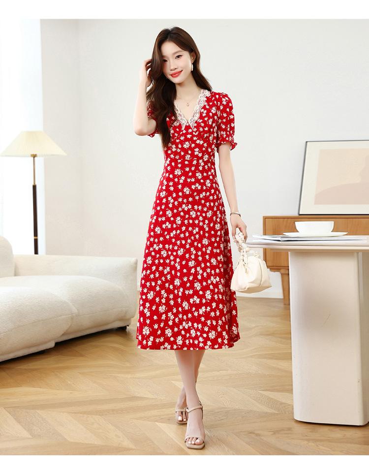 Vestido Rojo Floral de Manga Corta Abullonada para Mujer Primavera y Verano 2025 Look Adelgazante Francés Cuello V Vestido Largo de Vacaciones