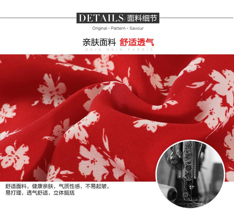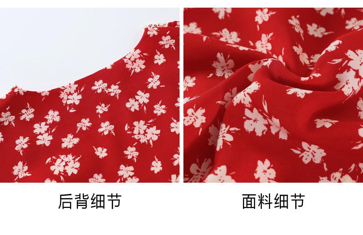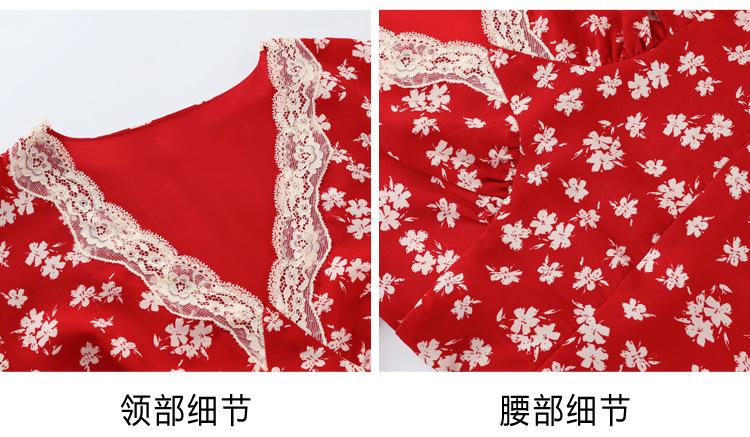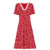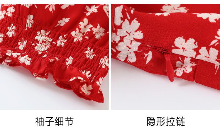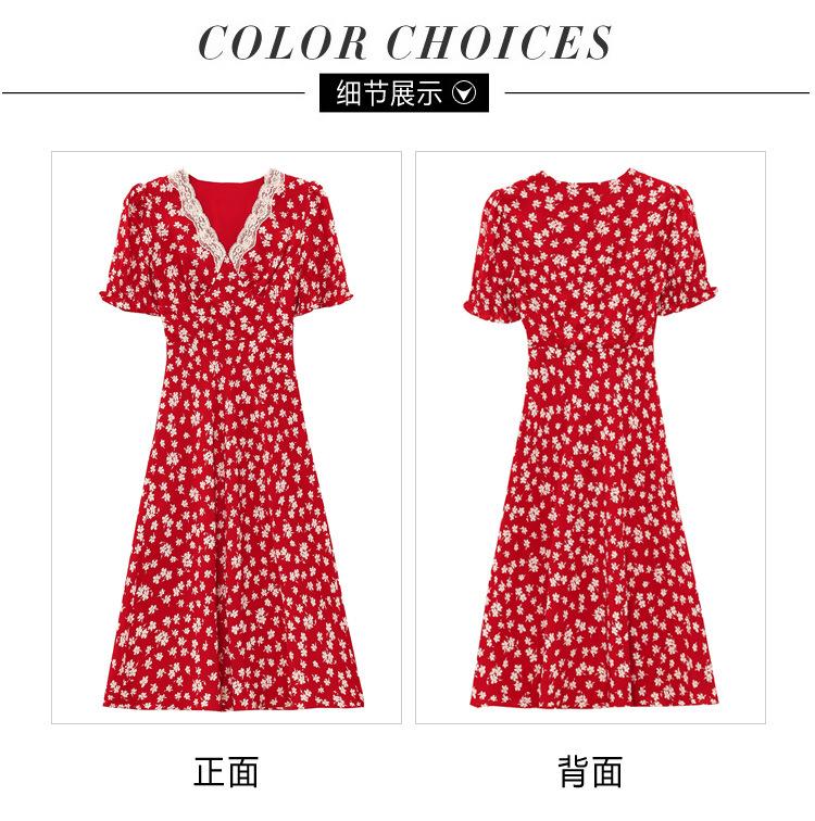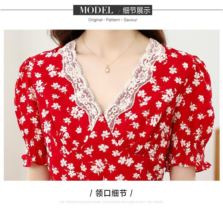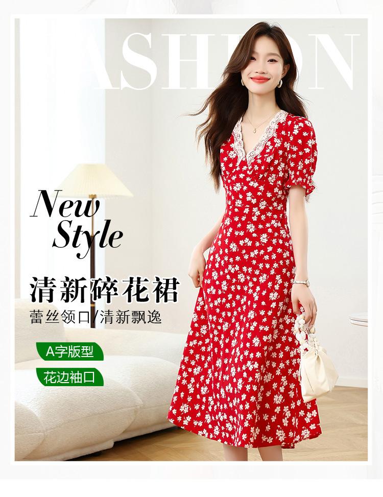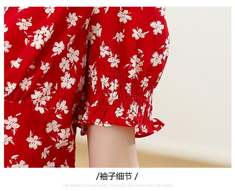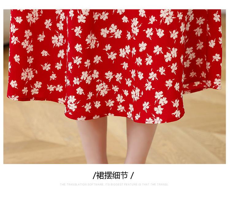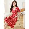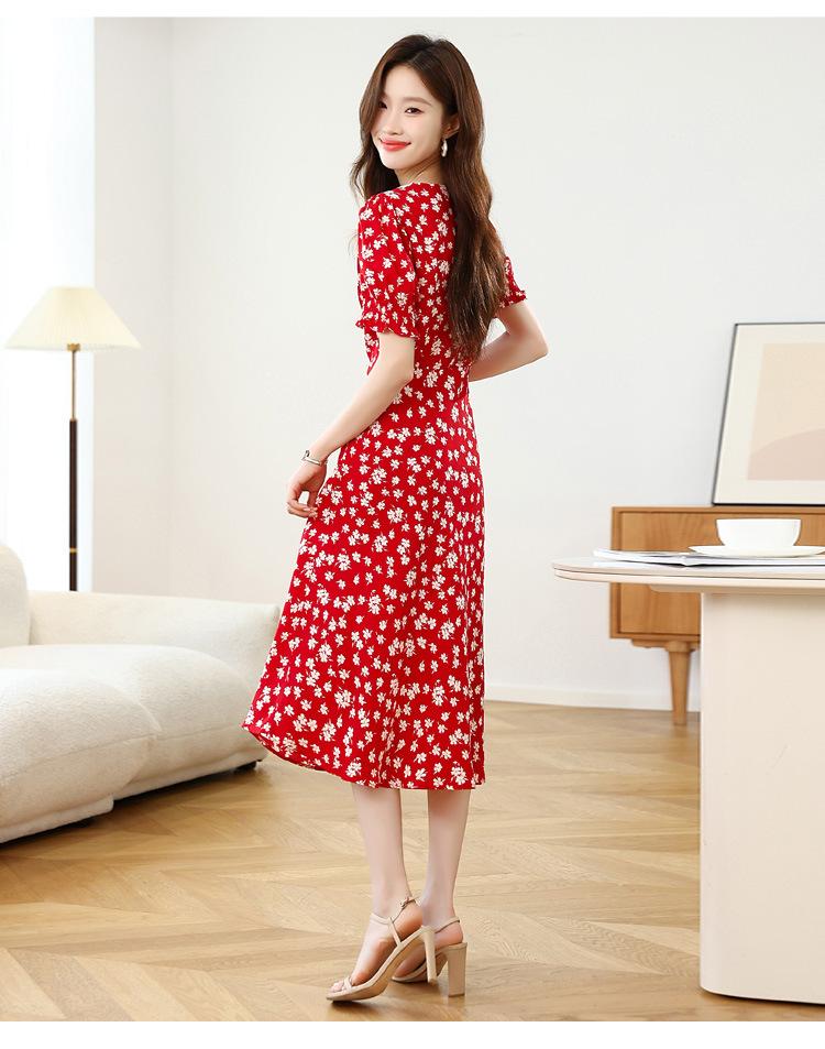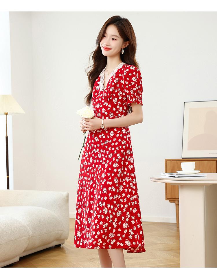 Vestido Rojo Floral de Manga Corta Abullonada para Mujer Primavera y Verano 2025 Look Adelgazante Francés Cuello V Vestido Largo de Vacaciones