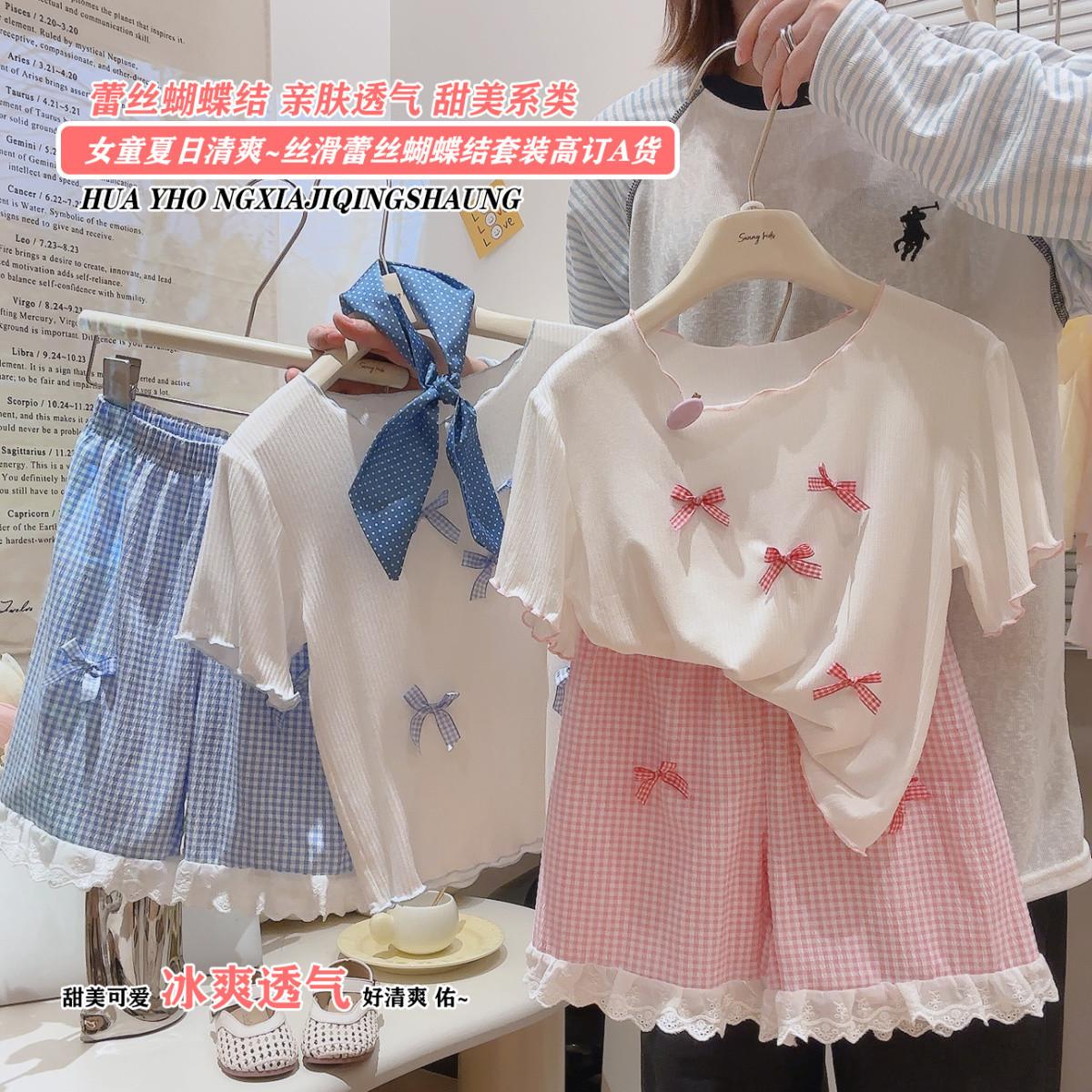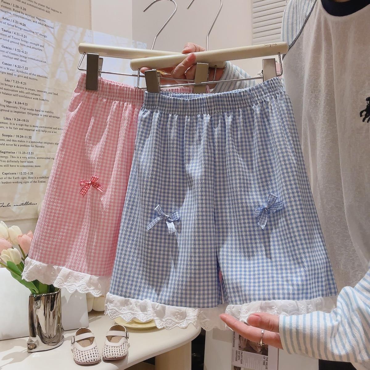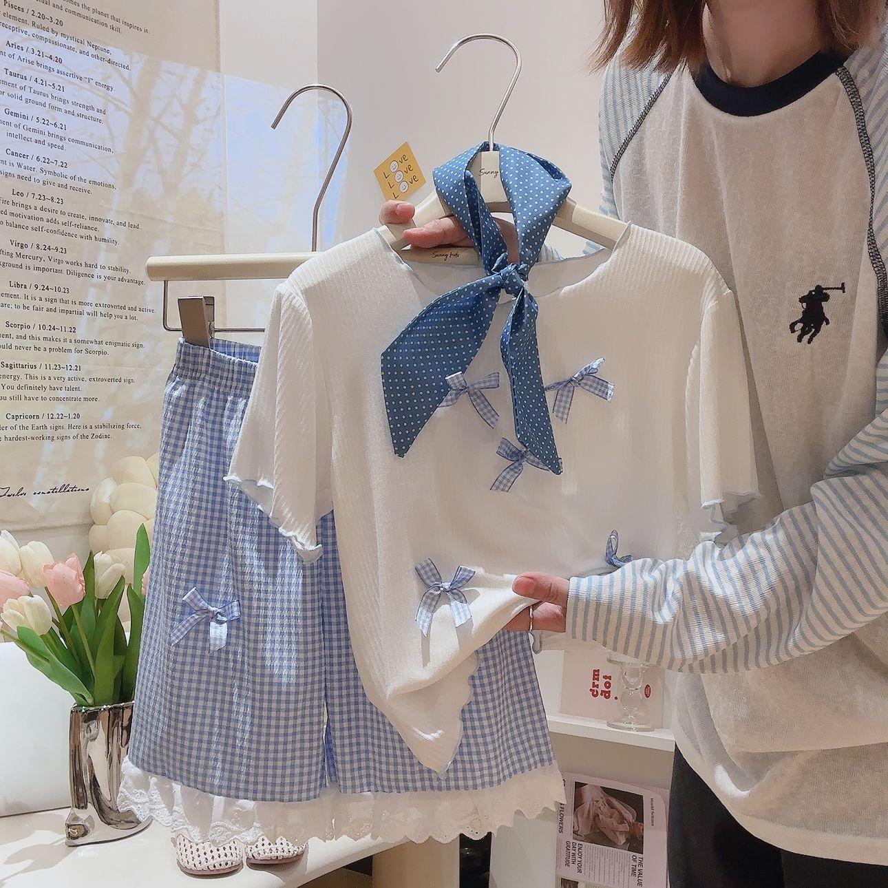 Traje Dulce de Verano para Niñas con Lazo Pequeño, Mediano y Grande para Niños Bebé con Encaje Empalmado a Cuadros Shorts Top Conjunto de Dos Piezas
