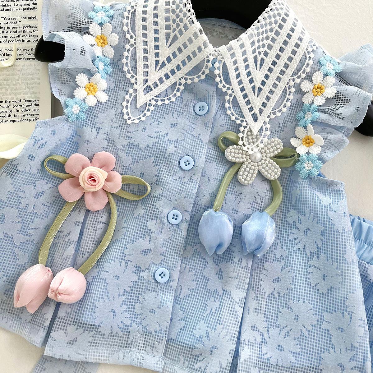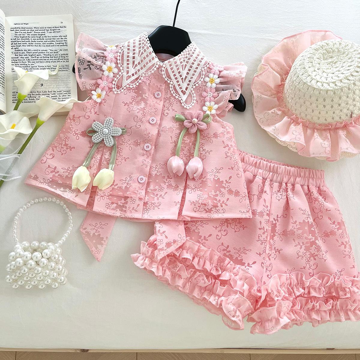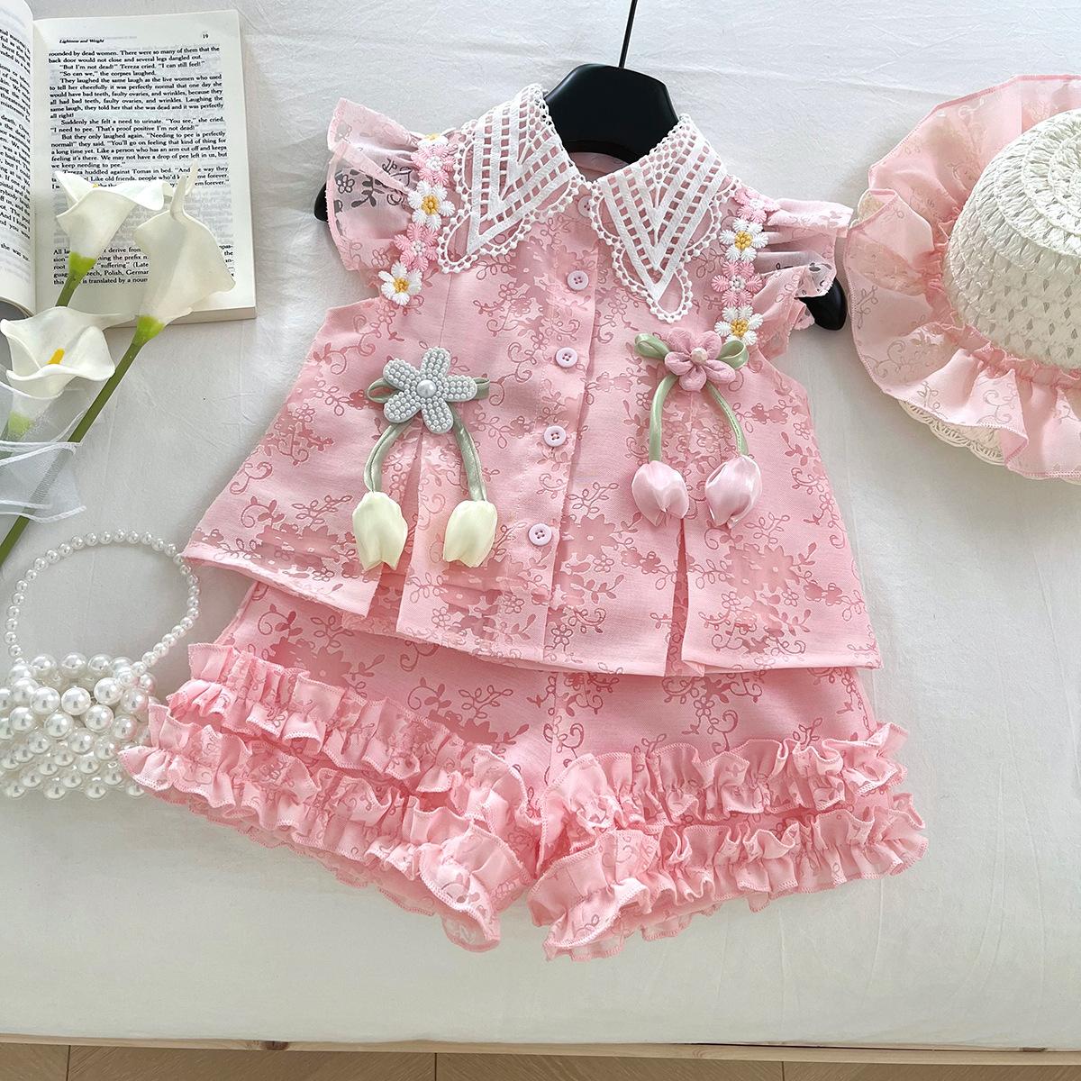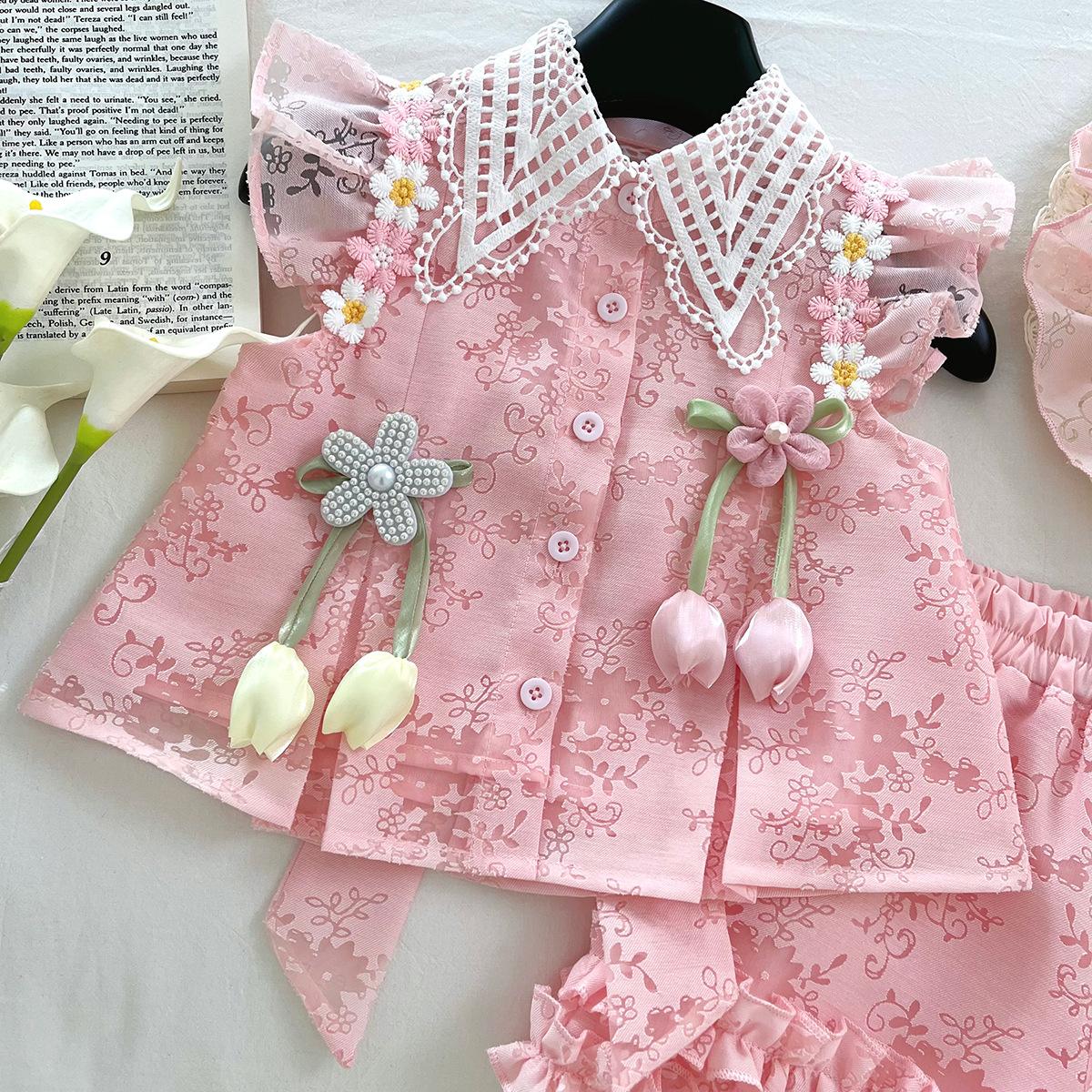 Compra Traje de Verano Nuevo para Niñas 2025 Estilo Bebé Infantil Camisa de Manga Volante con Flores Traje de Encaje Versátil 30139 al por mayor en Joom.pro
