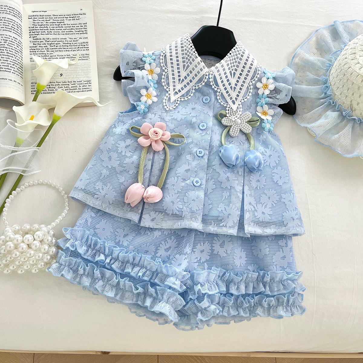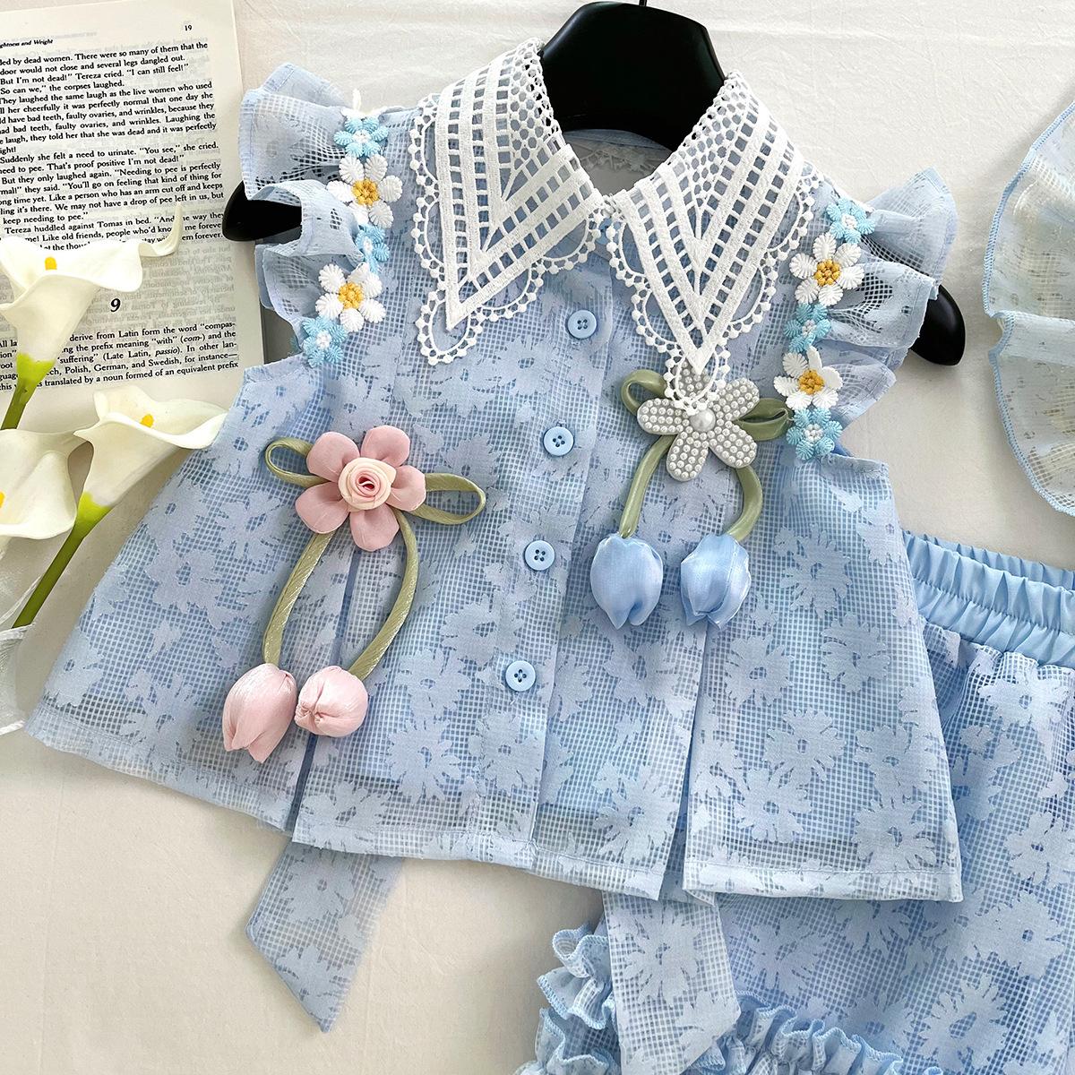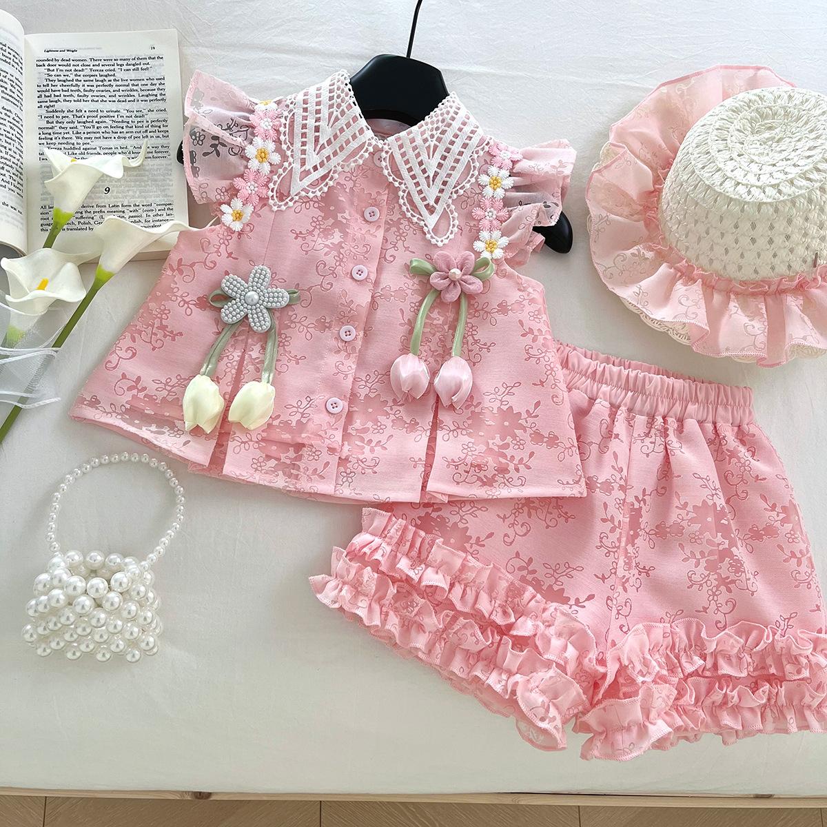 Compra Traje de Verano Nuevo para Niñas 2025 Estilo Bebé Infantil Camisa de Manga Volante con Flores Traje de Encaje Versátil 30139 al por mayor en Joom.pro