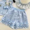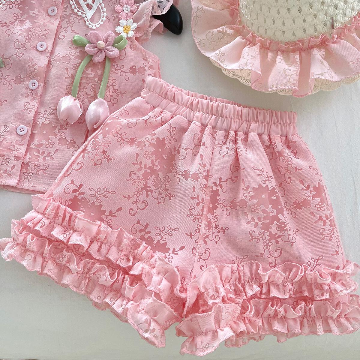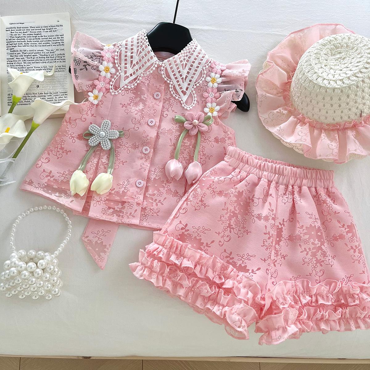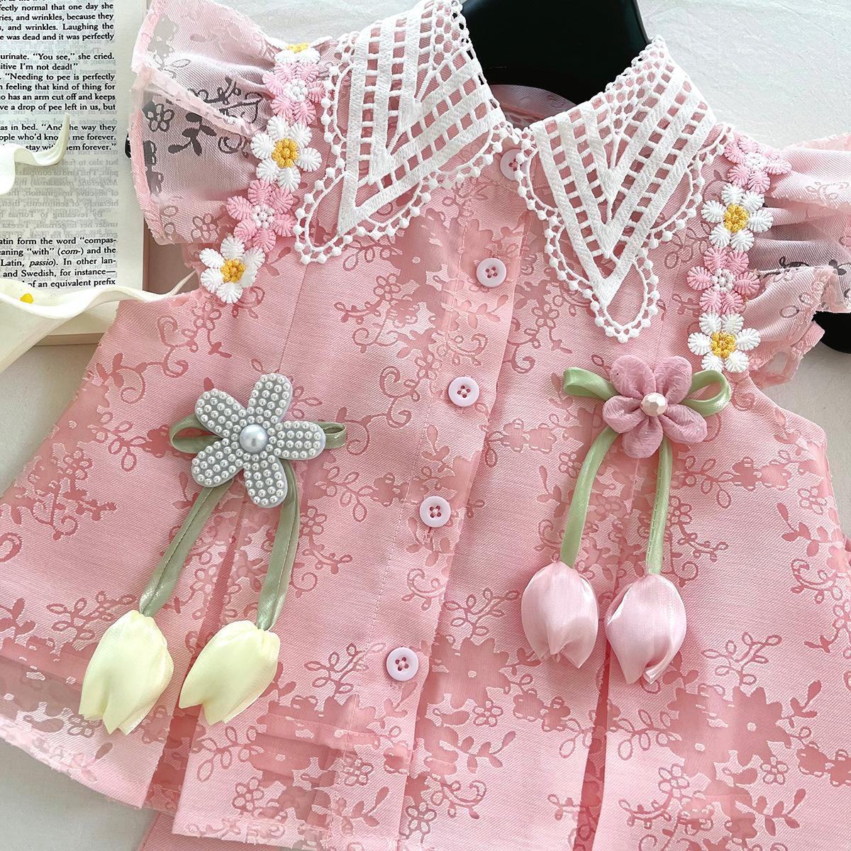 Traje de Verano Nuevo para Niñas 2025 Estilo Bebé Infantil Camisa de Manga Volante con Flores Traje de Encaje Versátil 30139