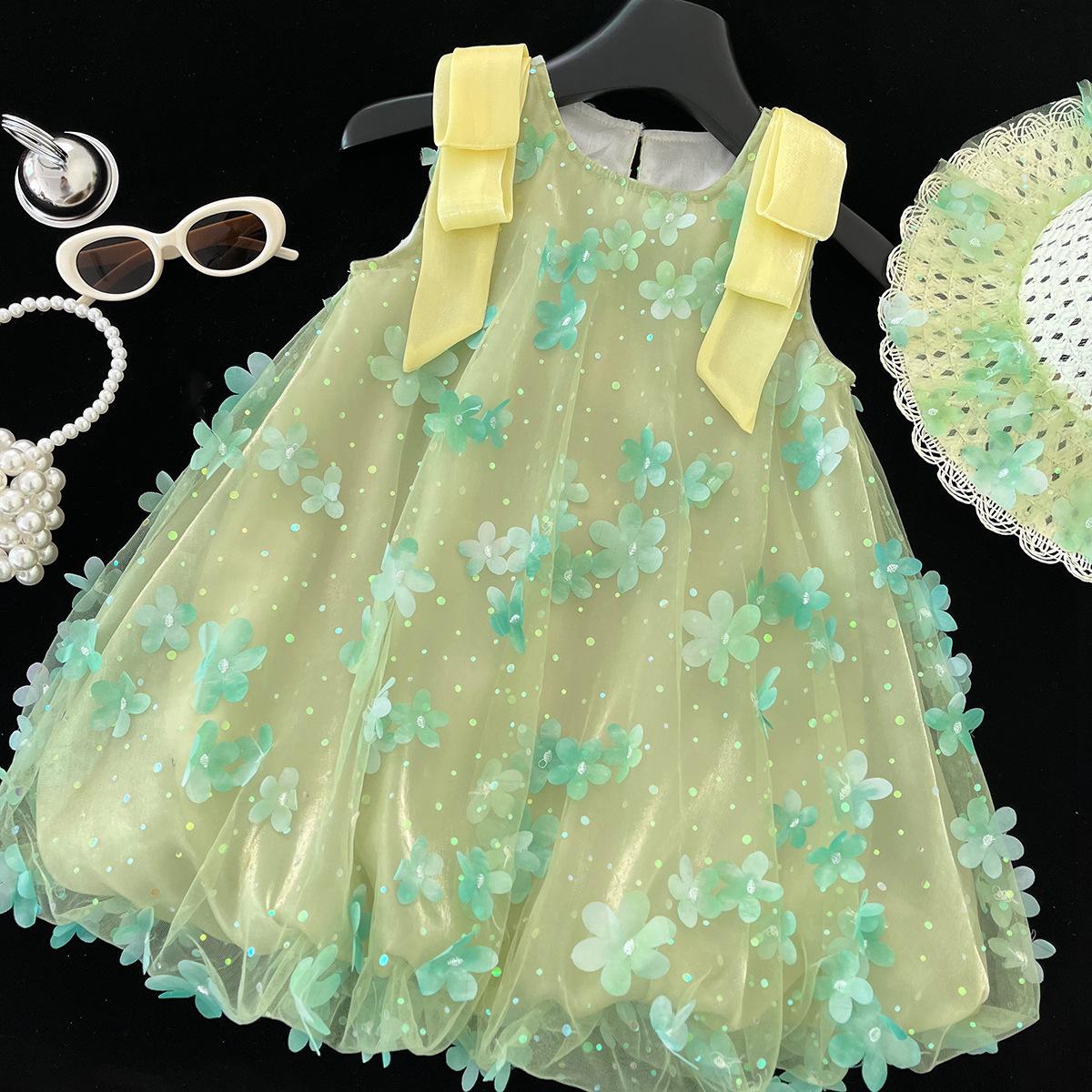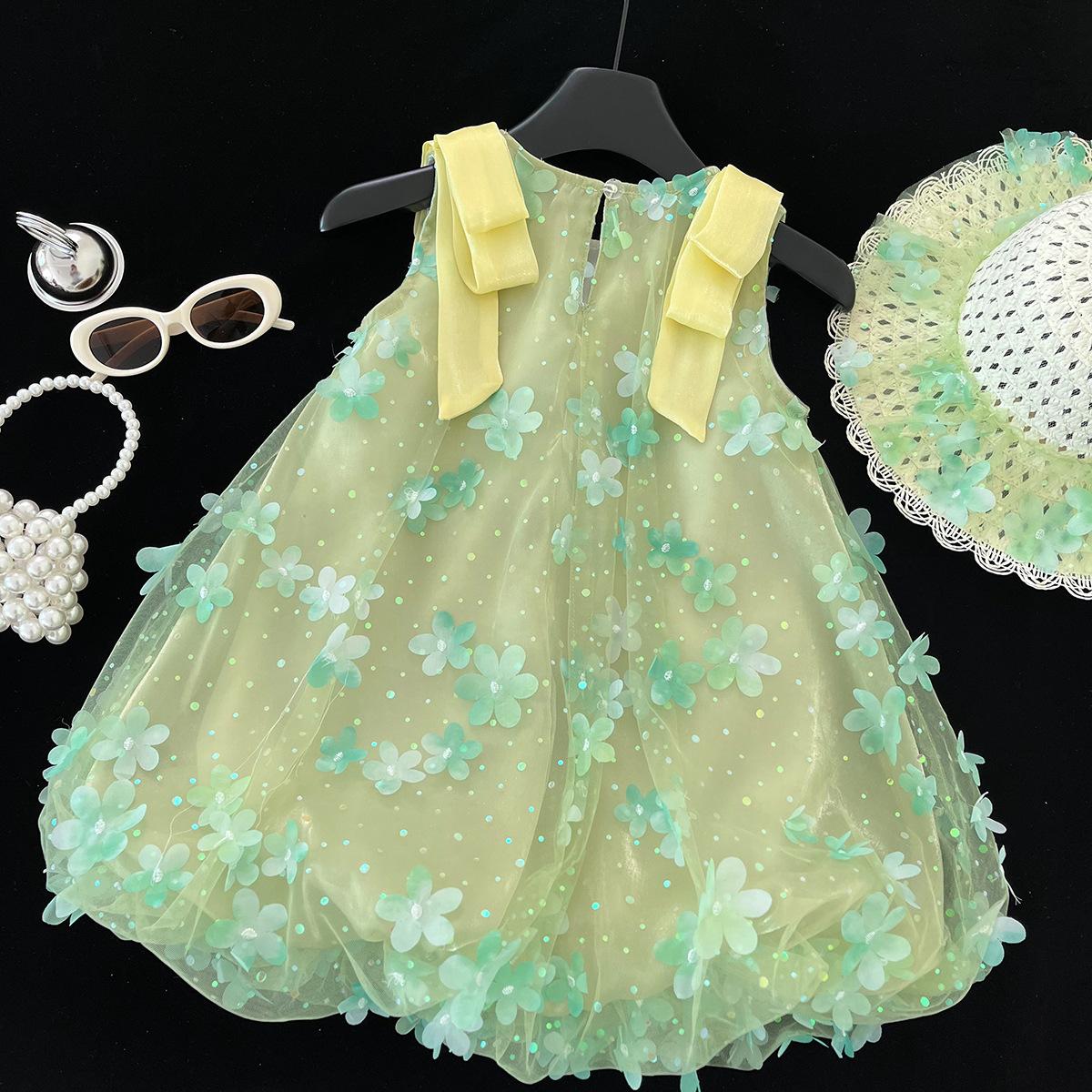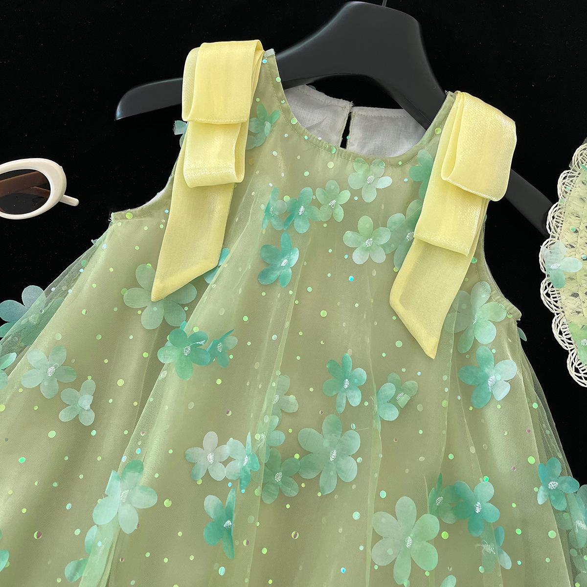 Vestido de niña sin mangas 2025 Verano Nuevo Vestido de princesa para niños Vestido floral de malla elegante y a la moda para niña