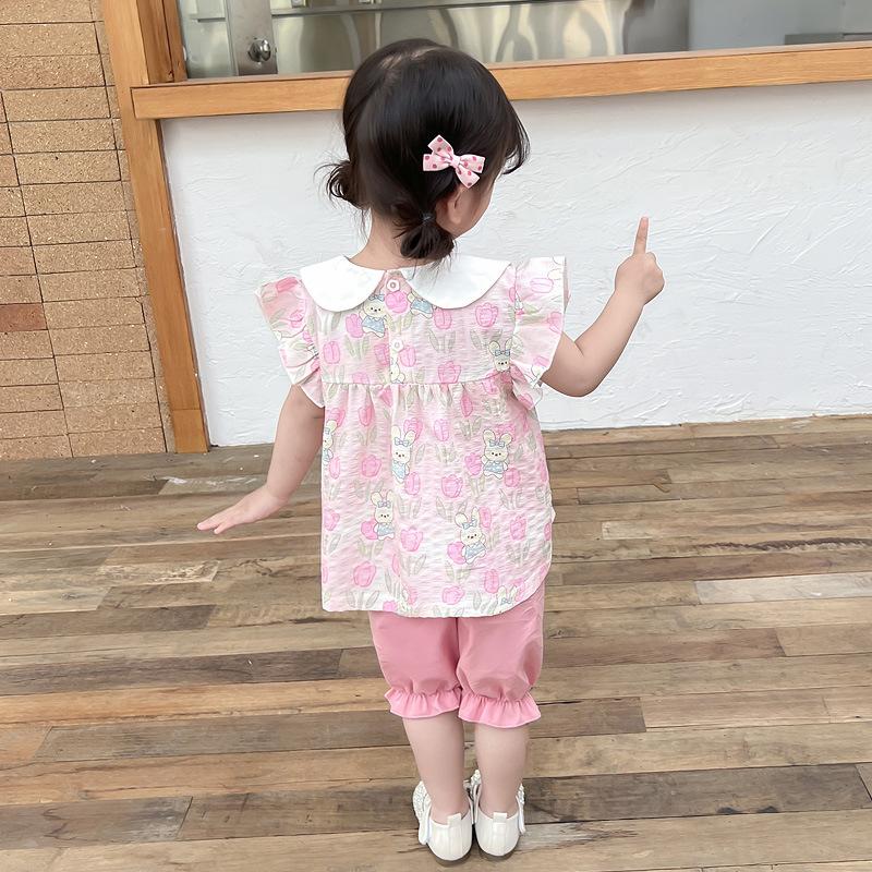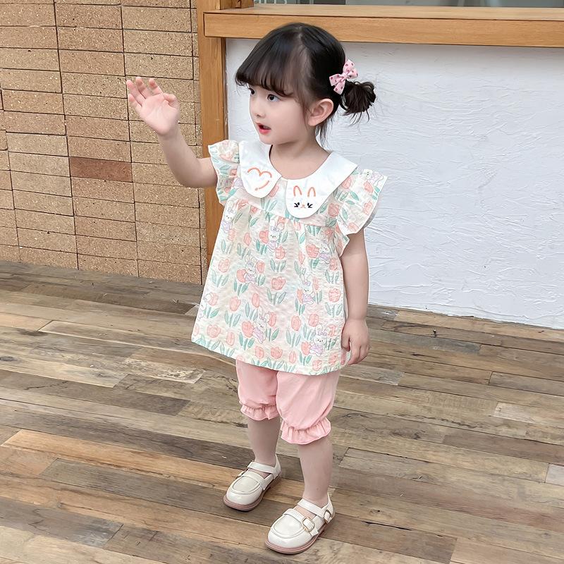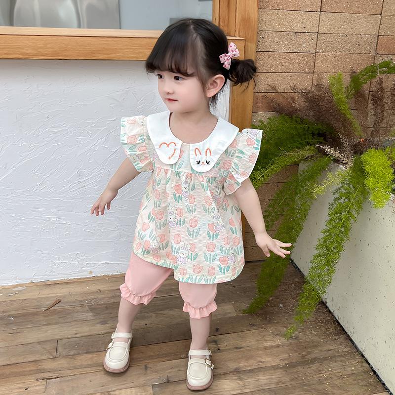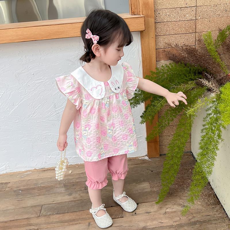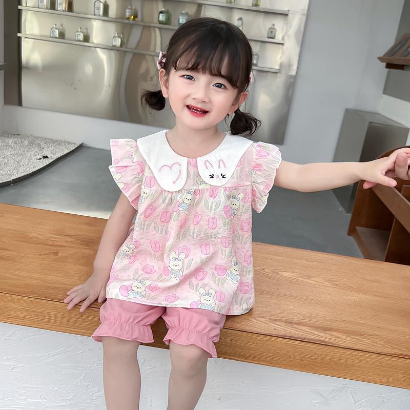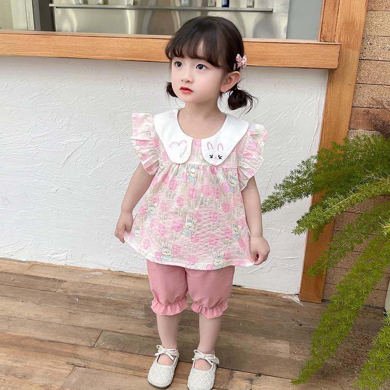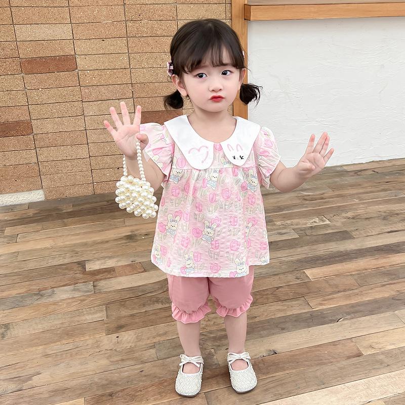 Traje de manga corta para niña Verano Delgado Nuevo Infantil Bebé Estilo Occidental Dibujos Animados Estampado de cuerpo completo Conejo Casual Conjunto de dos piezas