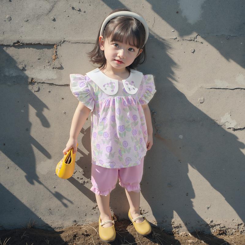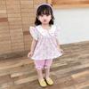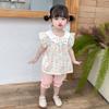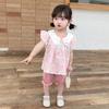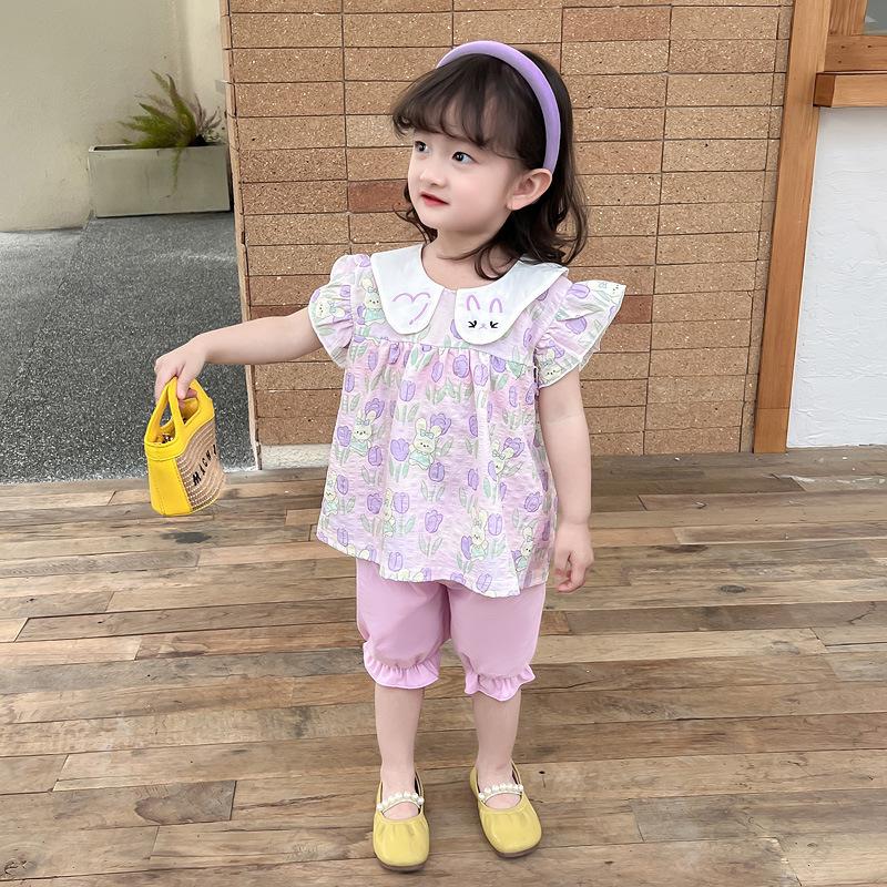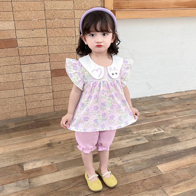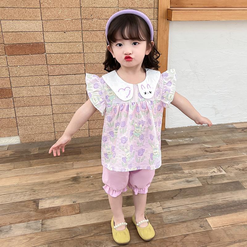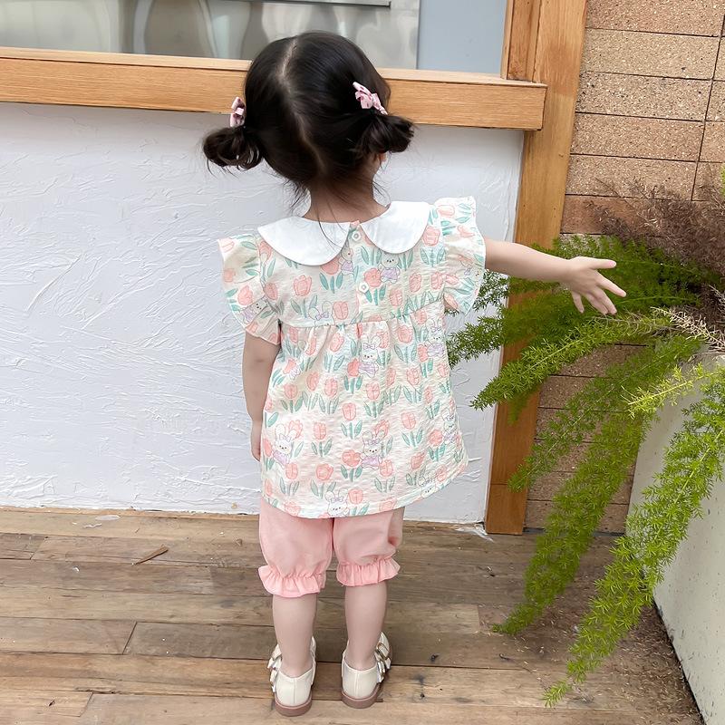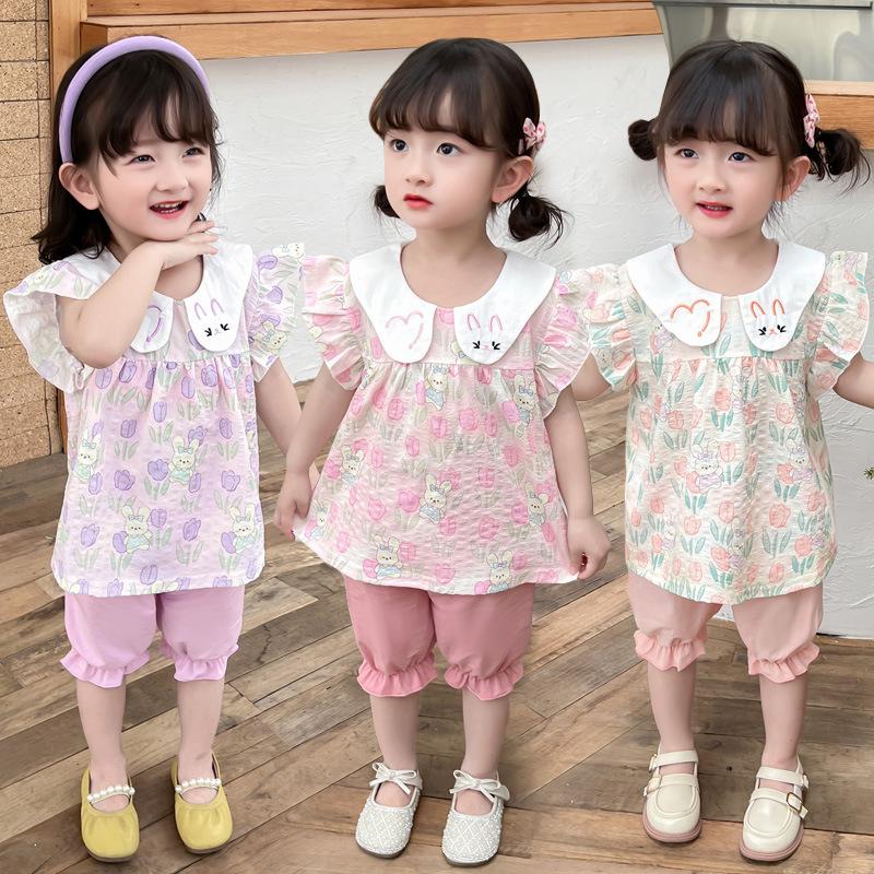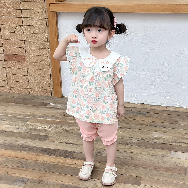 Traje de manga corta para niña Verano Delgado Nuevo Infantil Bebé Estilo Occidental Dibujos Animados Estampado de cuerpo completo Conejo Casual Conjunto de dos piezas