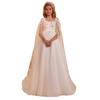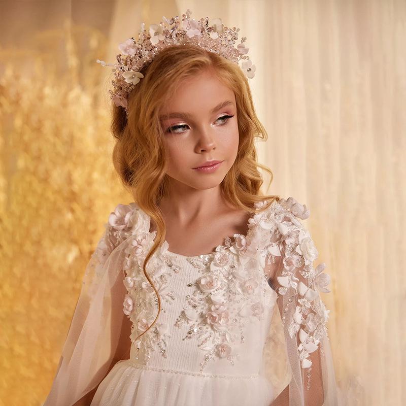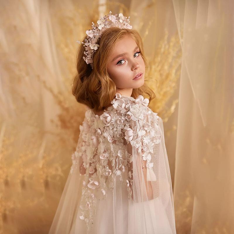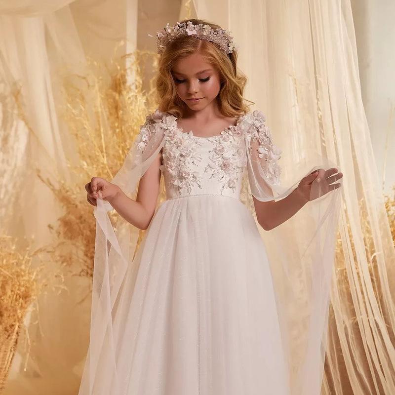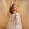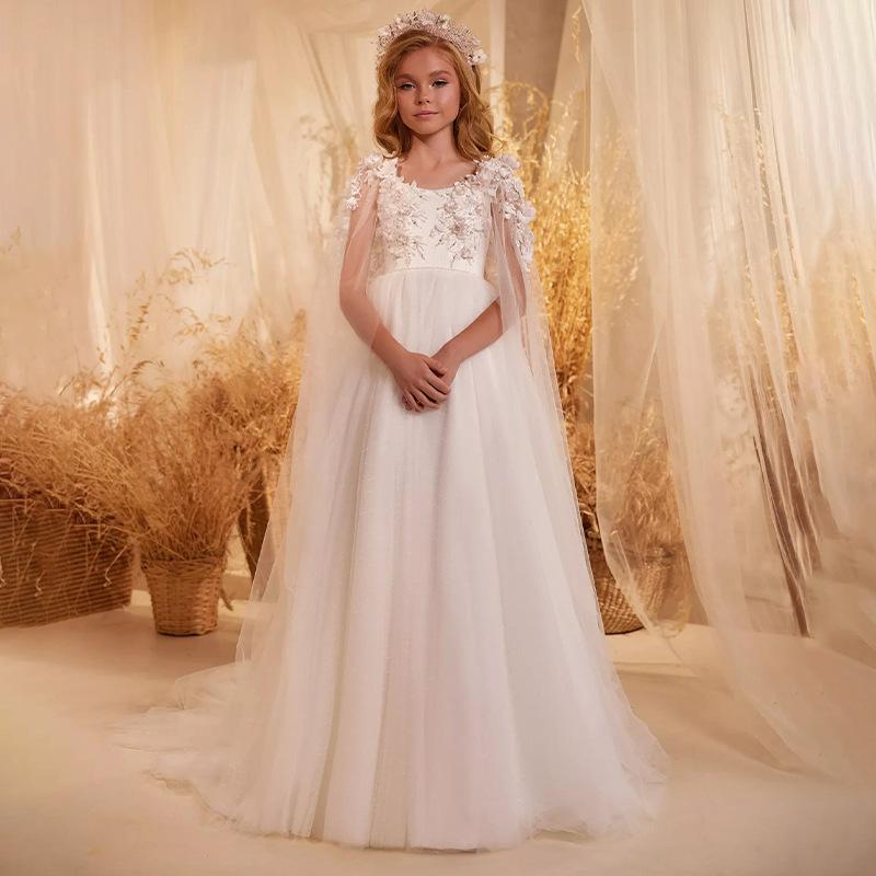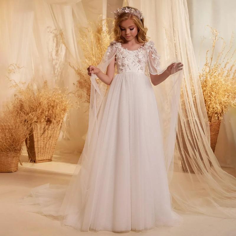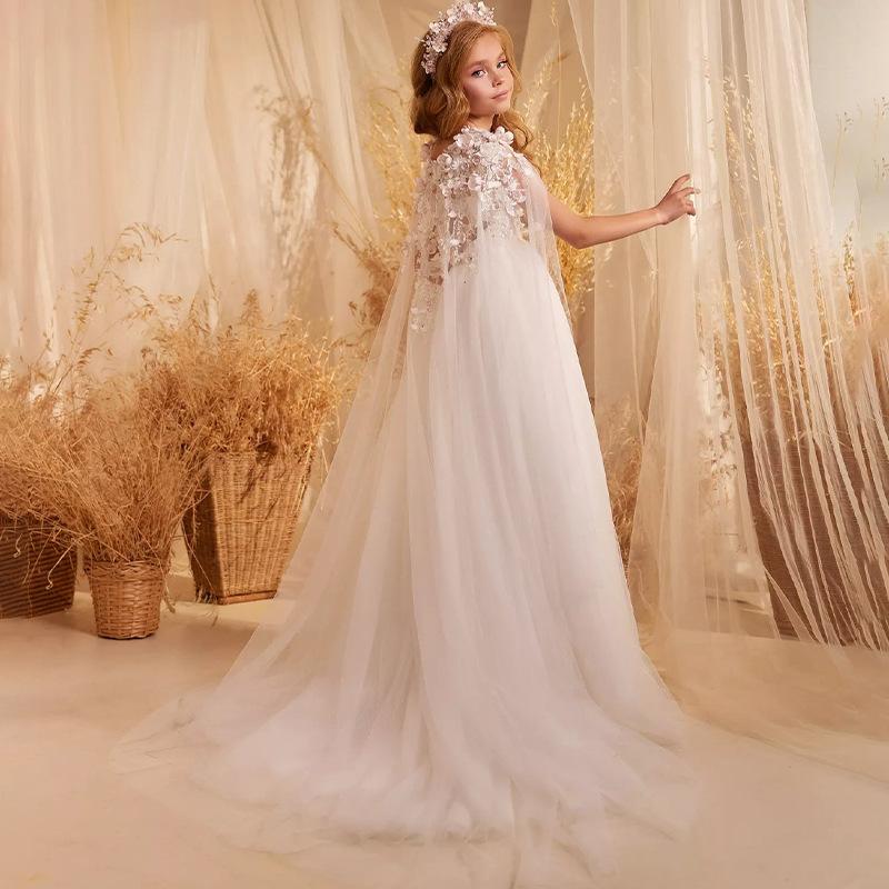 Nuevo Chal Vestido de Niña de las Flores Vestido de Noche para Niños Falda Larga con Cola para Niña Vestido de Princesa de Malla Aplicada para Niña