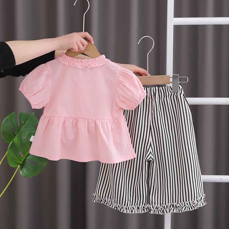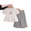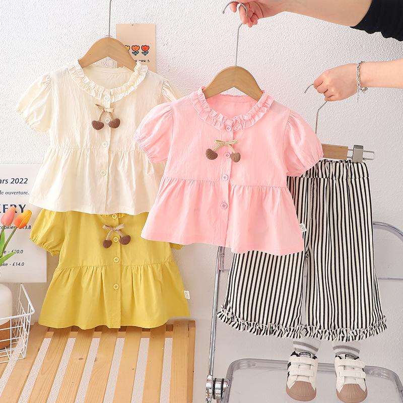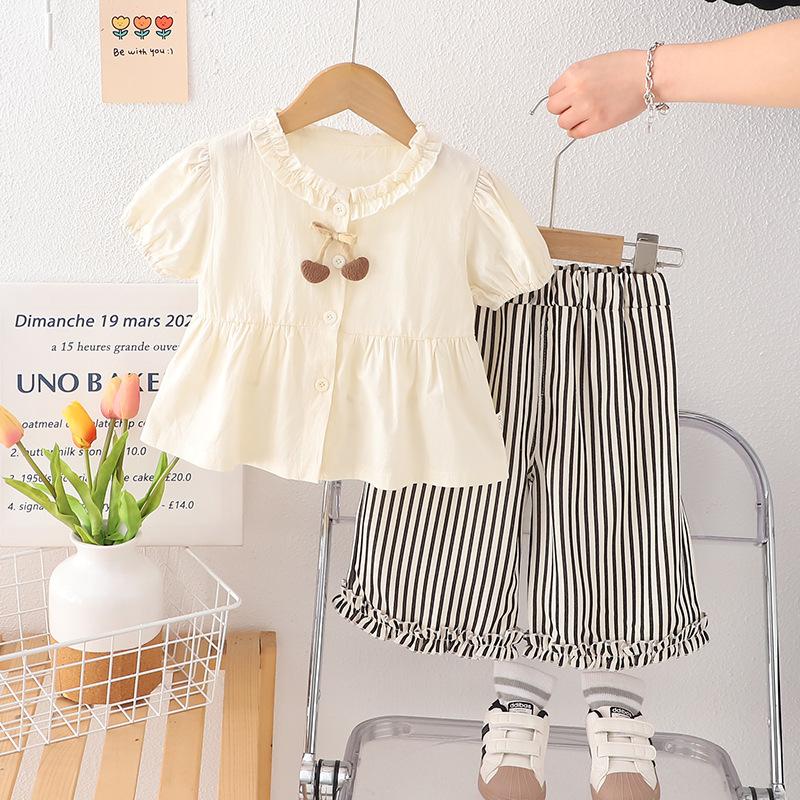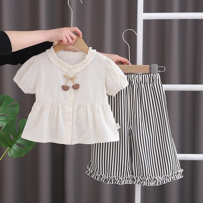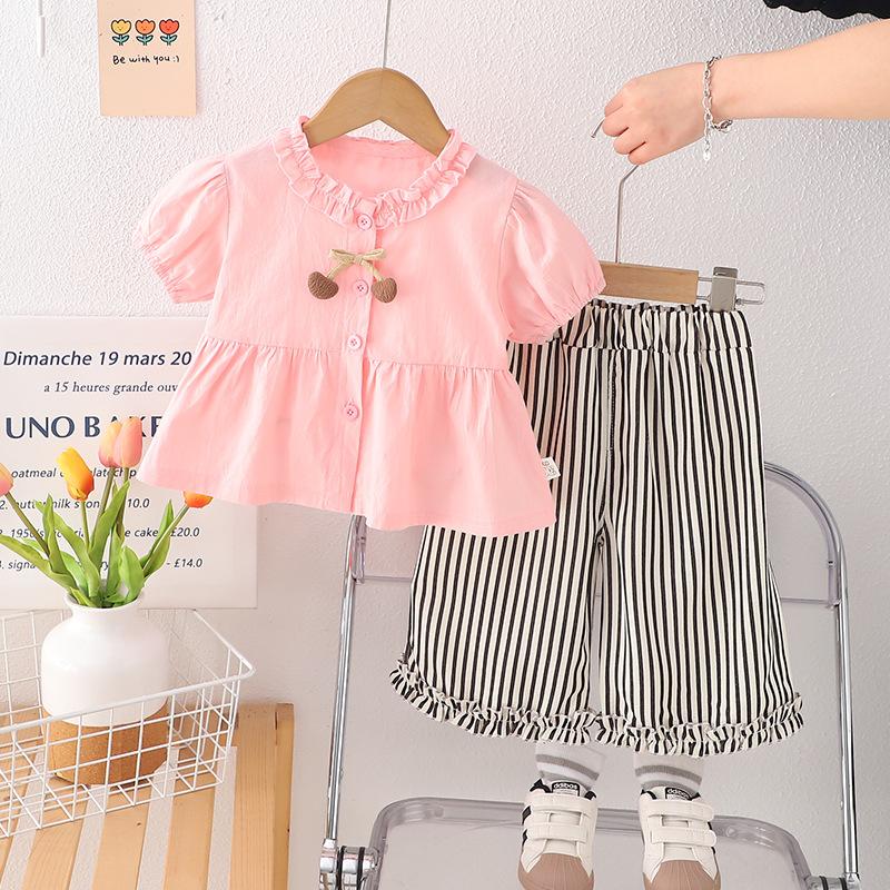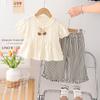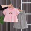 Vestido Delgado de Verano para Bebé Niña 2025 Nuevo Traje de Encaje con Corazón de Manga Corta para Niña Pantalones de Rayas Verticales a la Moda para Niña