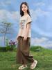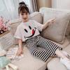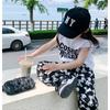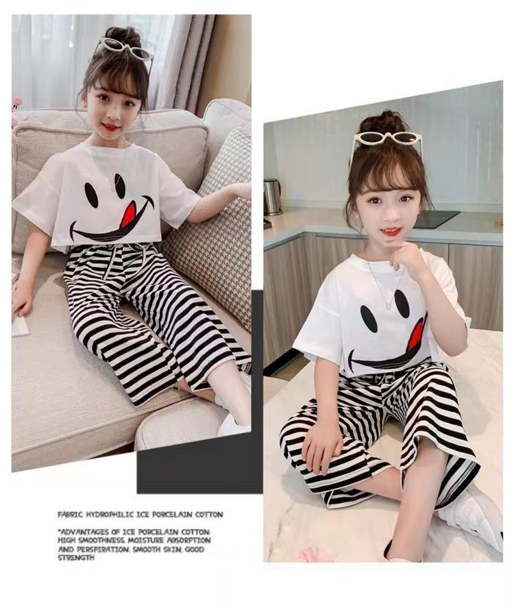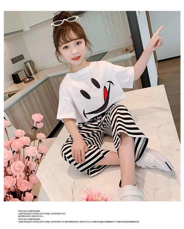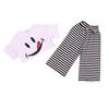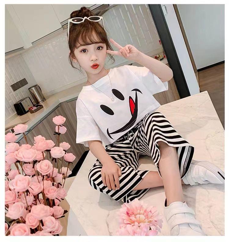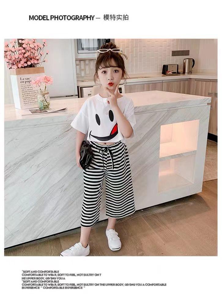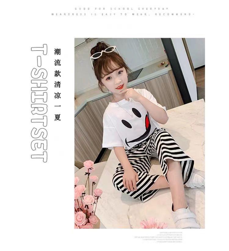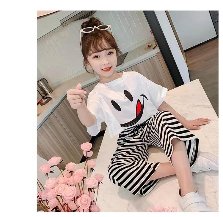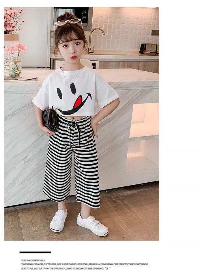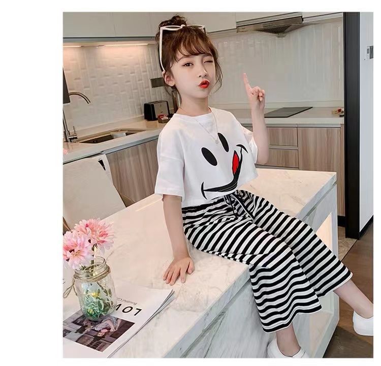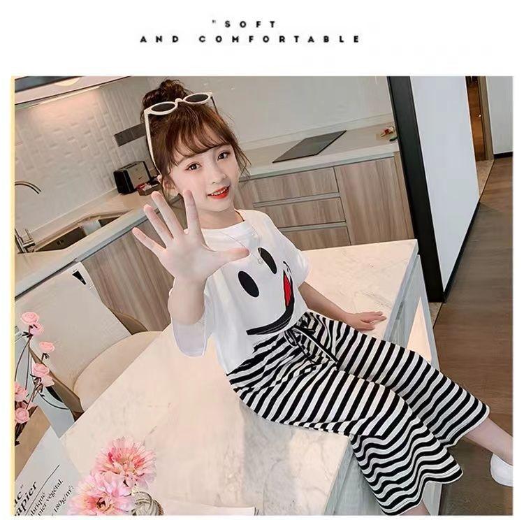 2025 Ropa Nueva para Niños Estilo Occidental Moda de Verano Niña Niña Pantalones Anchos a Rayas Camiseta Corta Conjunto de Dos Piezas Trendy