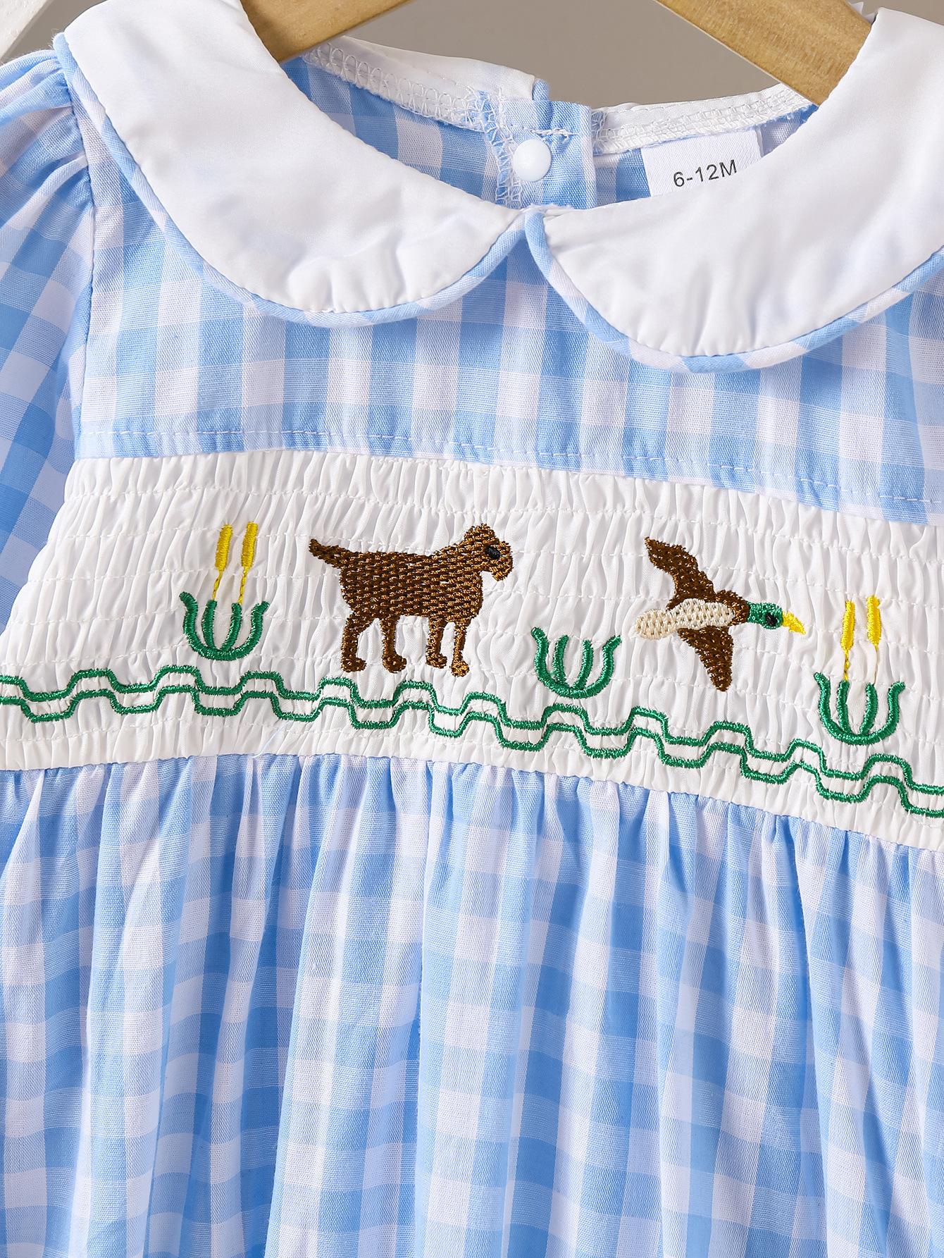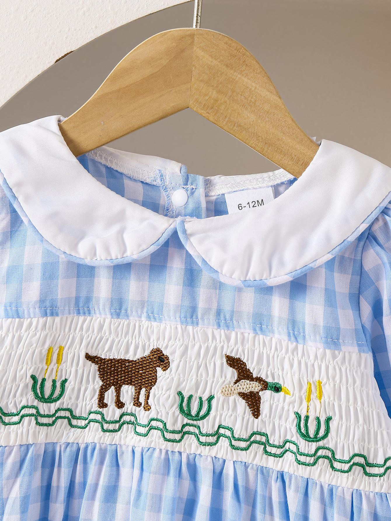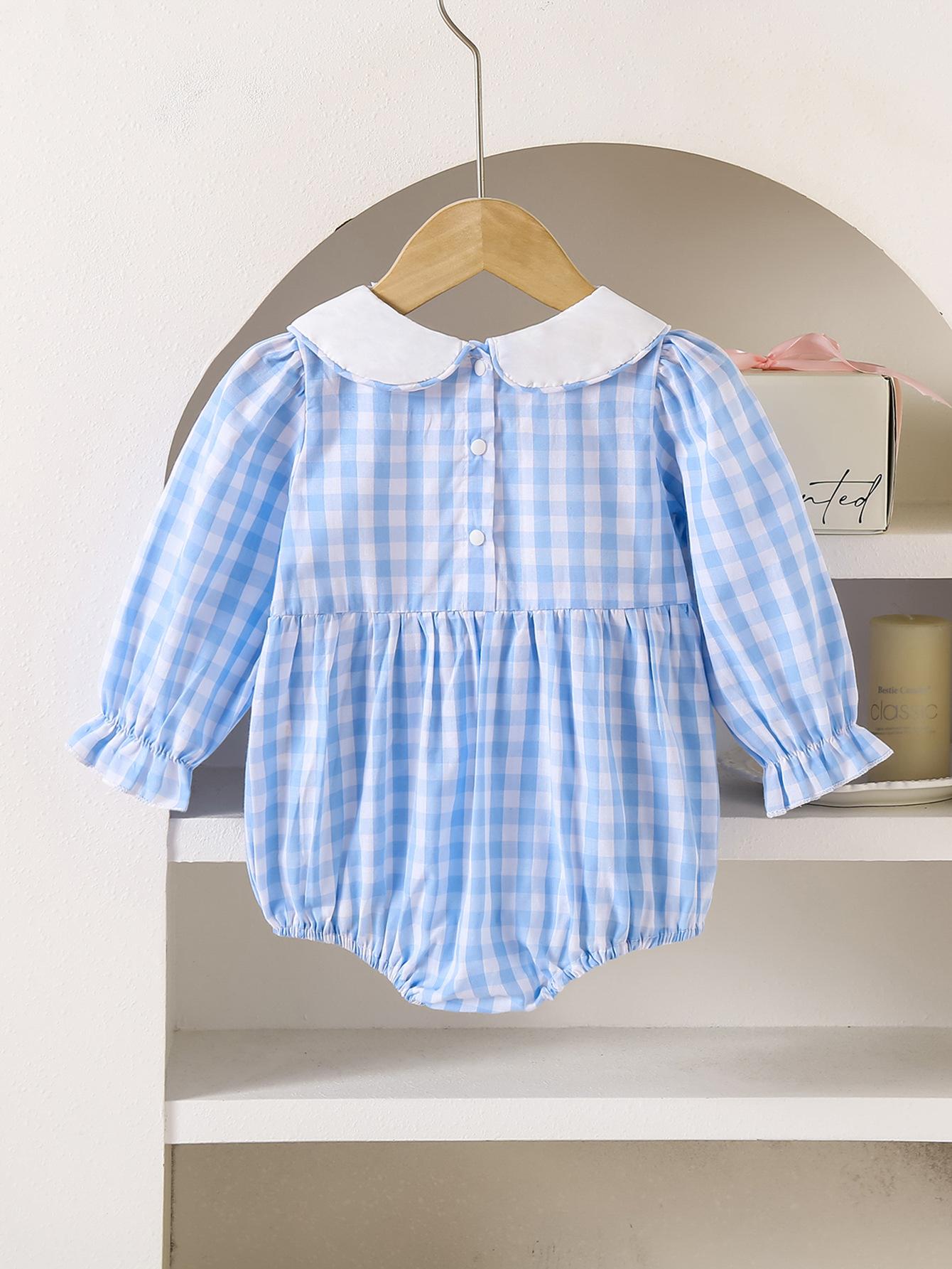 Nuevo Mameluco de Otoño para Niñas con Cuello de Muñeca Transfronterizo, Bordado de Manga Larga a Cuadros Azules, Mameluco Resistente