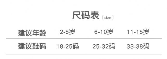 2-5 years old [recommended shoe size 18-25], 6-10 years old [recommended shoe size 25-32], 11-15 years old [re...