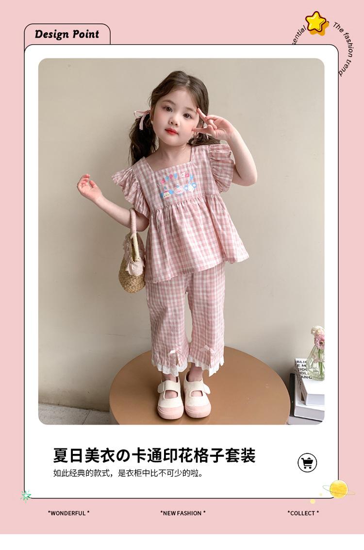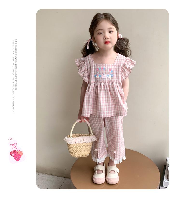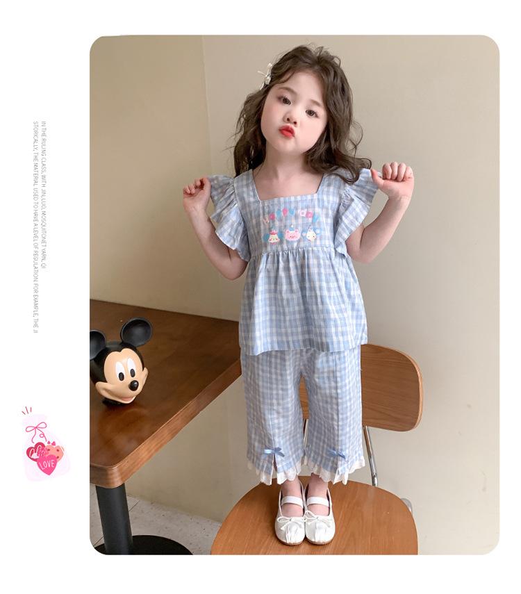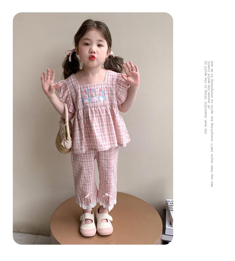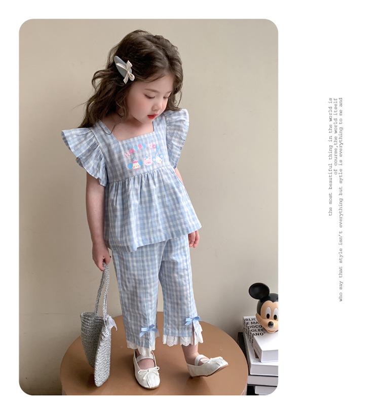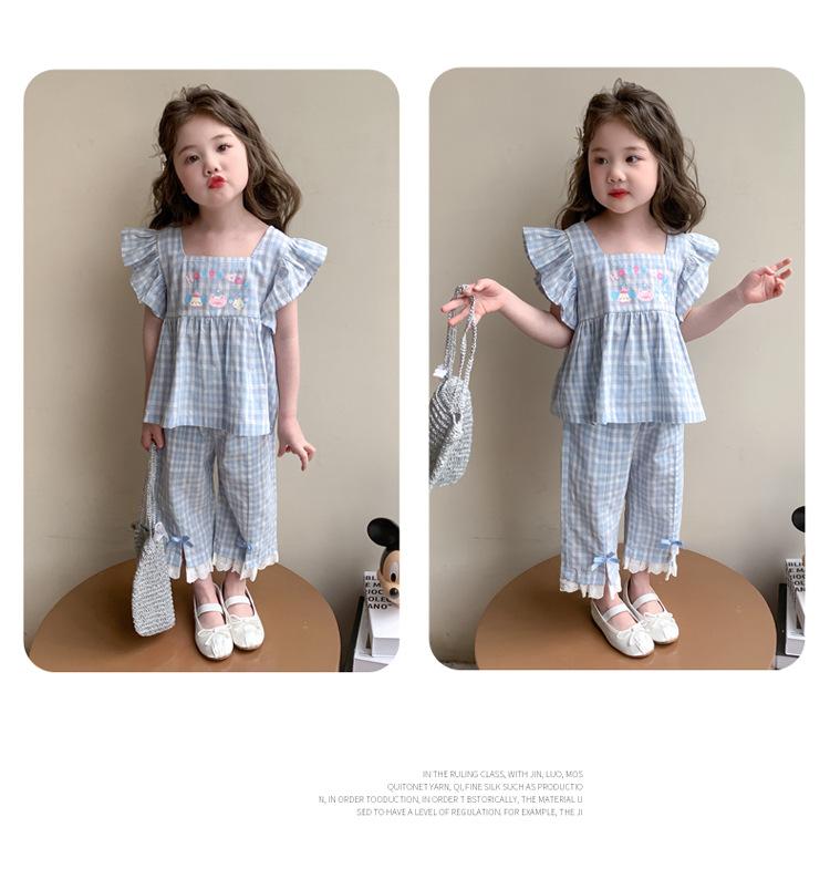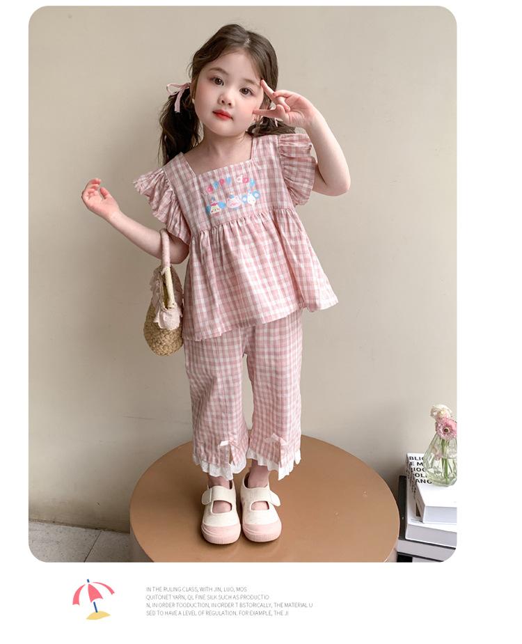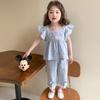 Traje a cuadros estampado de manga volada para niñas 2025 Verano Nueva Moda Niña Elegante Dos piezas Vestido de Verano para Niños