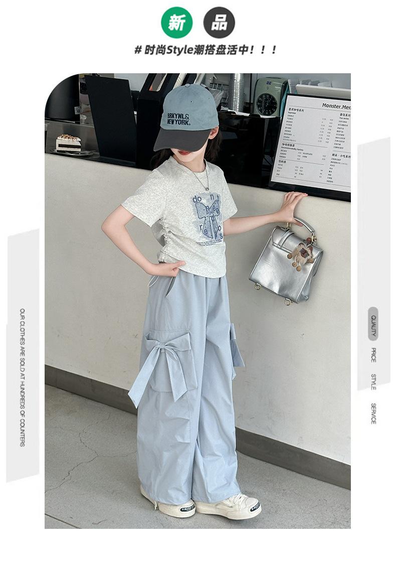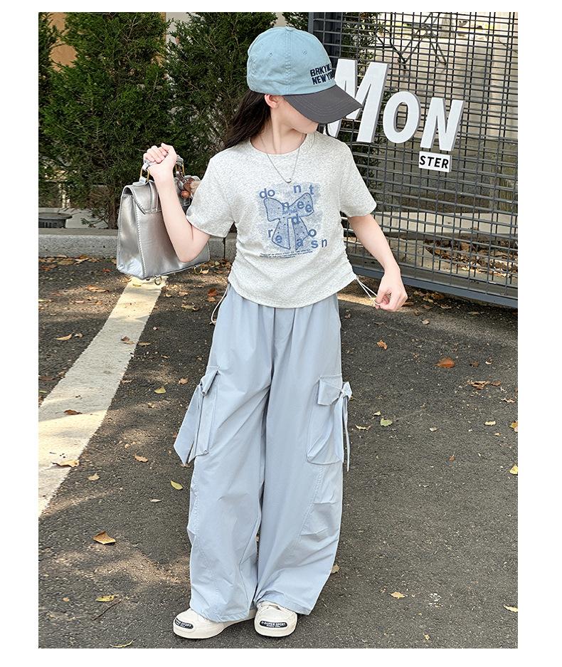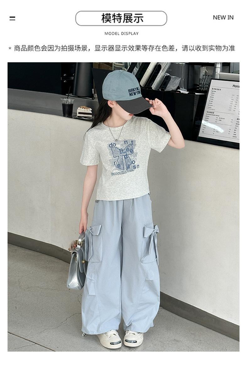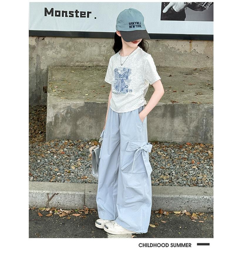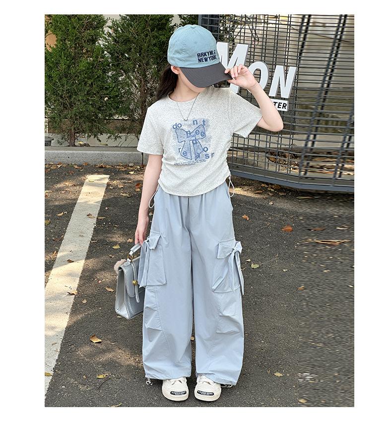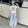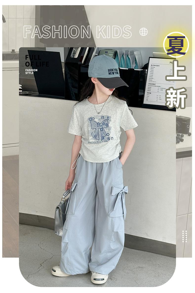 Conjunto de camiseta de verano para niña y pantalones de peto, para niños grandes, con cordón, lazo, manga corta y pantalones de pierna ancha, nuevo 2025, versión coreana