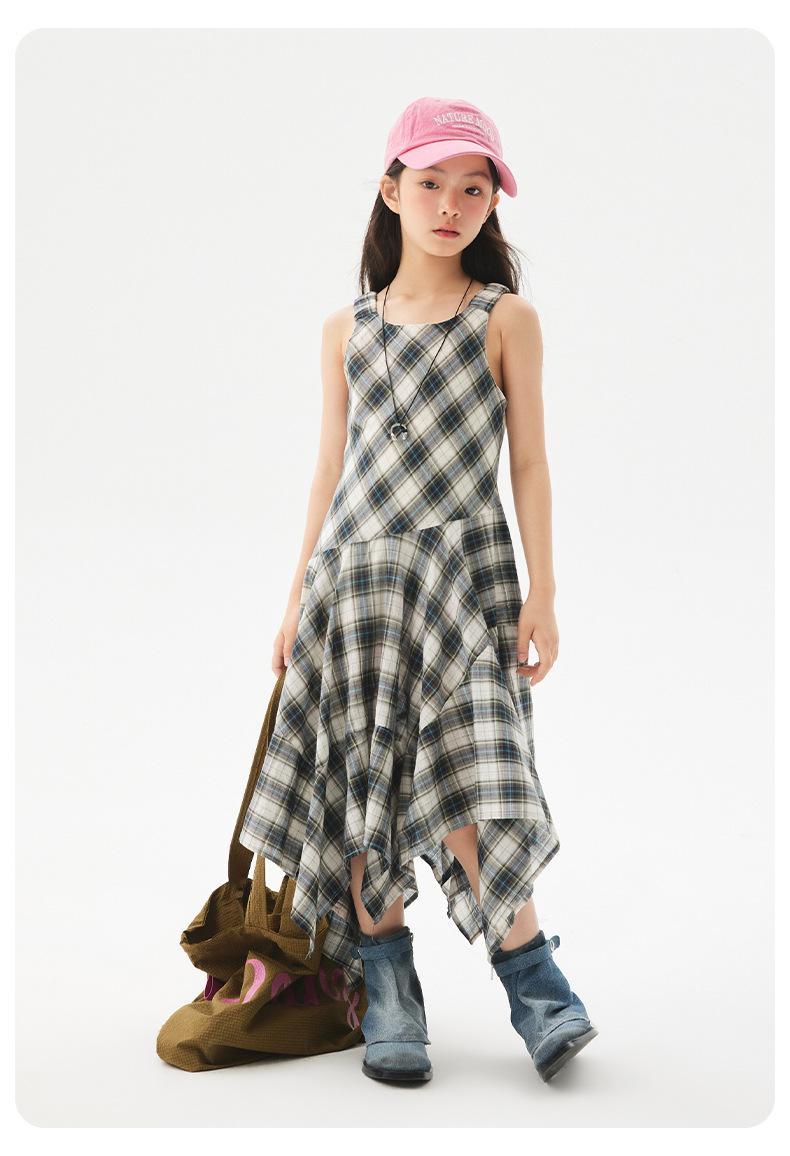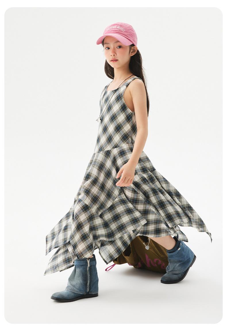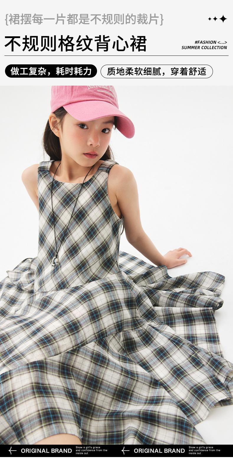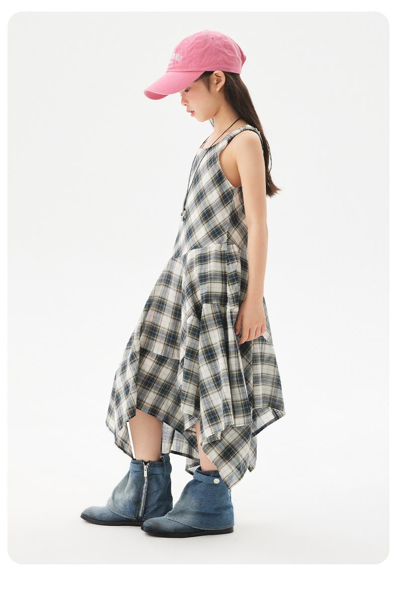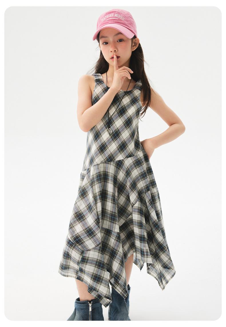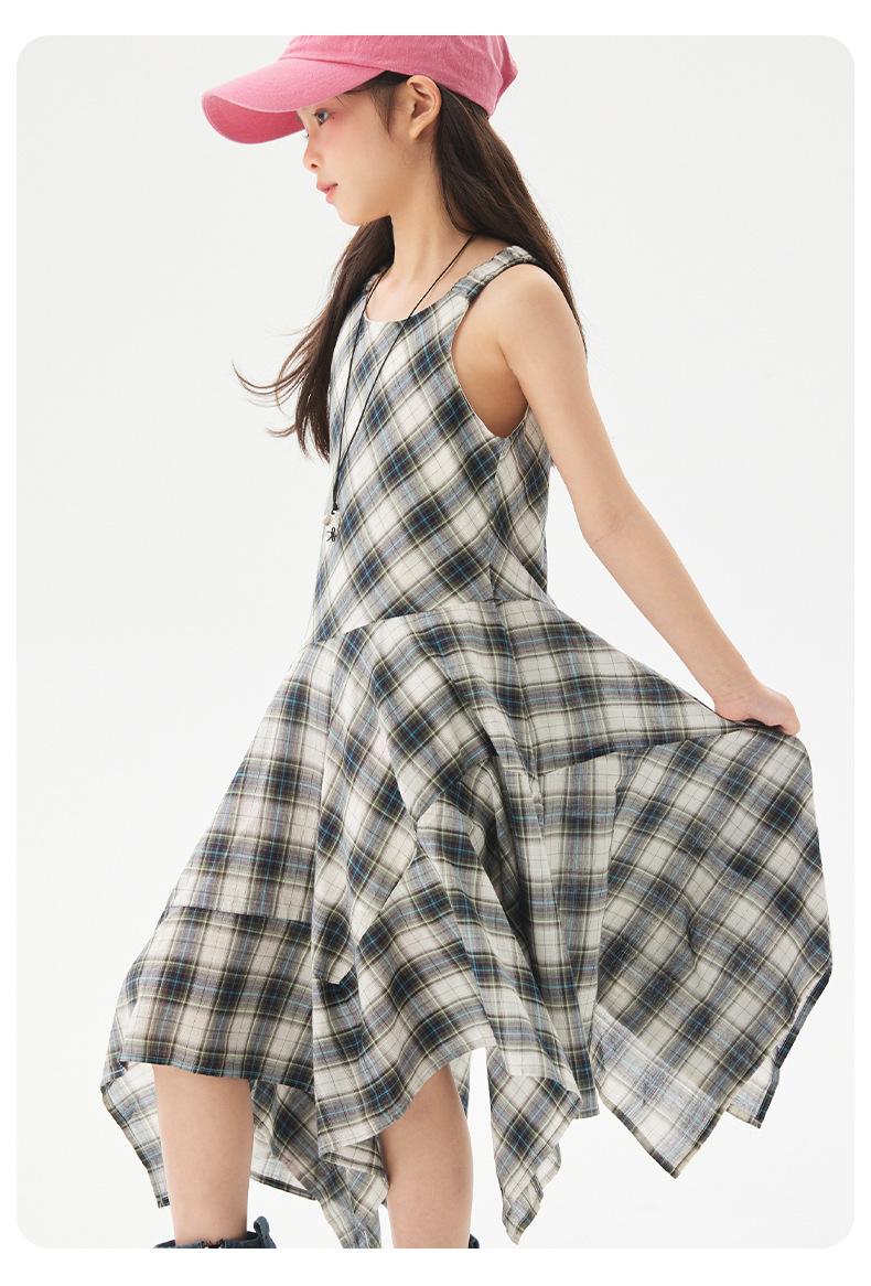 Falda casual de cuadros para niña 2025 Verano Nuevo Falda irregular sin mangas para niños Vestido de verano para niños grandes