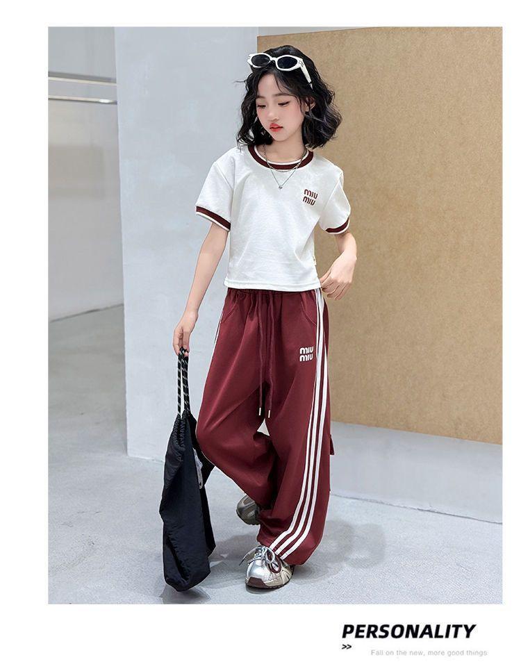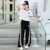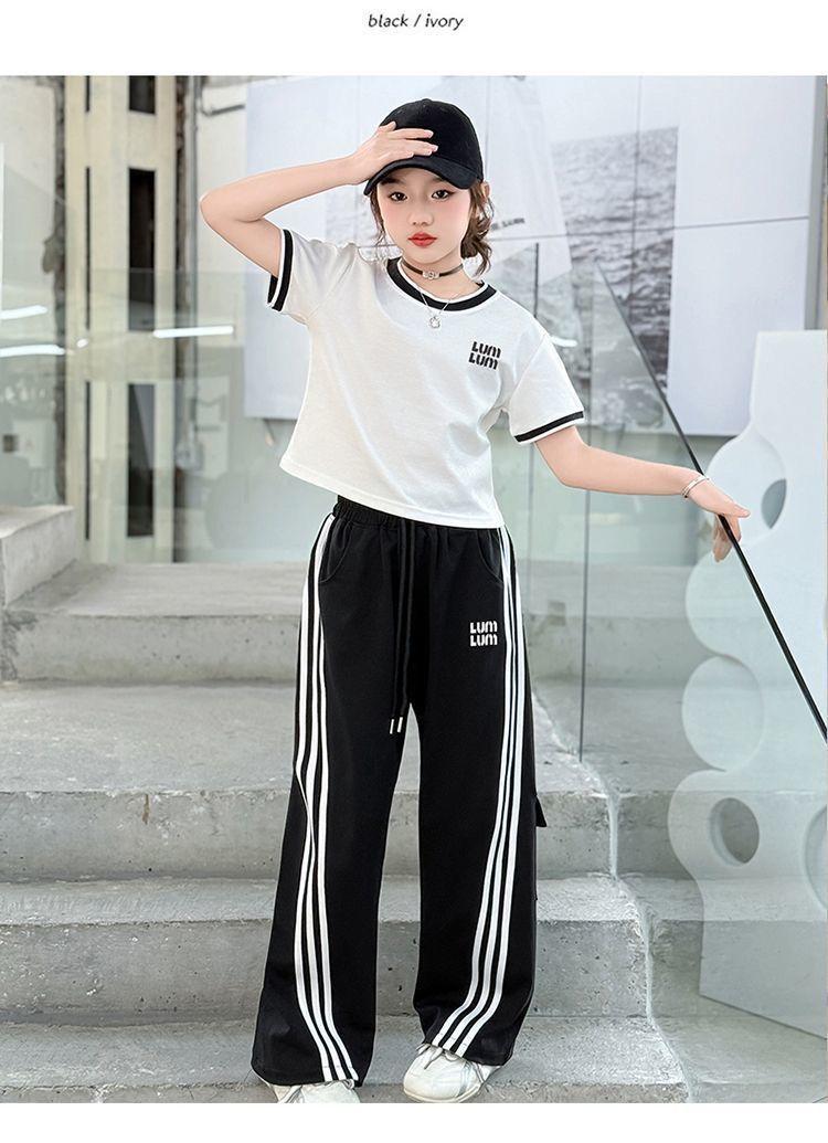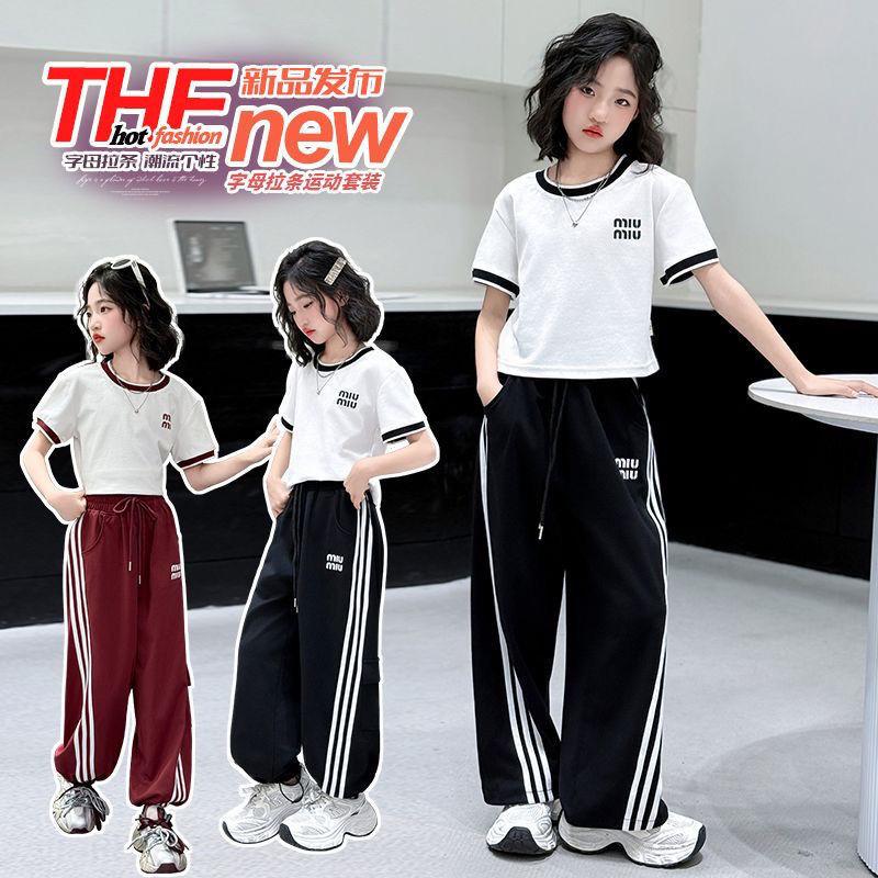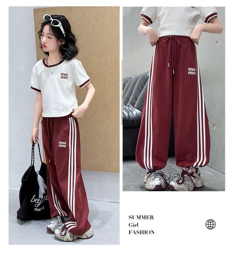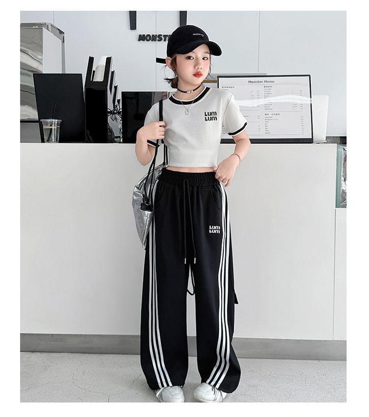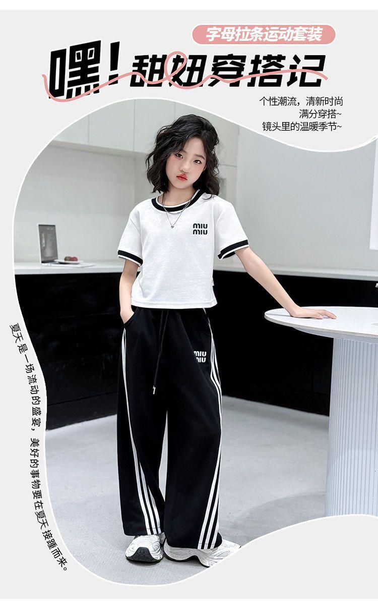 Traje deportivo de rayas estilo coreano para niñas, nuevo top de manga corta con letras de moda de verano y pantalones largos modernos, conjunto de dos piezas para niños mayores