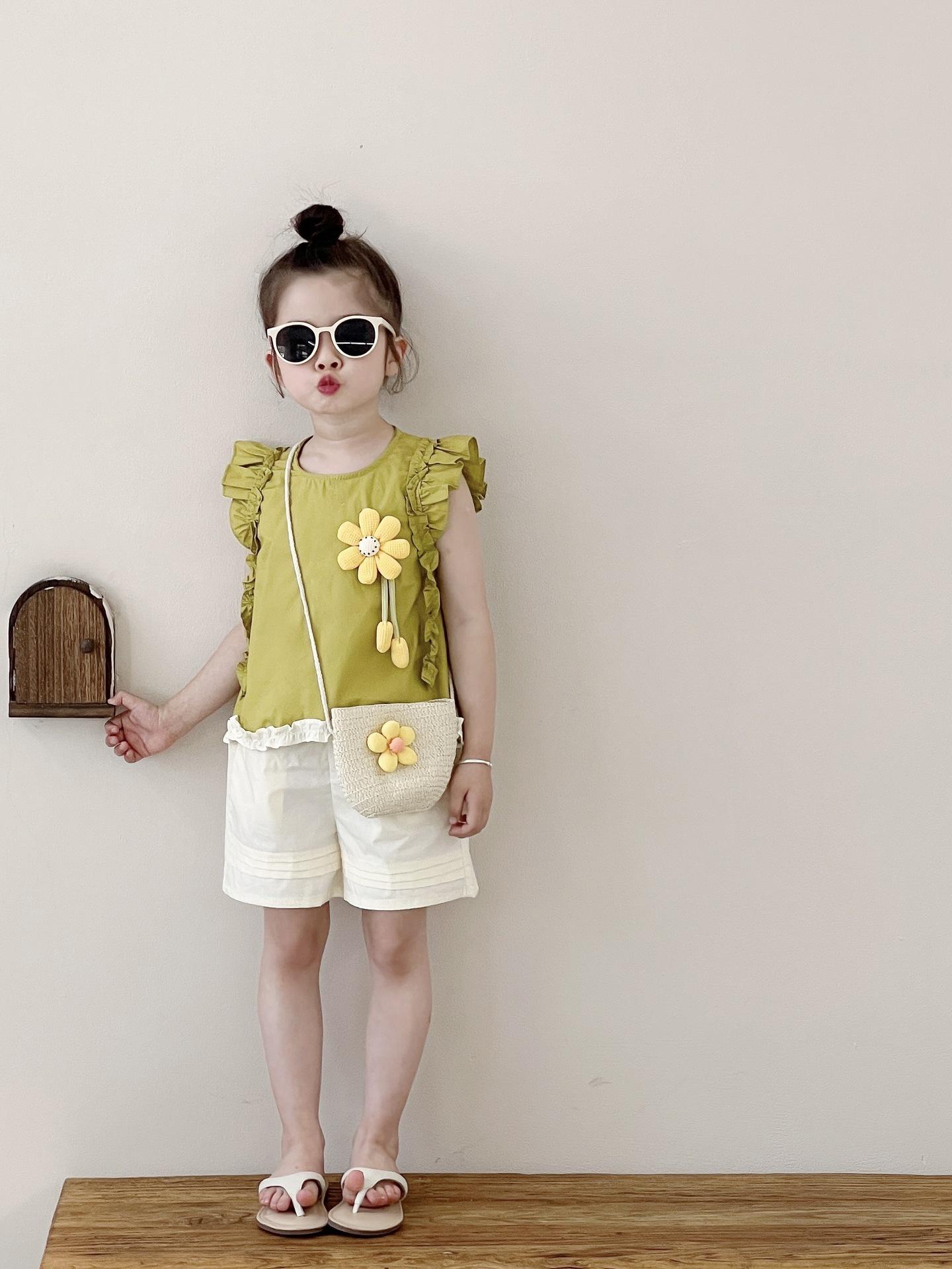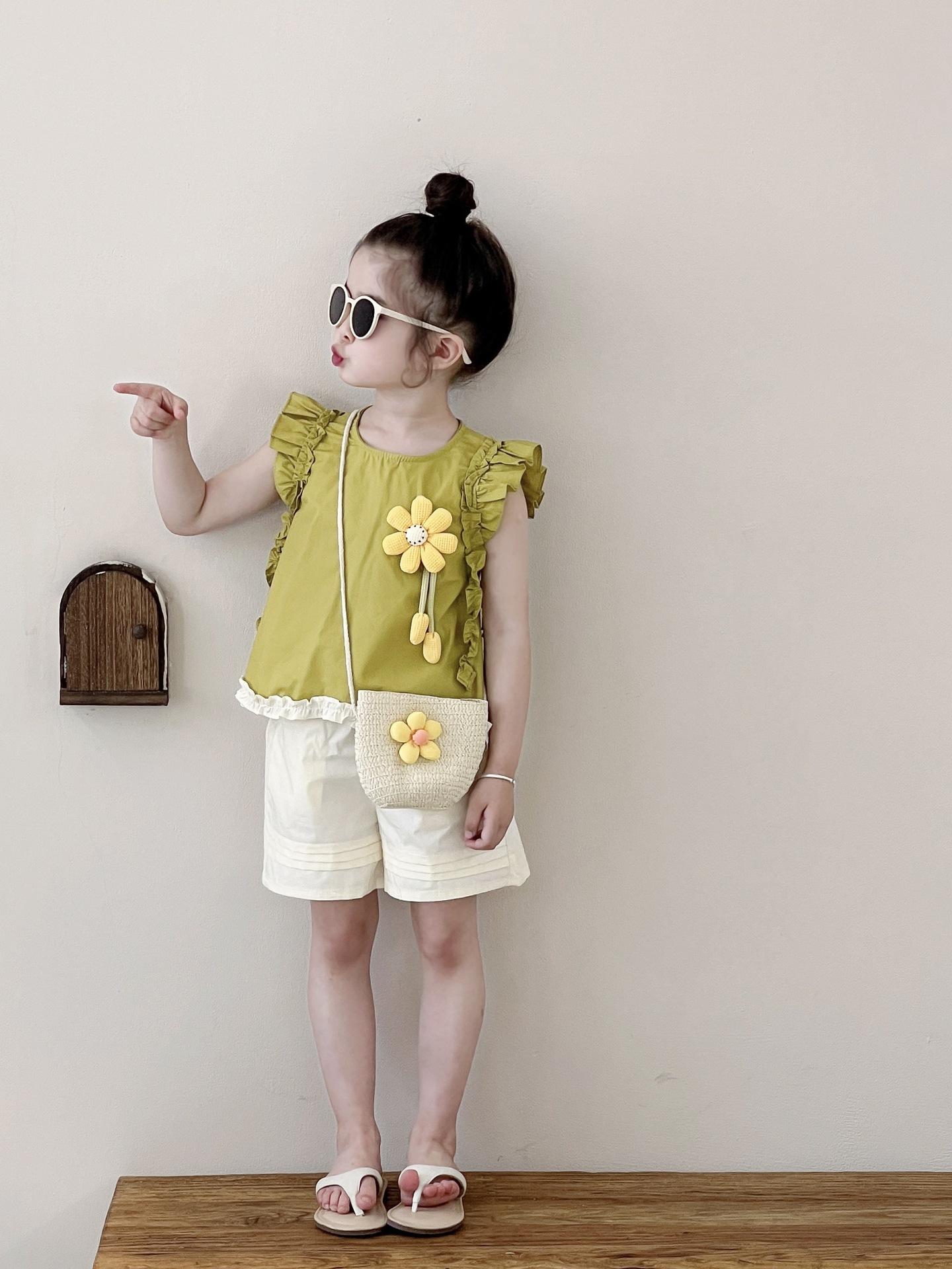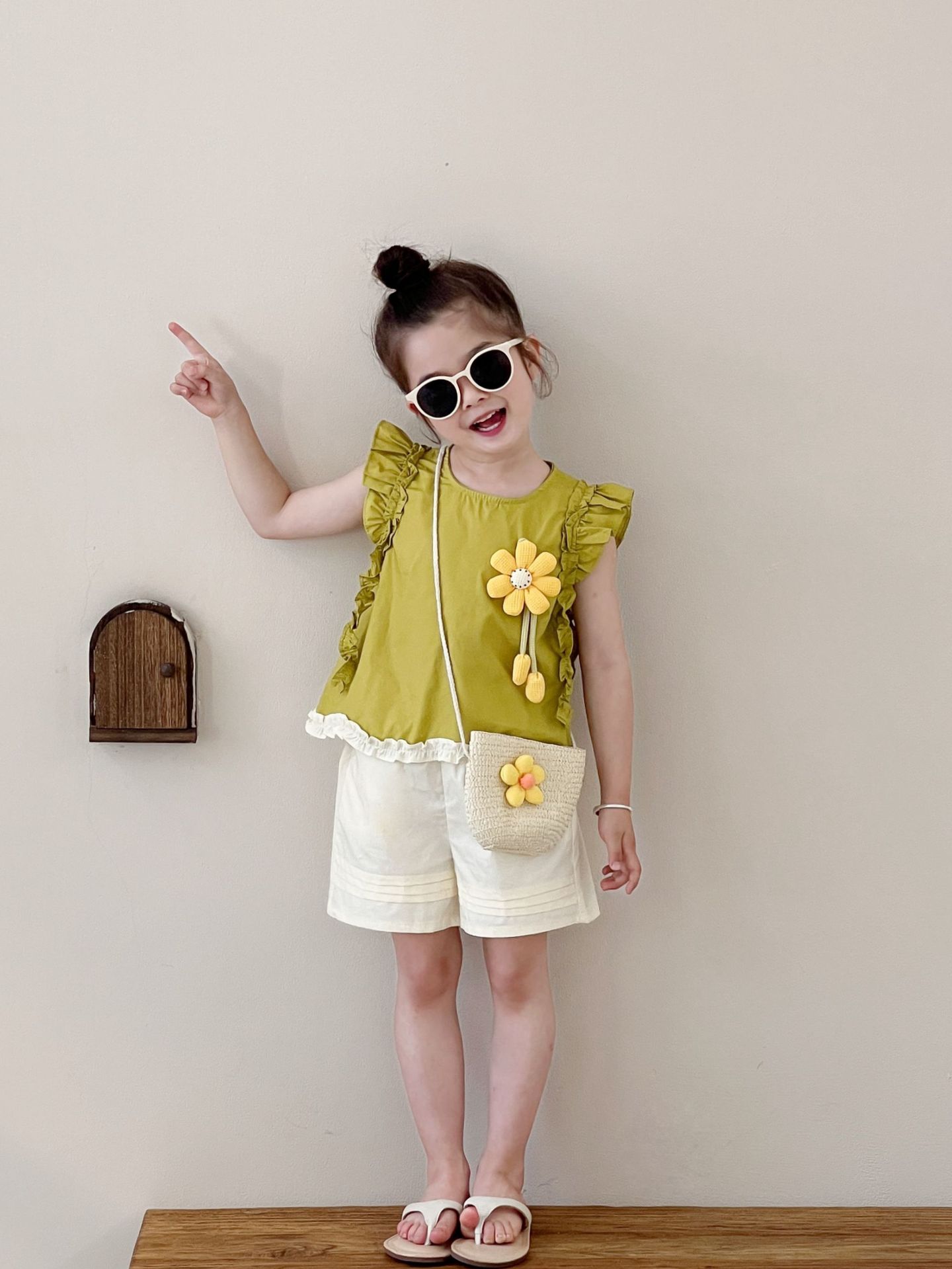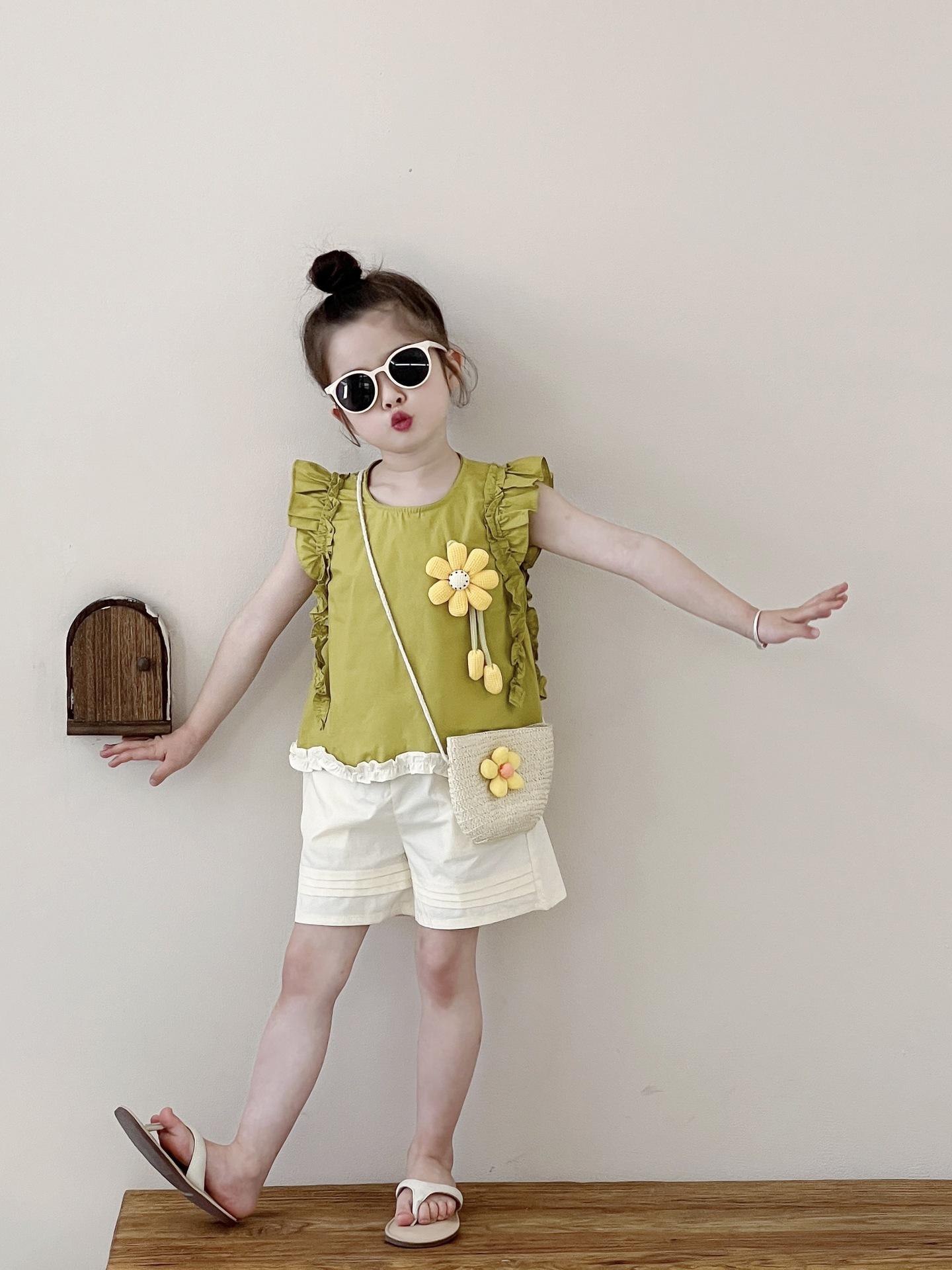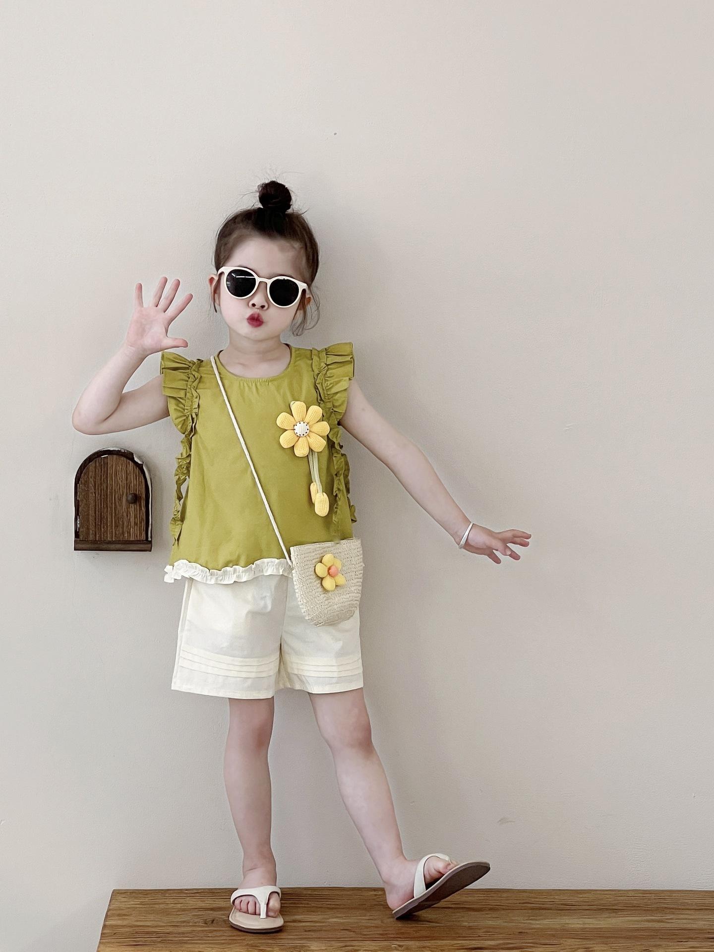 Nuevo Traje de Verano para Niñas, Moderno 2025 para Niños y Bebés, Top de Manga Volante con Flor Estéreo y Pantalón Botón Conjunto de Dos Piezas