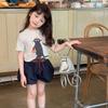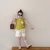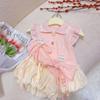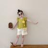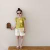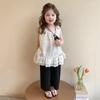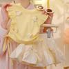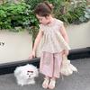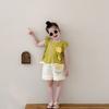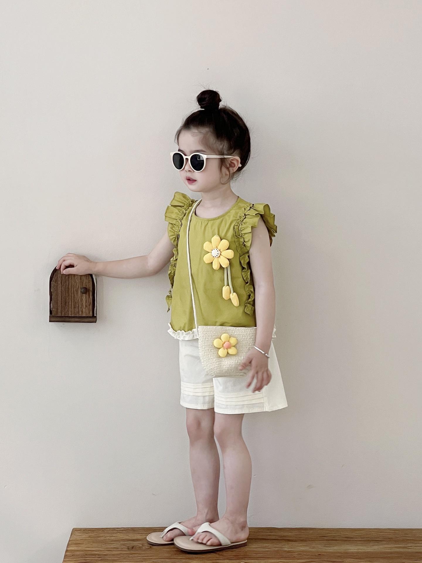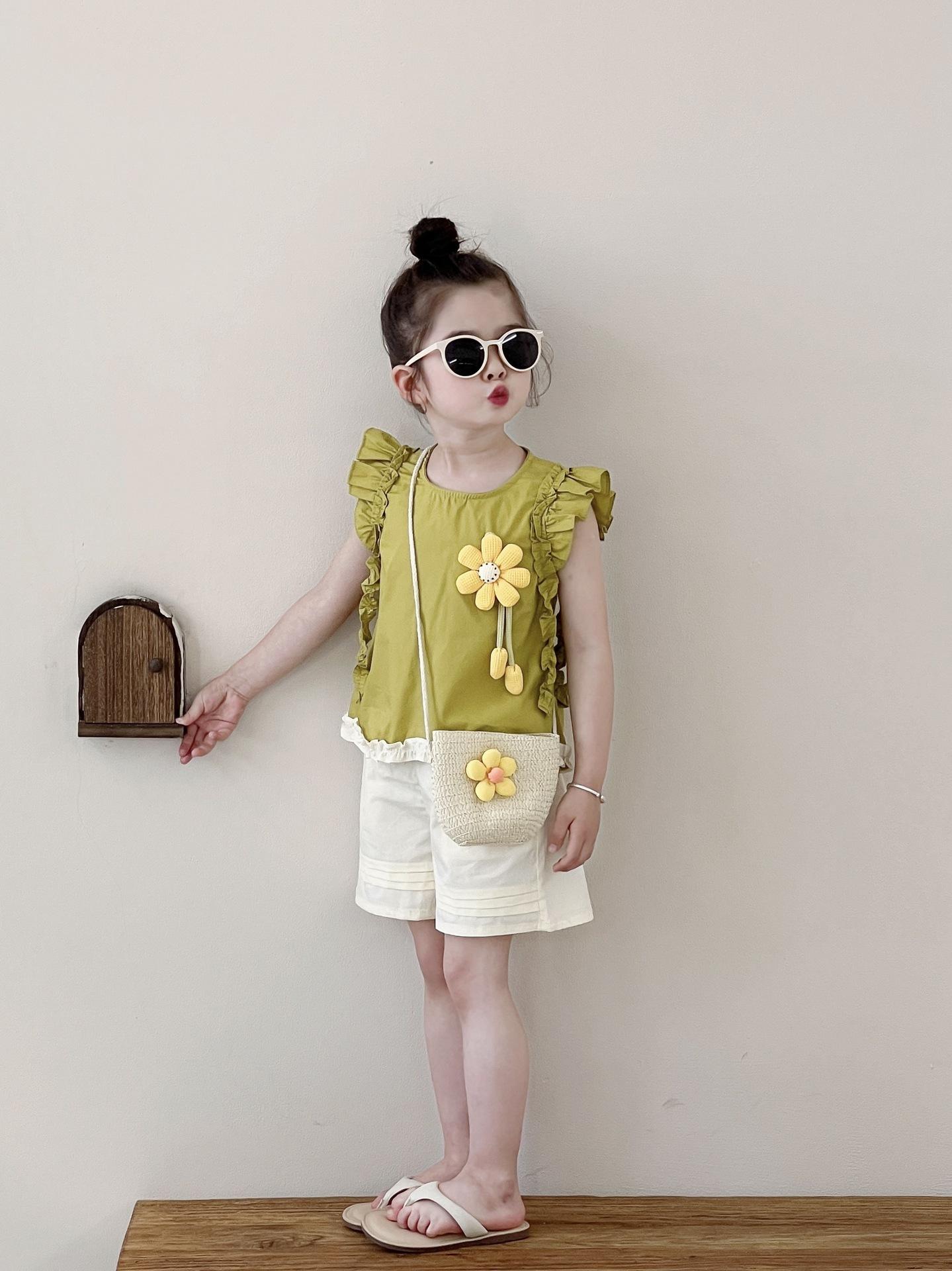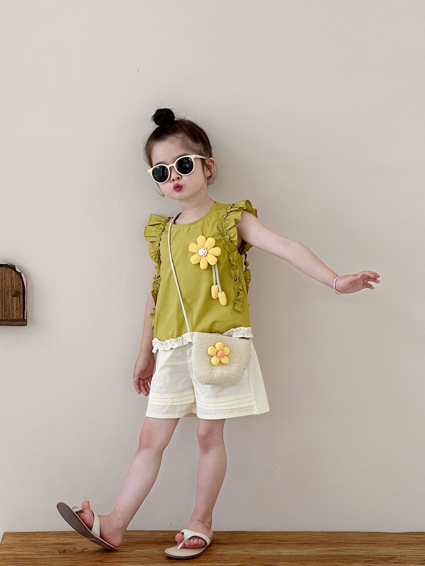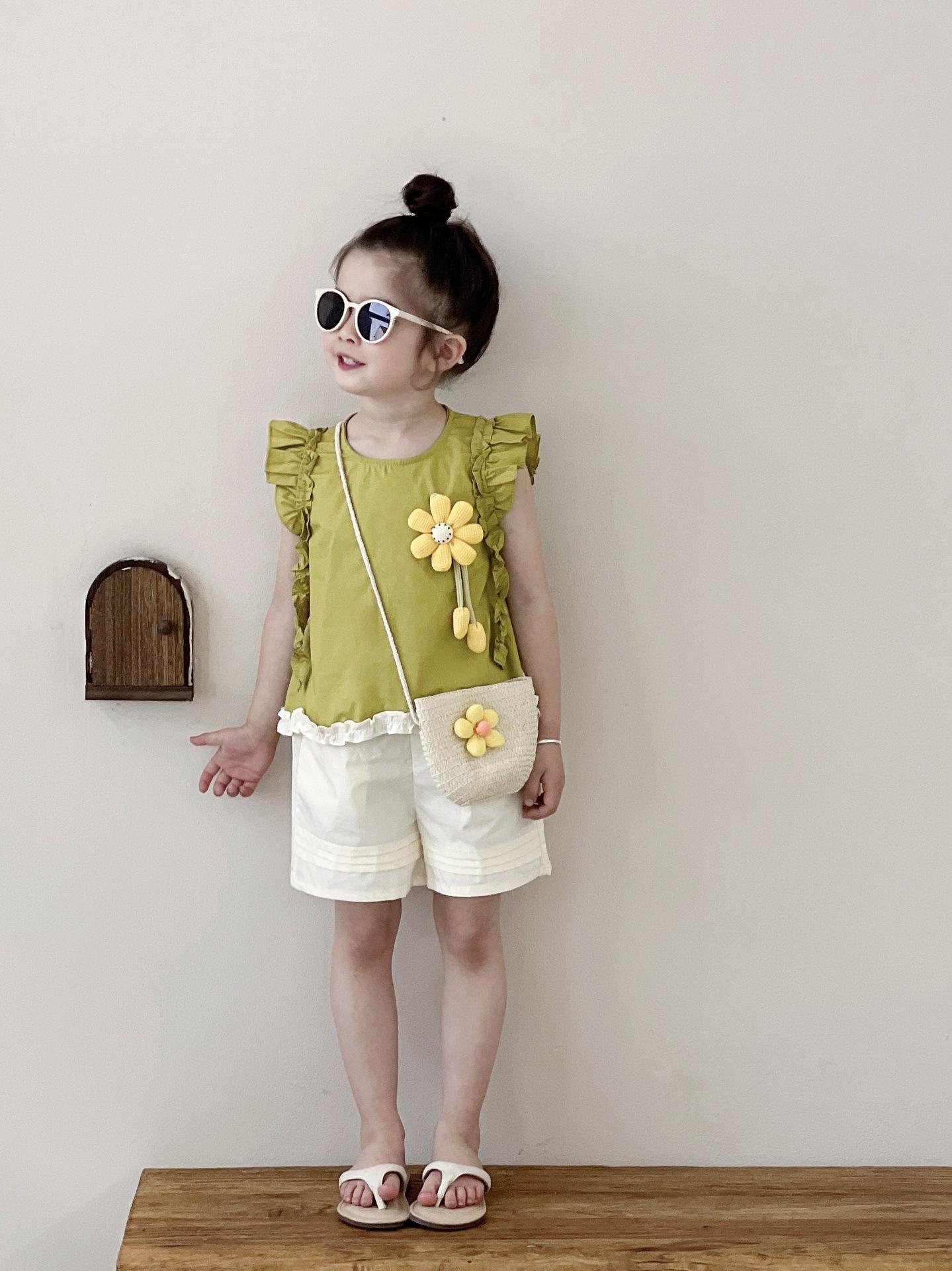 Nuevo Traje de Verano para Niñas, Moderno 2025 para Niños y Bebés, Top de Manga Volante con Flor Estéreo y Pantalón Botón Conjunto de Dos Piezas