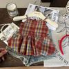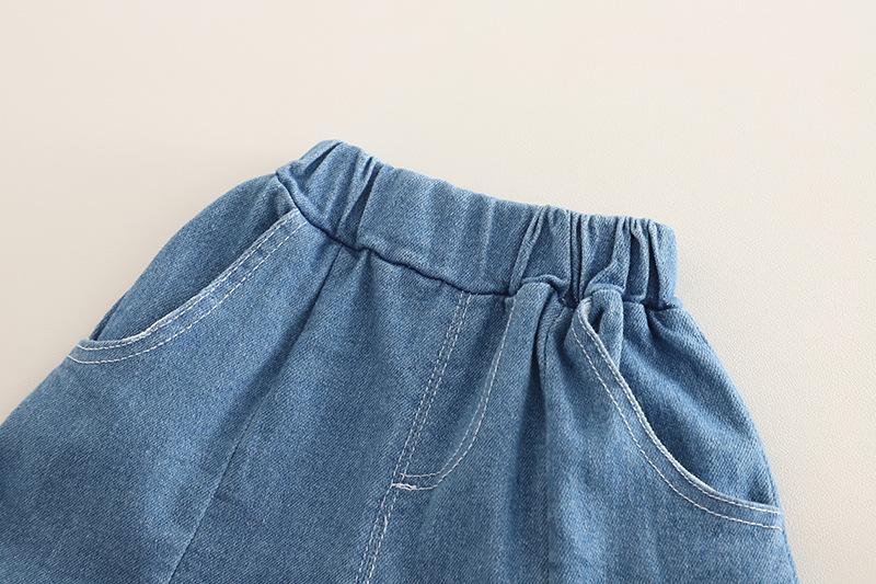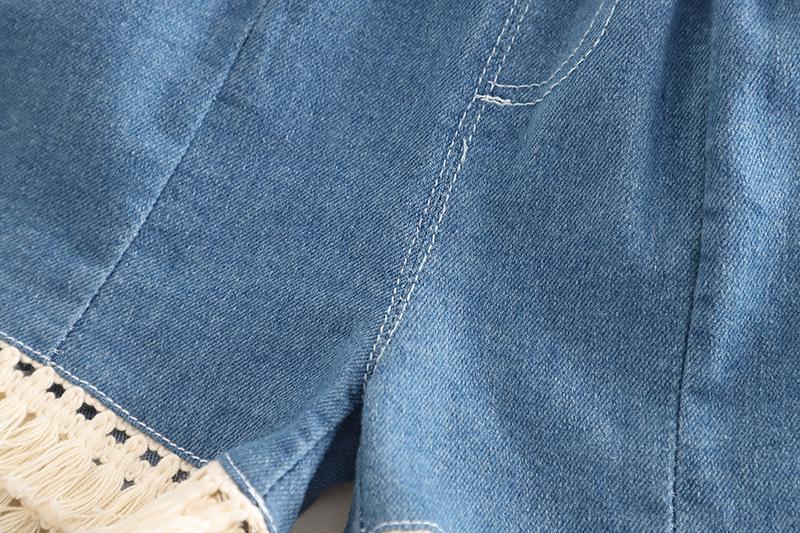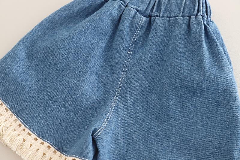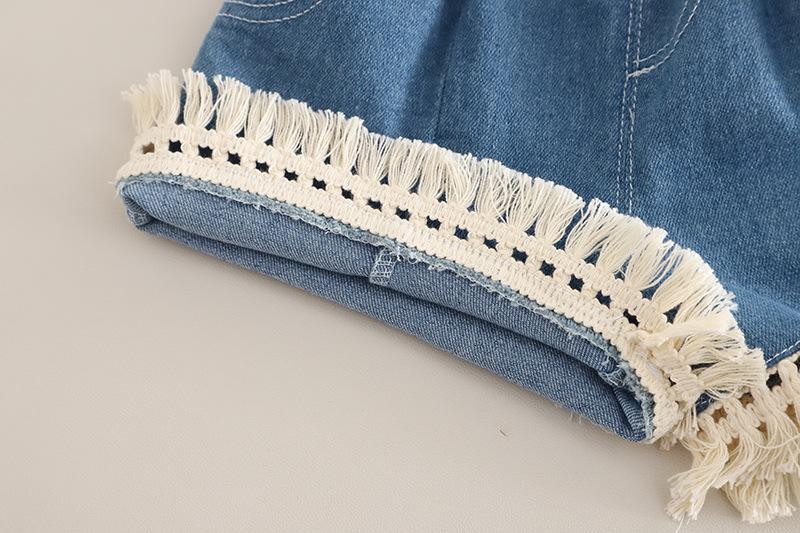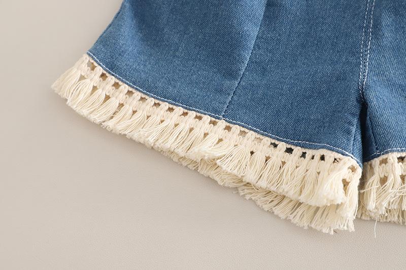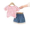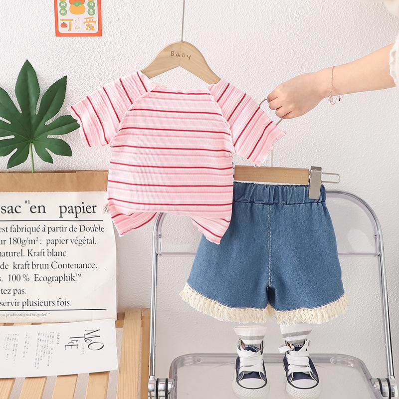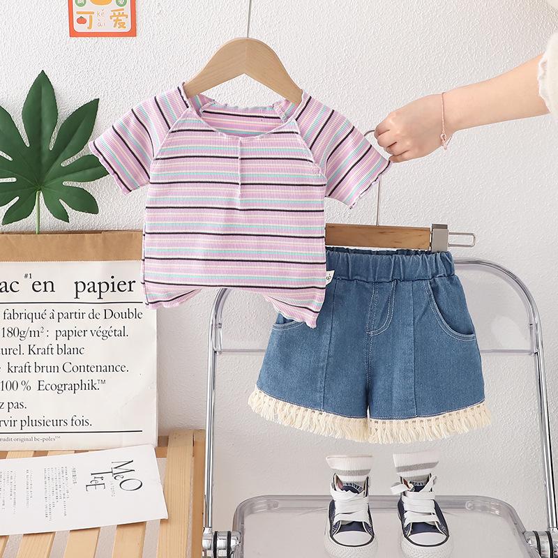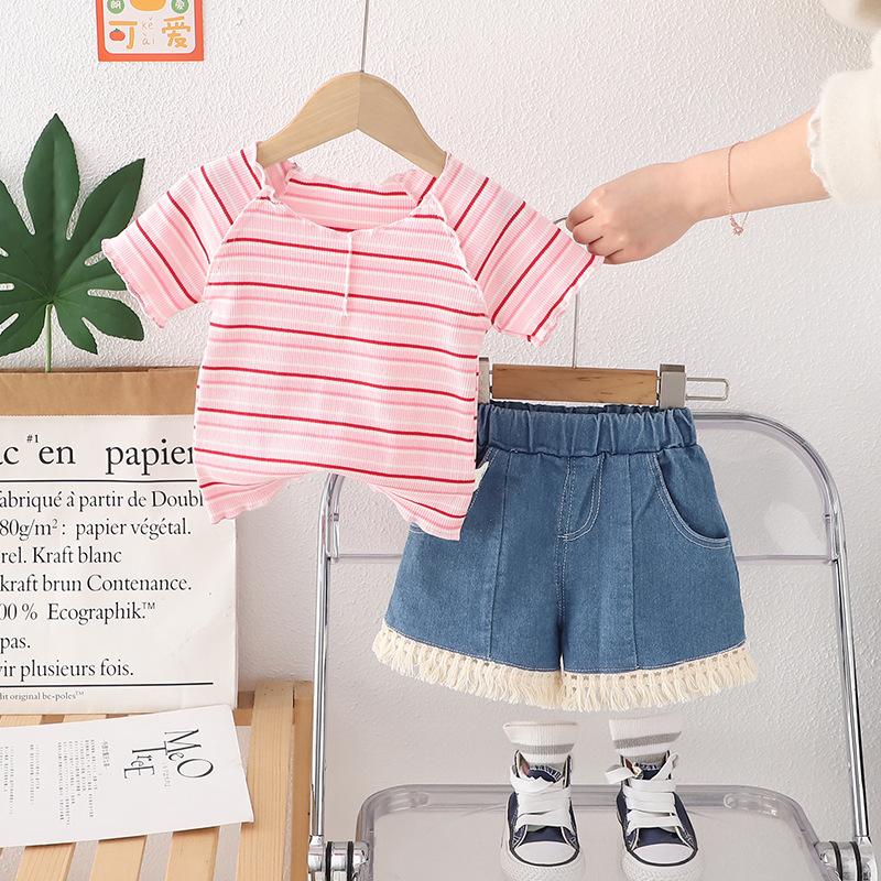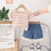 2025 Nuevo Verano para Niñas Ropa Infantil de Verano Niña Pequeña Verano Manga Corta Rayas Borla Shorts de Mezclilla Traje de Dos Piezas Trendy