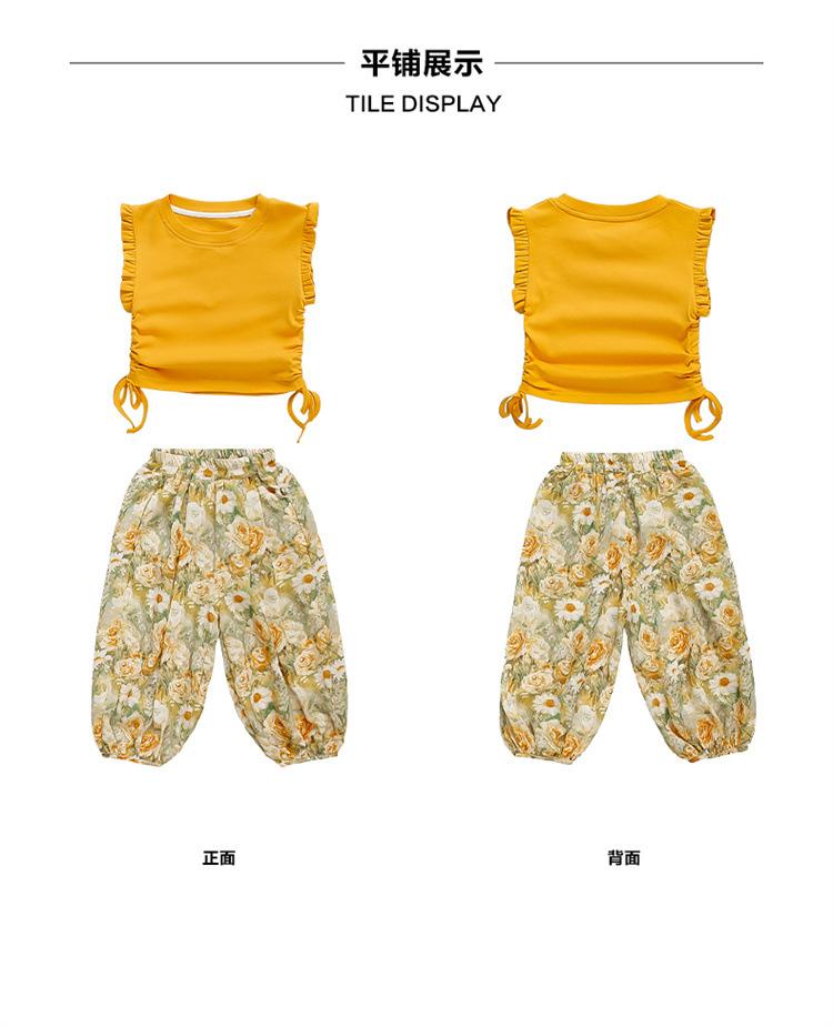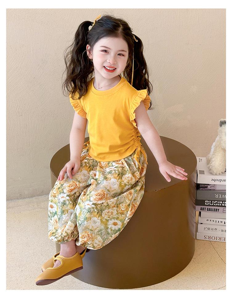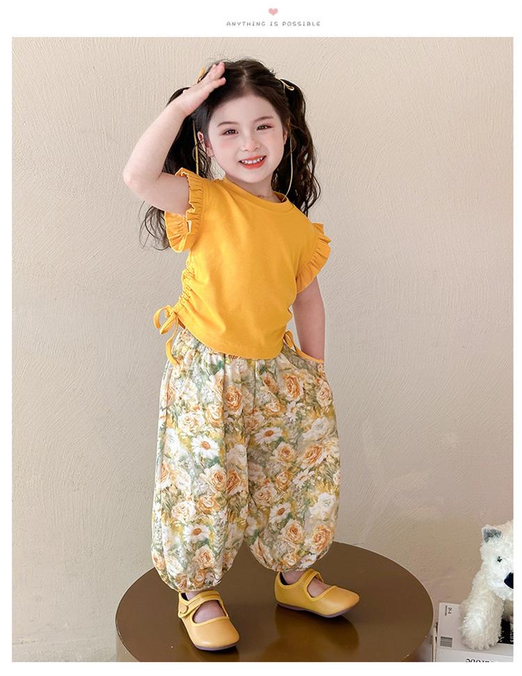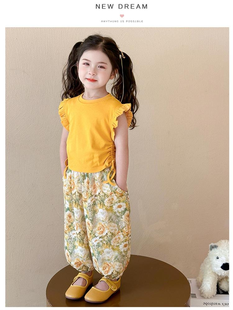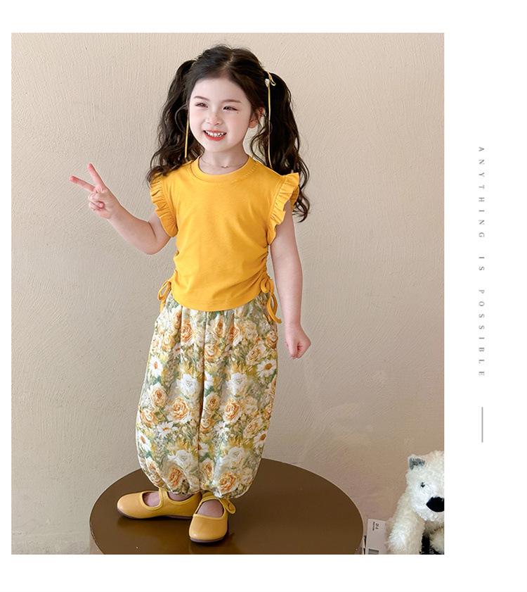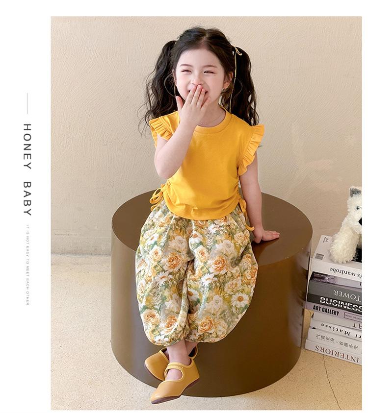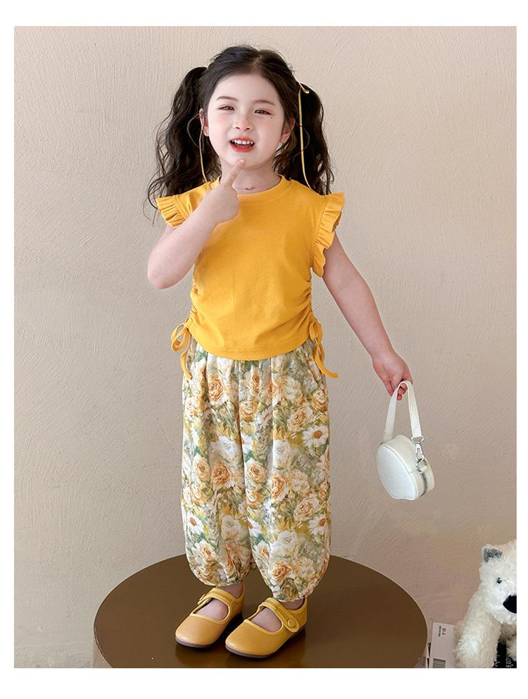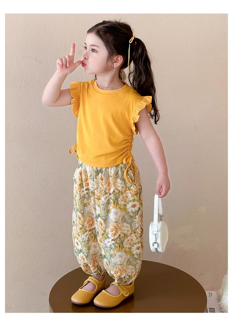 Traje de flores amarillo con cordón para niña 2025 Verano Nueva Moda Niña Elegante Dos piezas Vestido de verano para niños