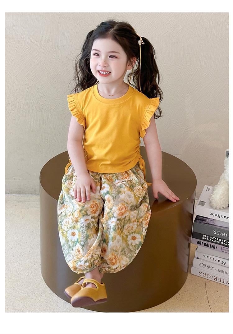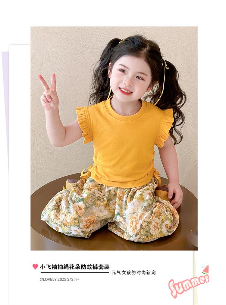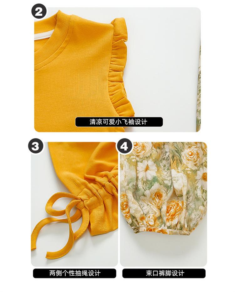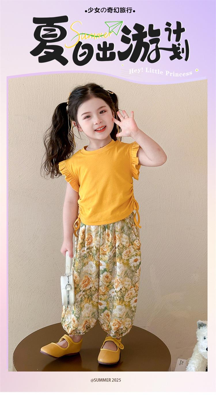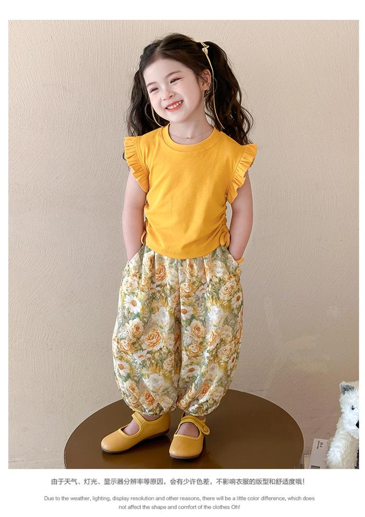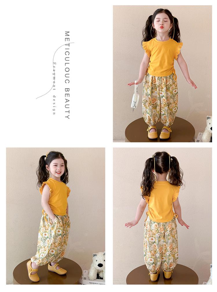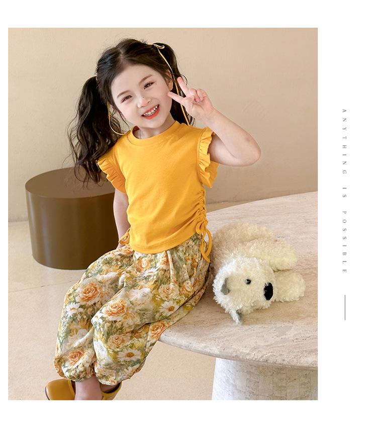 Traje de flores amarillo con cordón para niña 2025 Verano Nueva Moda Niña Elegante Dos piezas Vestido de verano para niños