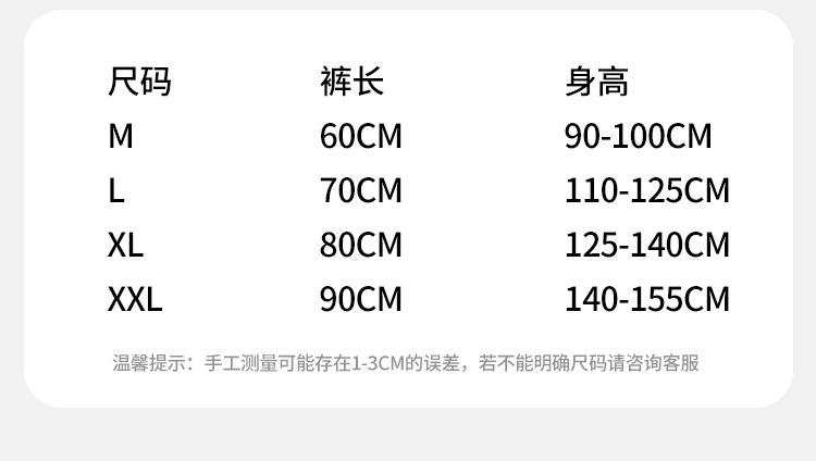 M pants length 60cm, recommended height 90-100cm, L pants length 70cm, recommended height 110-125cm, Xl pants ...