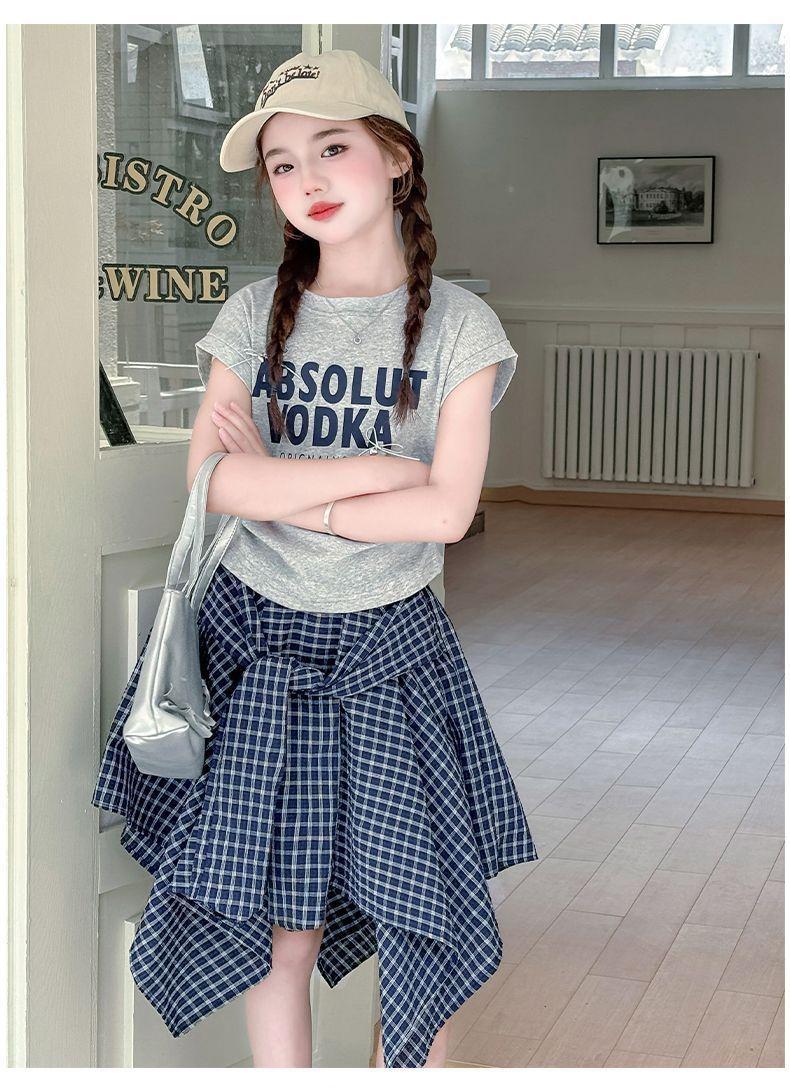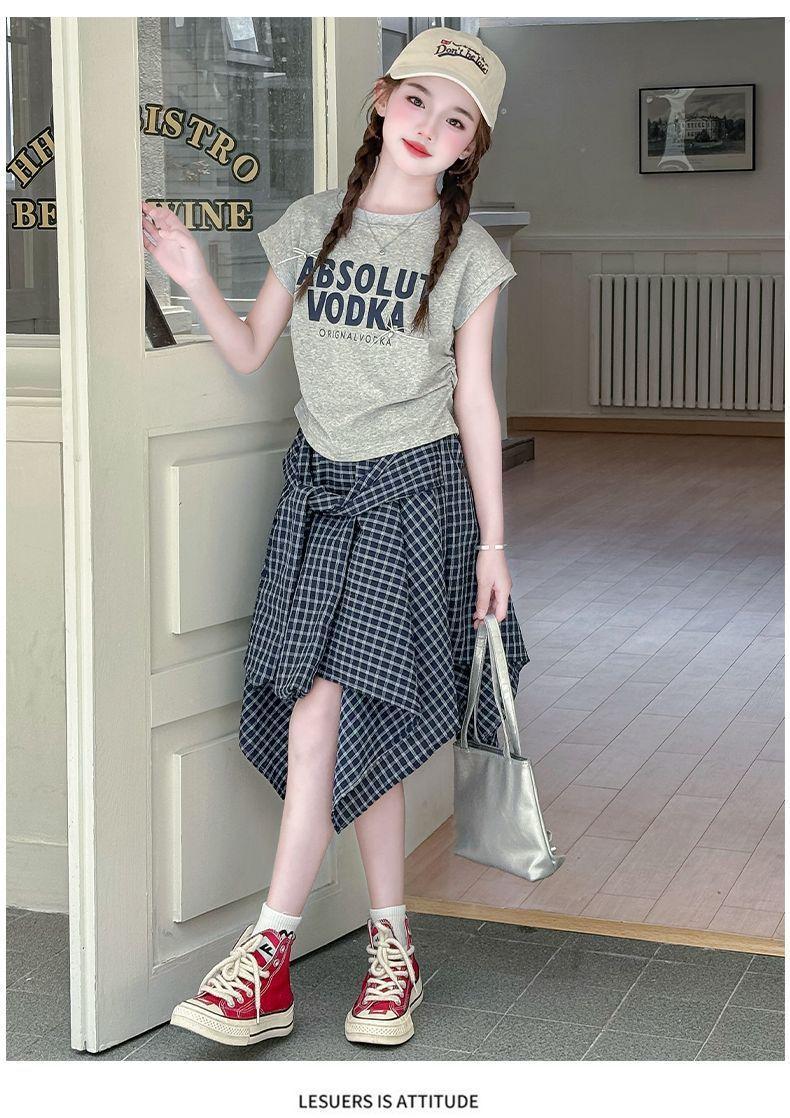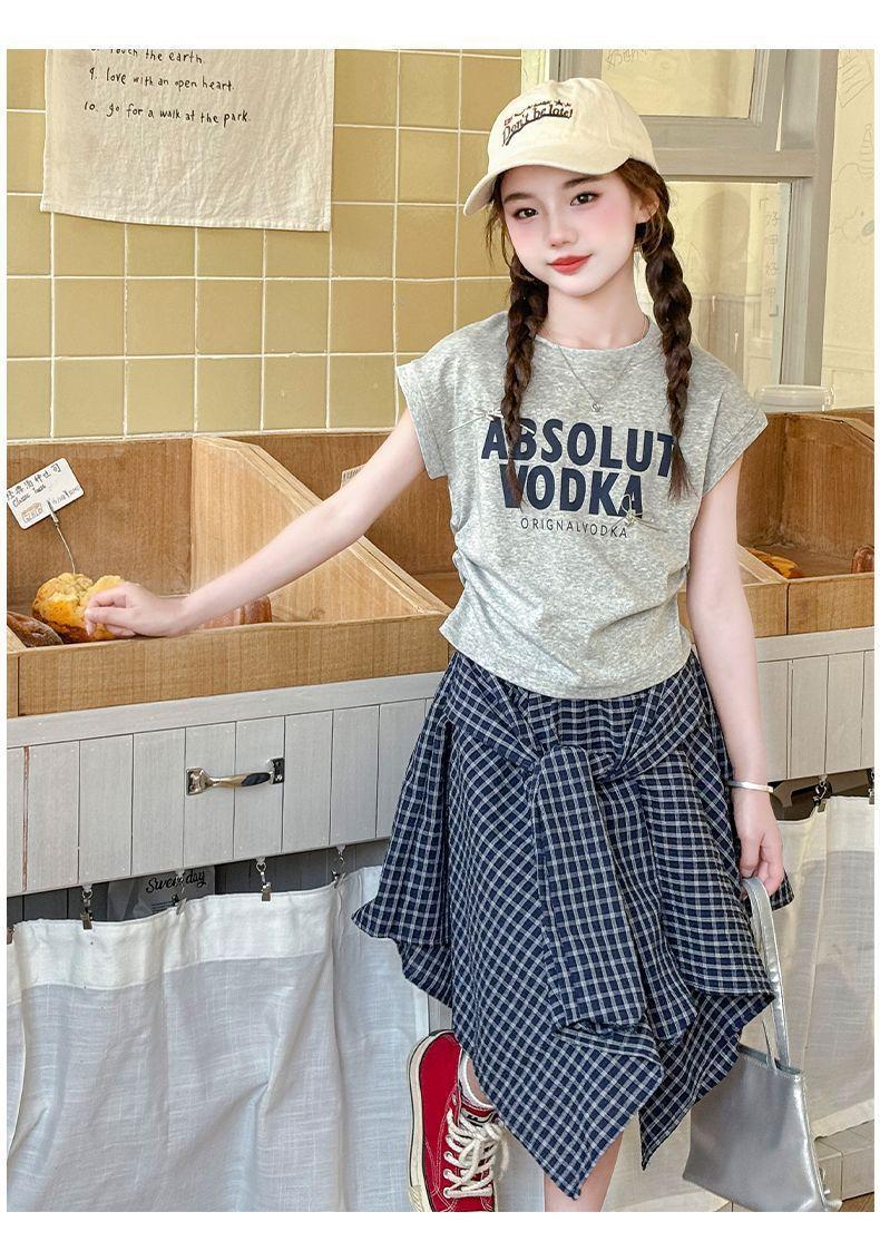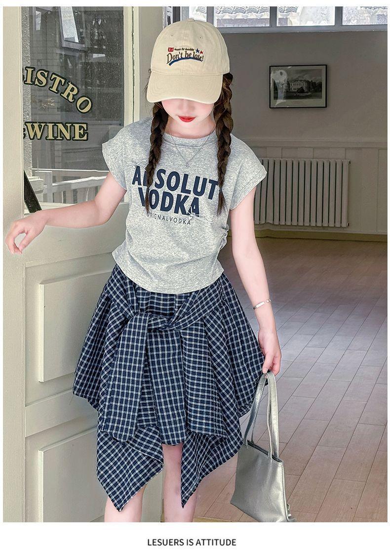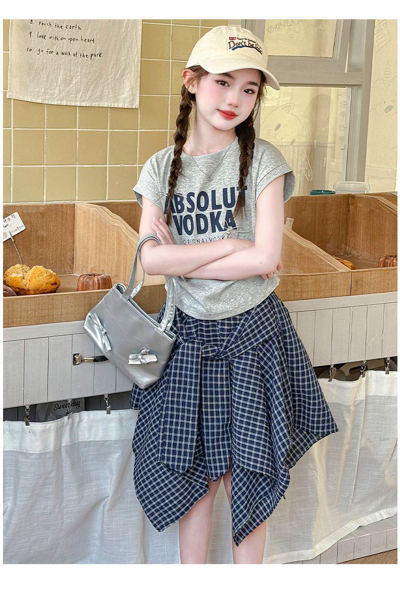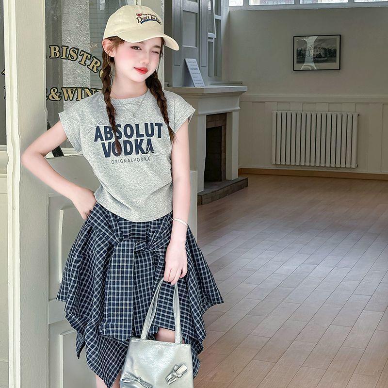 Conjunto de Falda de Verano de Estilo Coreano para Niñas Celebridades de Internet para Niños Mayores Verano Nuevo Estilo Letra Manga Corta Falda a Cuadros Conjunto de Dos Piezas