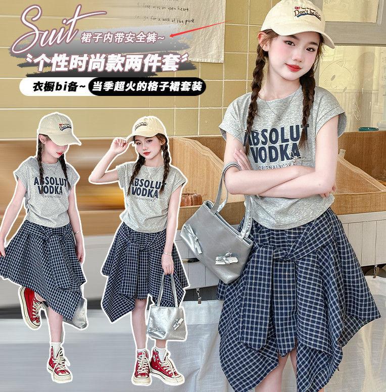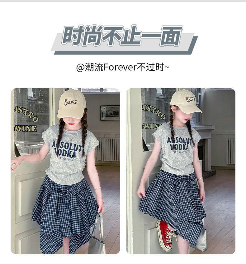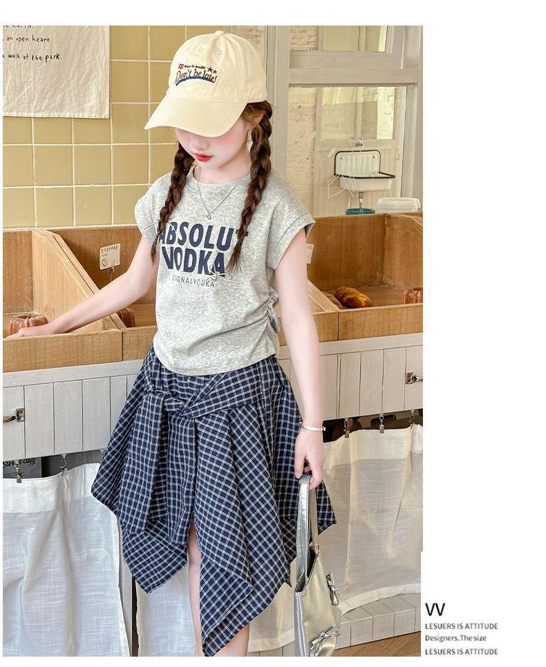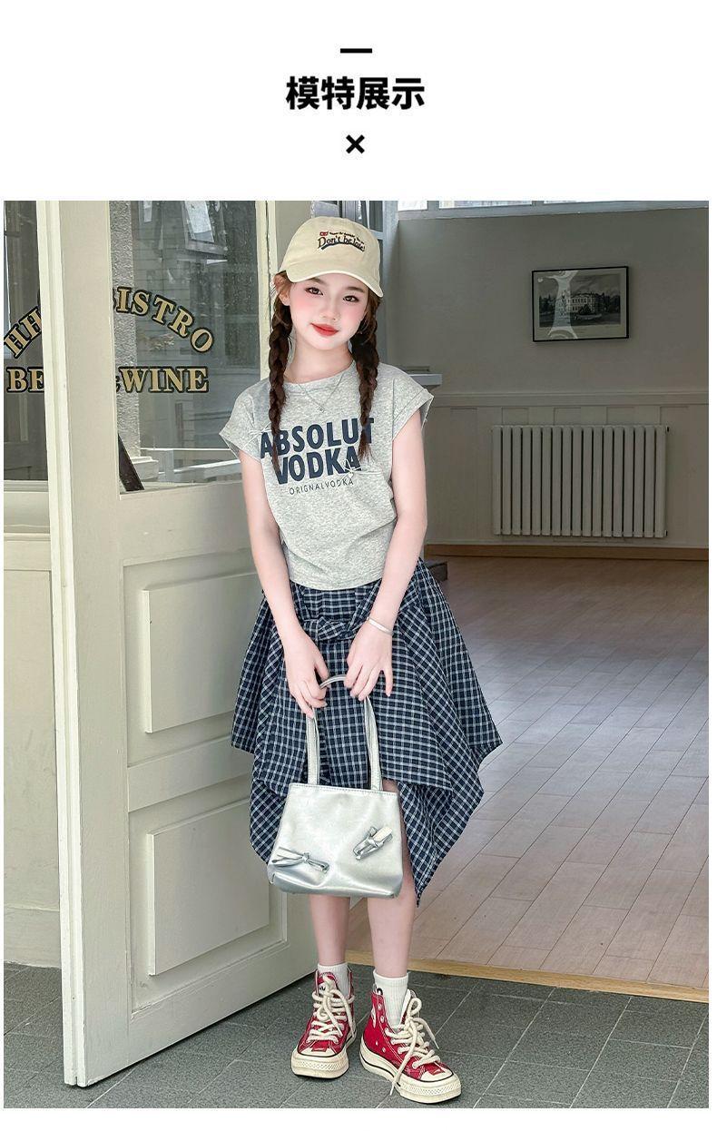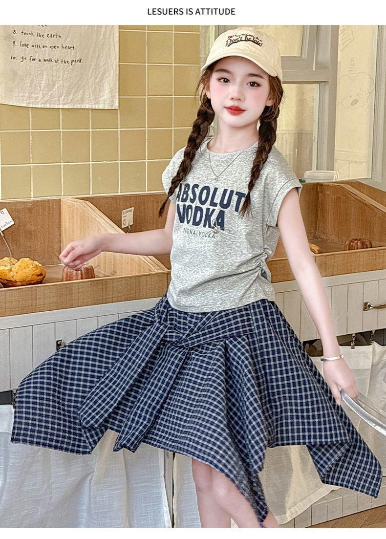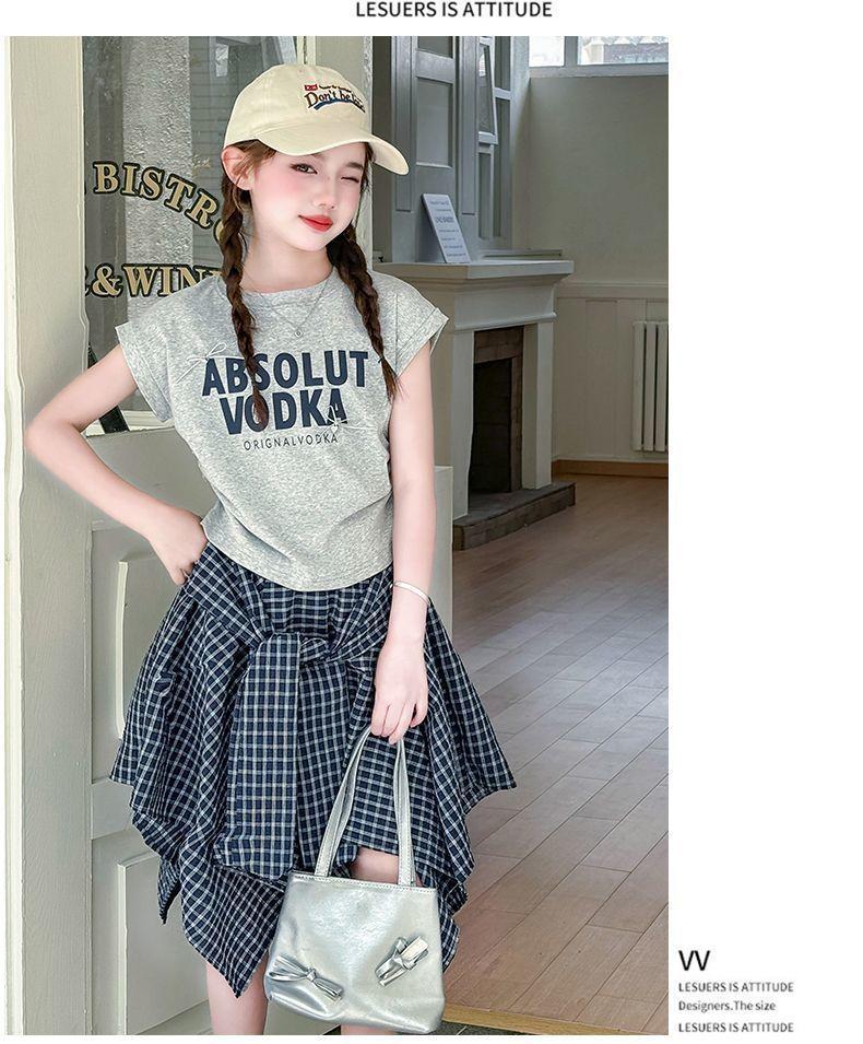 Conjunto de Falda de Verano de Estilo Coreano para Niñas Celebridades de Internet para Niños Mayores Verano Nuevo Estilo Letra Manga Corta Falda a Cuadros Conjunto de Dos Piezas